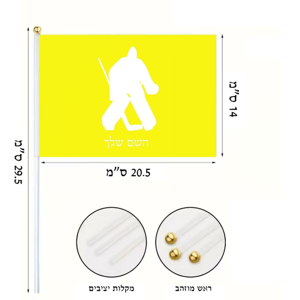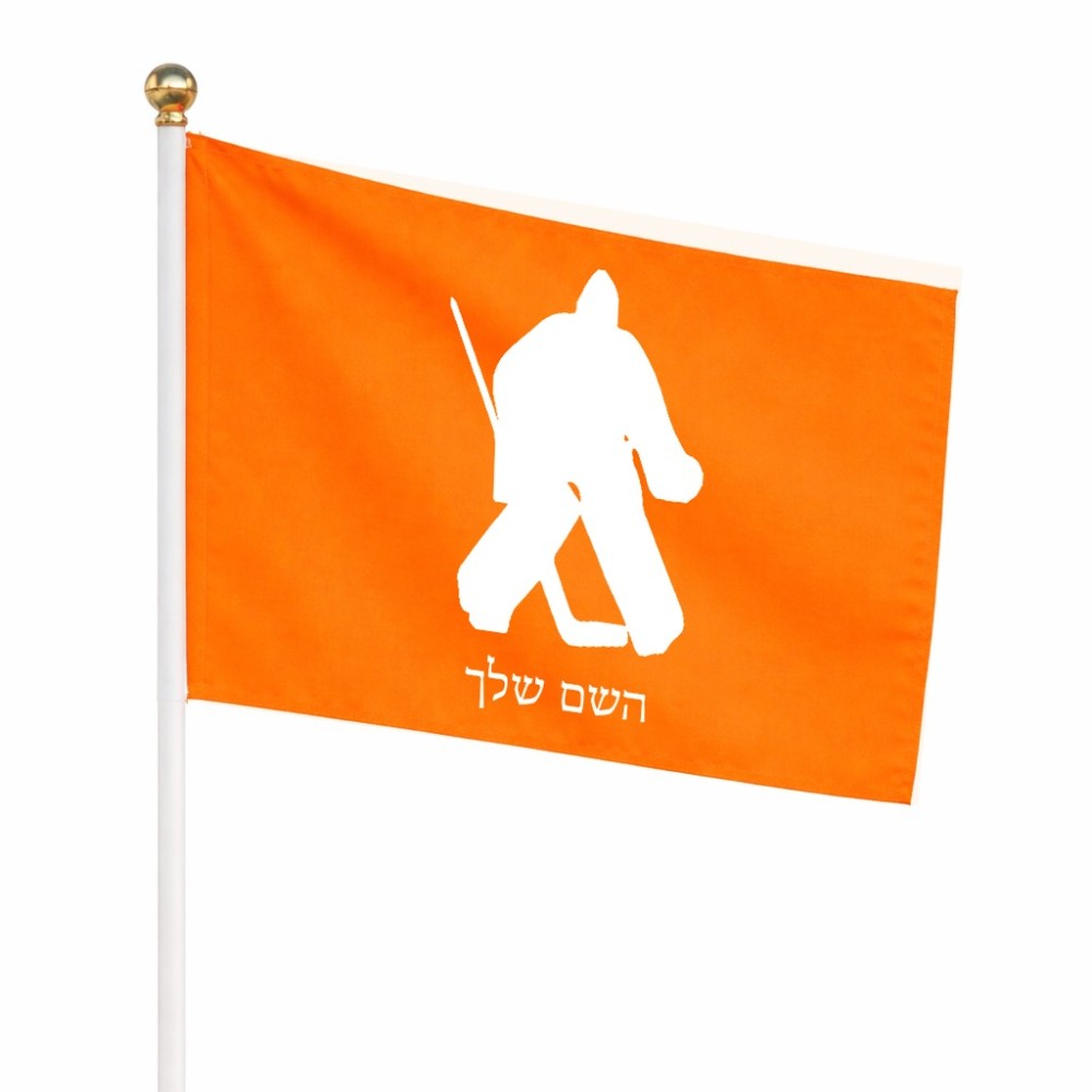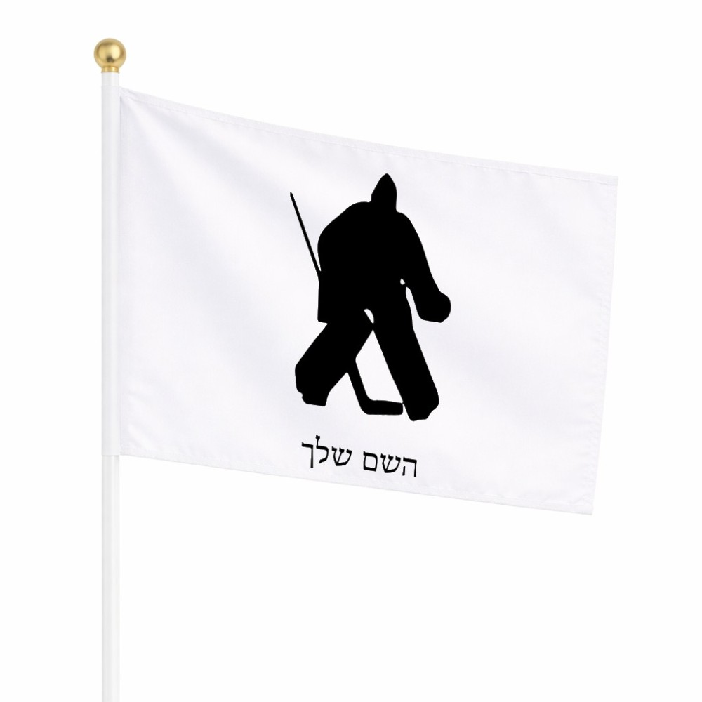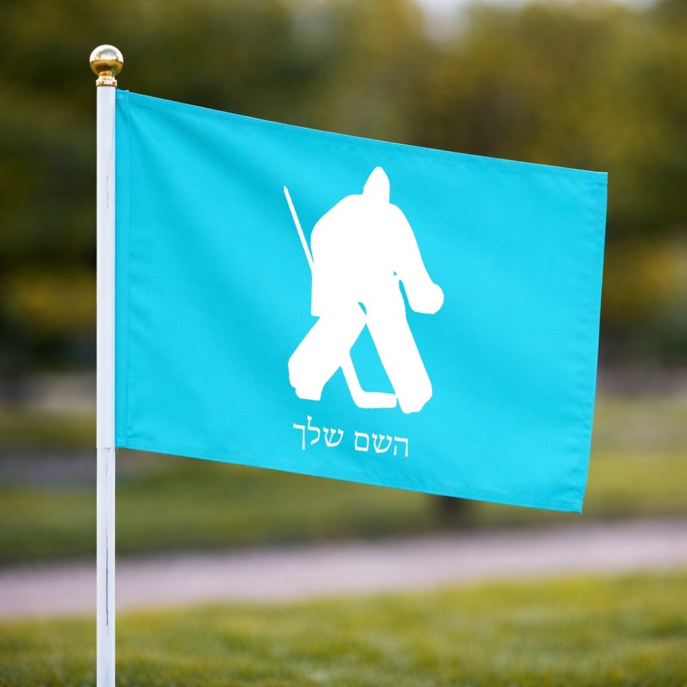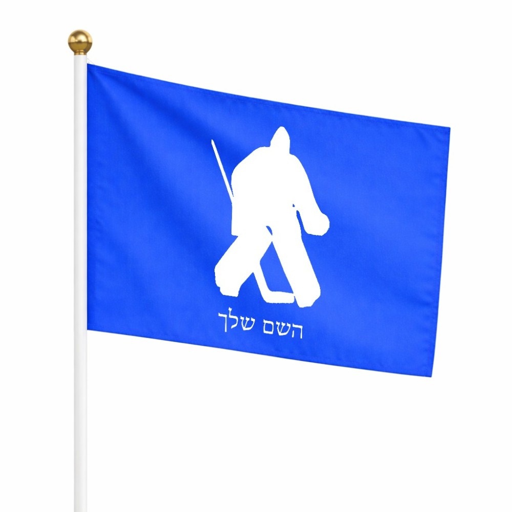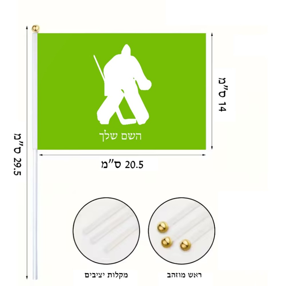 דיגלון בעיצוב אישי עם השם שלך בעיצוב הוקי שוערים גודל הדיגלון 20.5 × 14 ס"מ, ההדפסה מתבצעת בשני צידי הדגל, את השם המבוקש ניתן לציין בהזמנה, אם לא צויין אנחנו ניצור קשר לבירור.