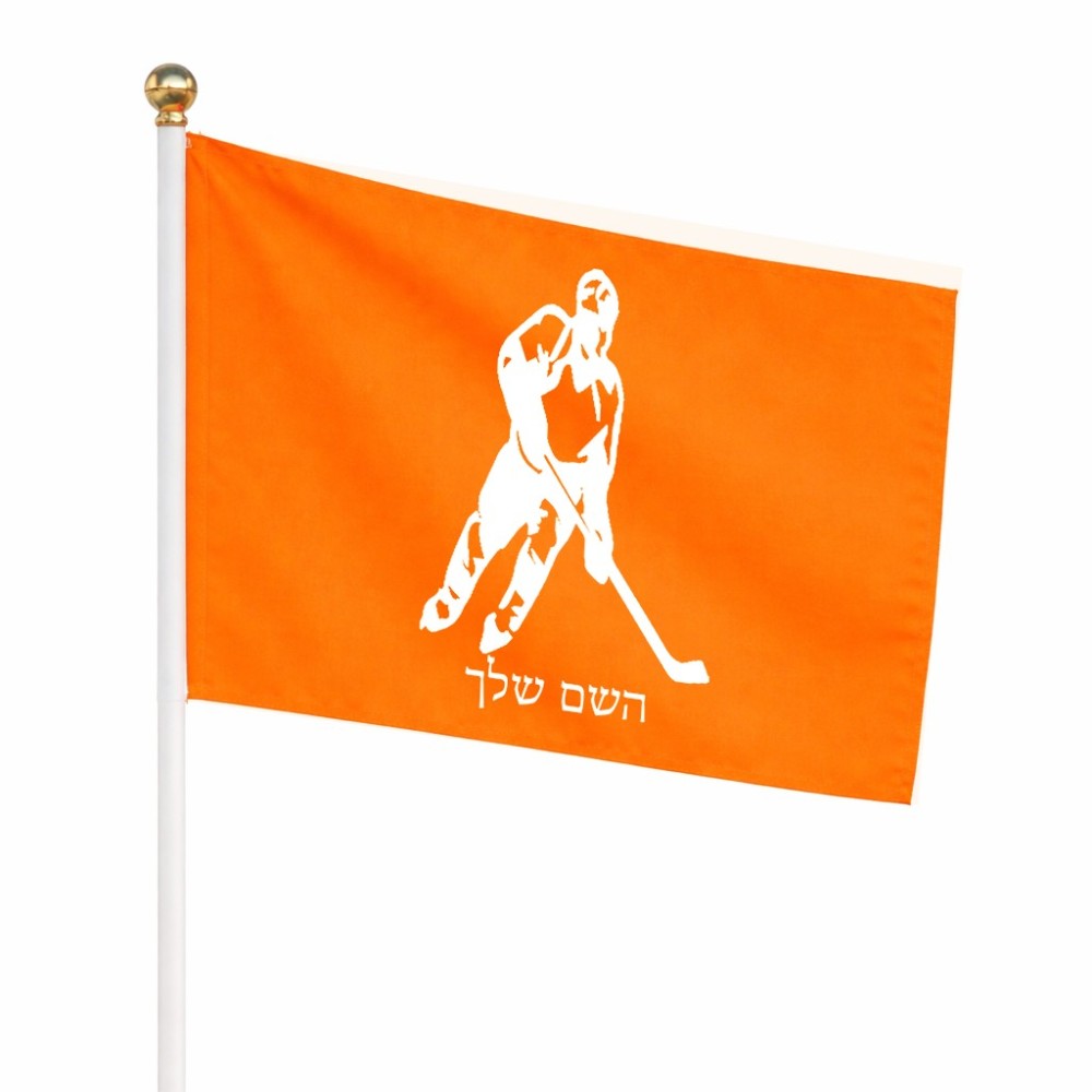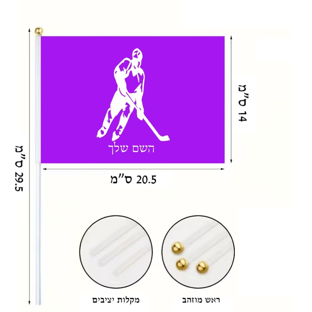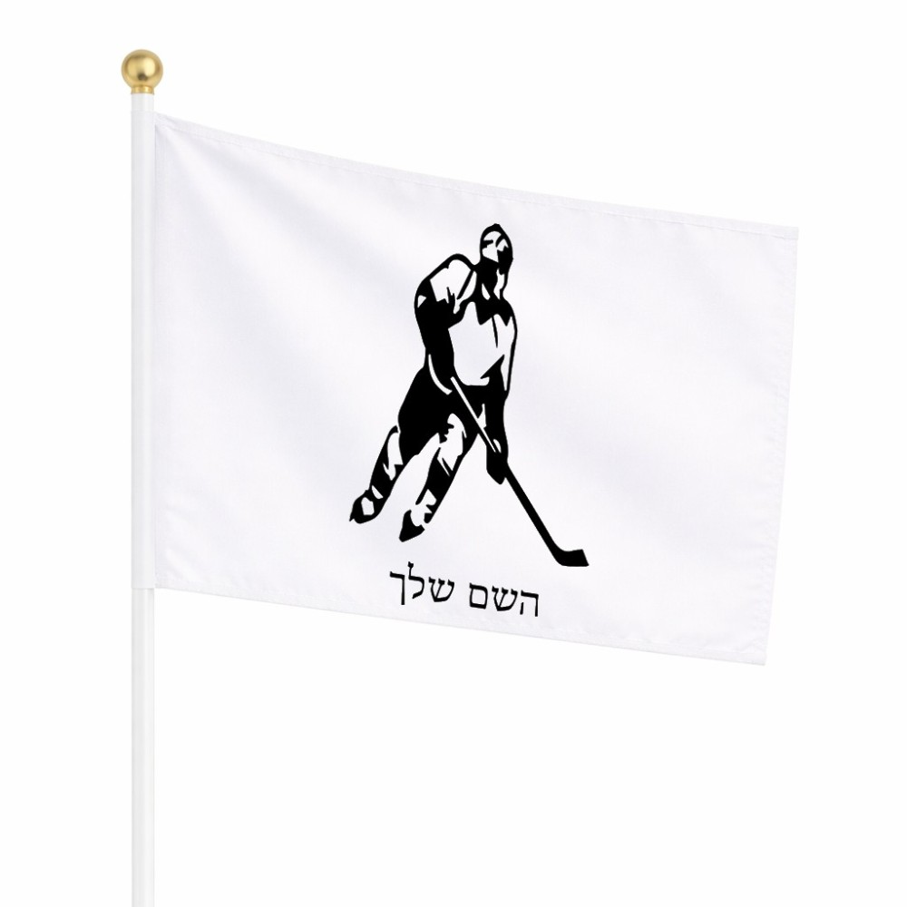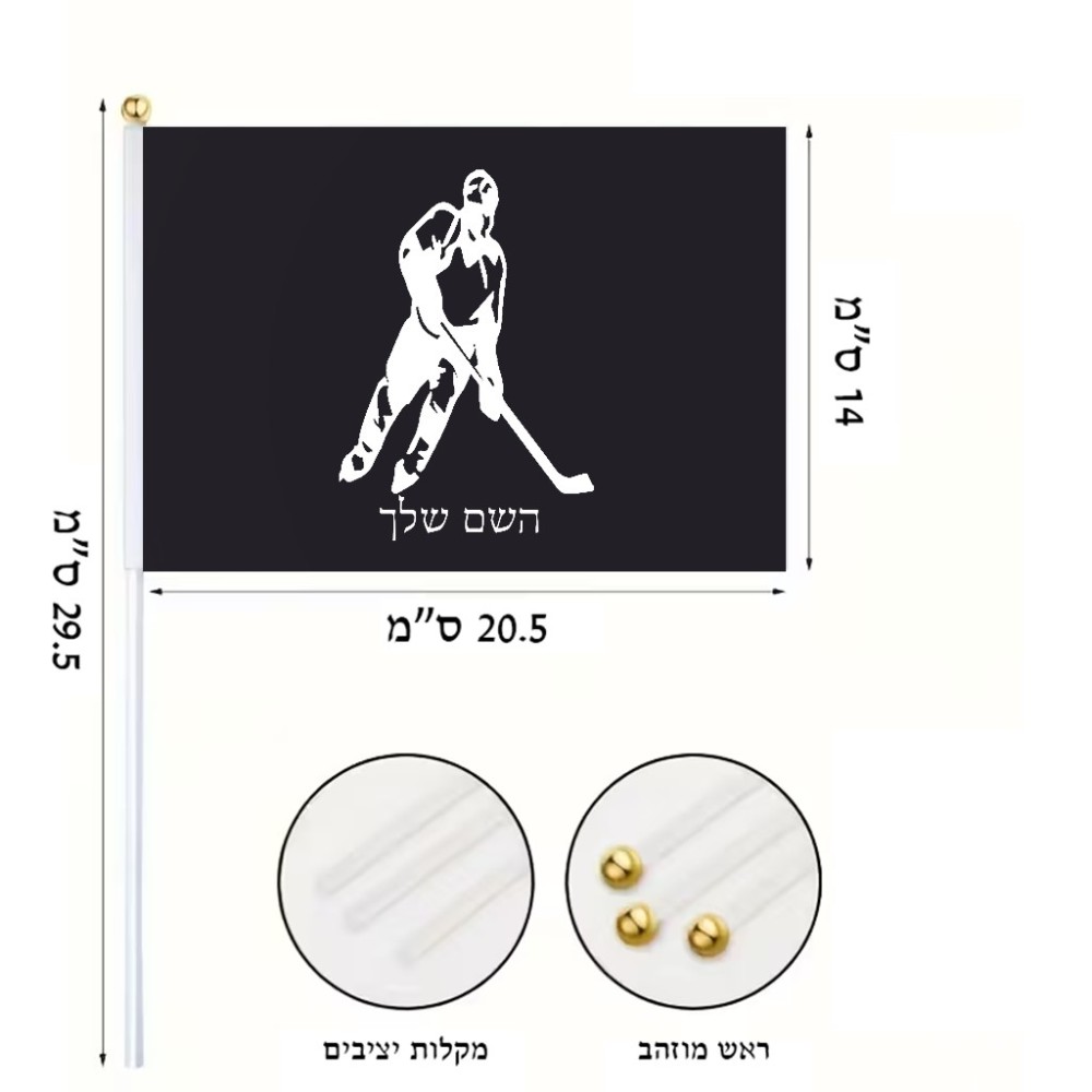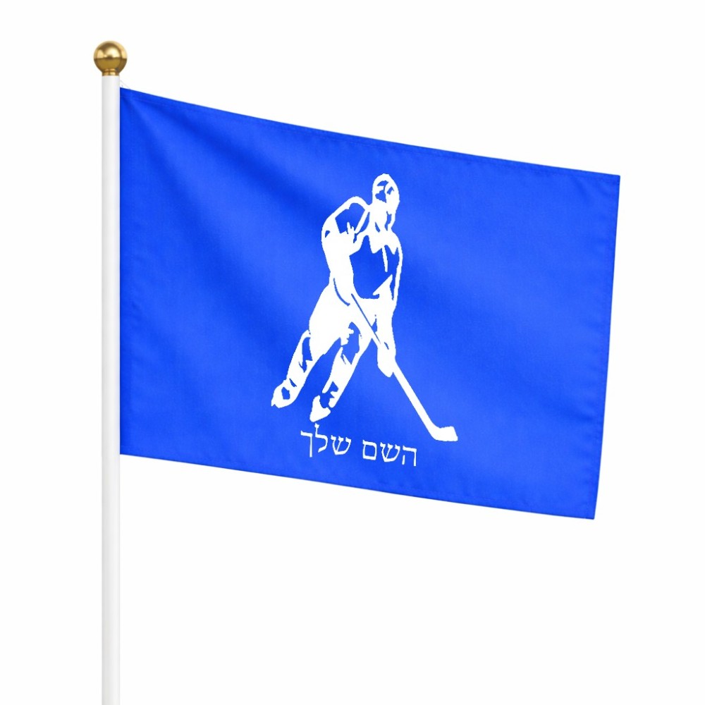 דיגלון בעיצוב אישי עם השם שלך בעיצוב שחקן הוקי גודל הדיגלון 20.5 × 14 ס"מ, ההדפסה מתבצעת בשני צידי הדגל, את השם המבוקש ניתן לציין בהזמנה, אם לא צויין אנחנו ניצור קשר לבירור.