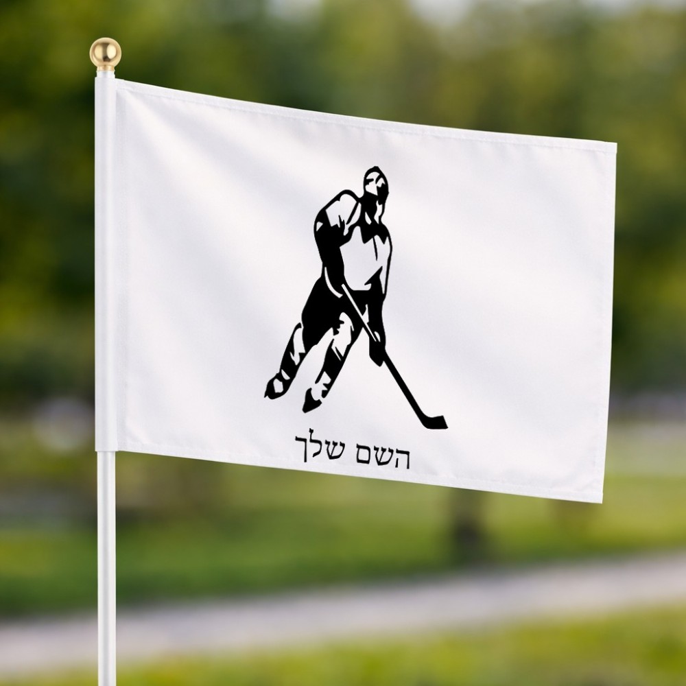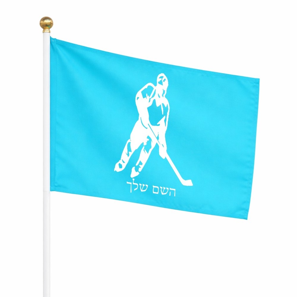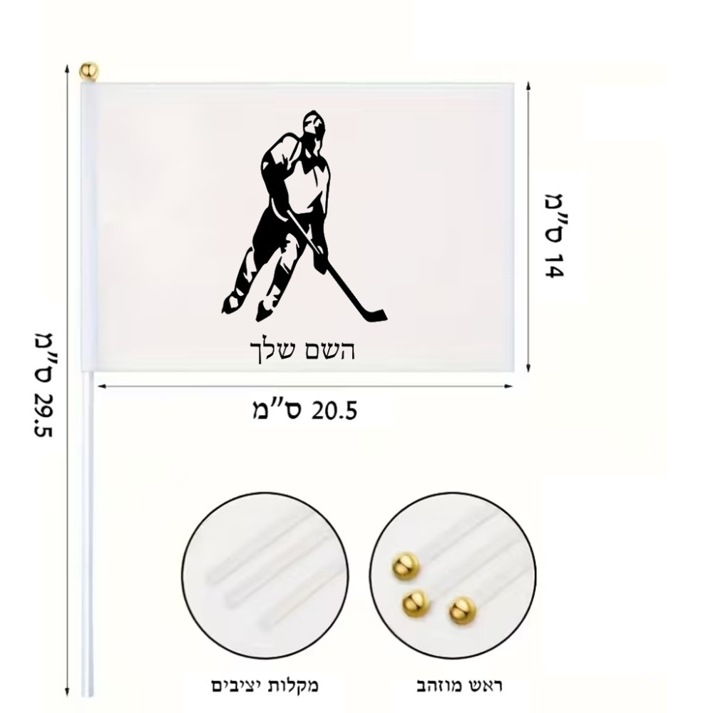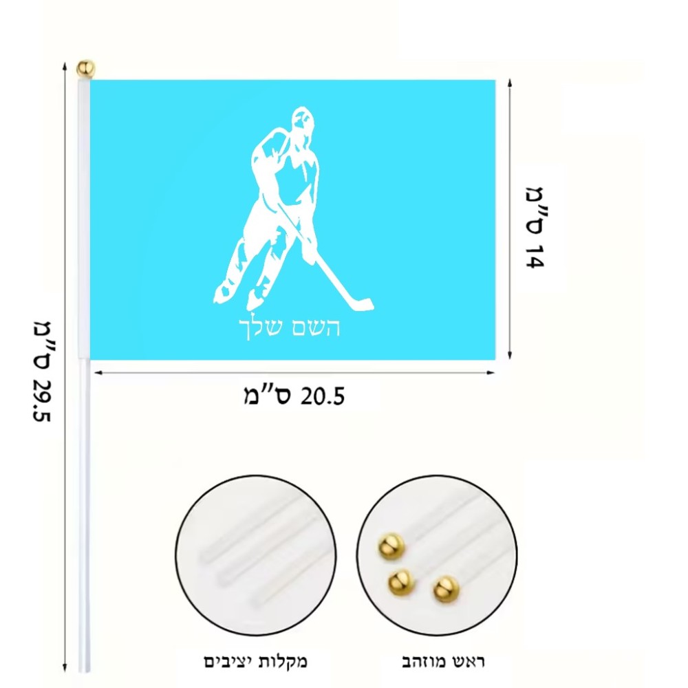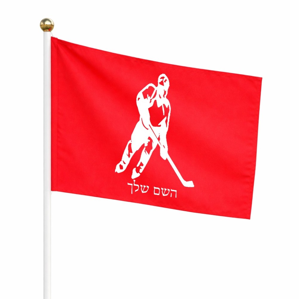 דיגלון בעיצוב אישי עם השם שלך בעיצוב שחקן הוקי גודל הדיגלון 20.5 × 14 ס"מ, ההדפסה מתבצעת בשני צידי הדגל, את השם המבוקש ניתן לציין בהזמנה, אם לא צויין אנחנו ניצור קשר לבירור.