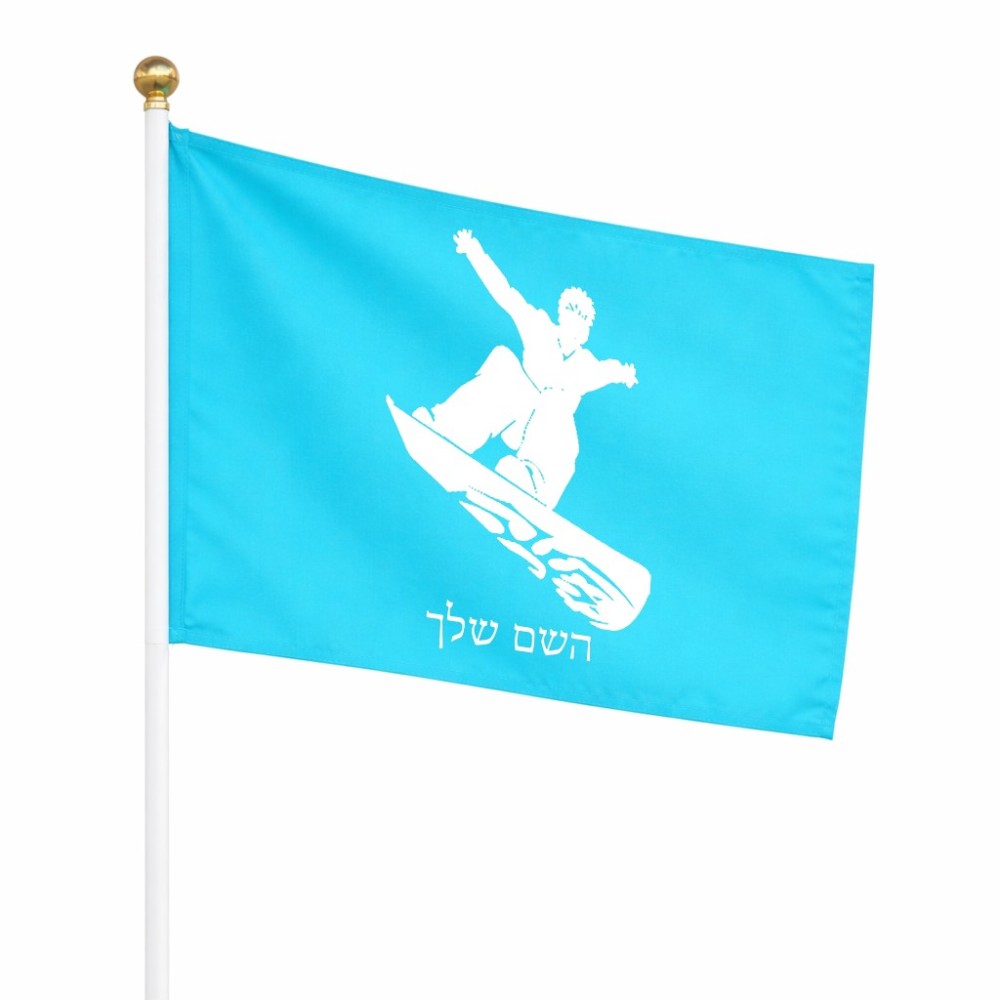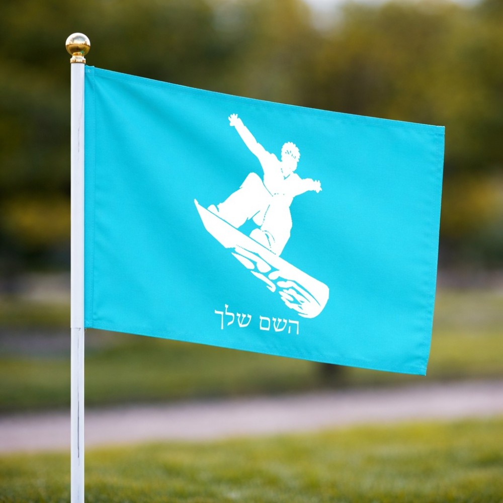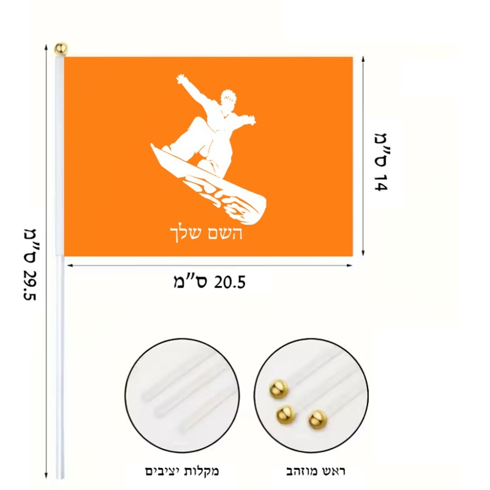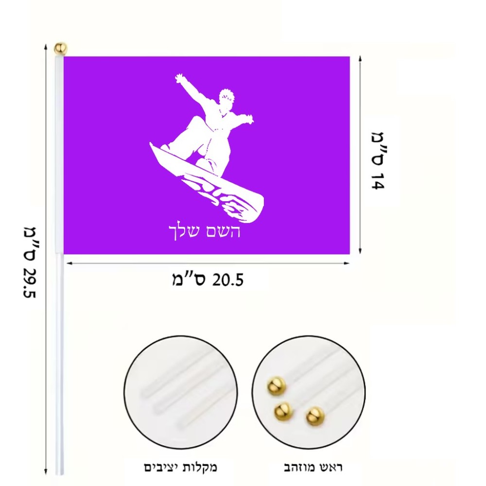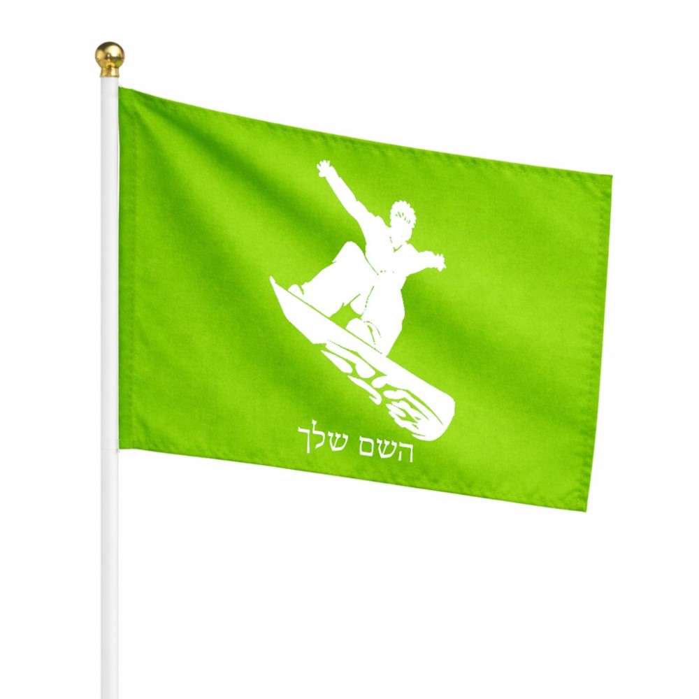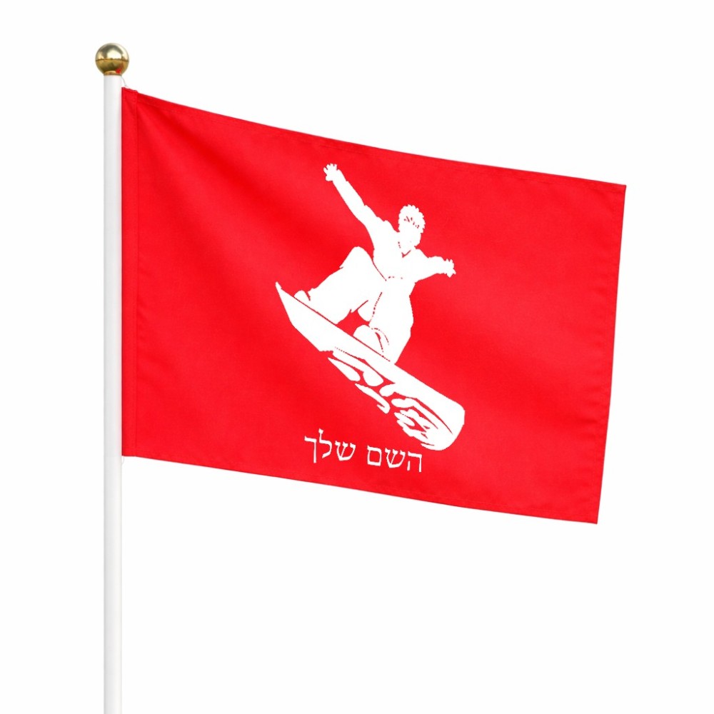 דיגלון בעיצוב אישי עם השם שלך בעיצוב סנובורדיסט גודל הדיגלון 20.5 × 14 ס"מ, ההדפסה מתבצעת בשני צידי הדגל, את השם המבוקש ניתן לציין בהזמנה, אם לא צויין אנחנו ניצור קשר לבירור.