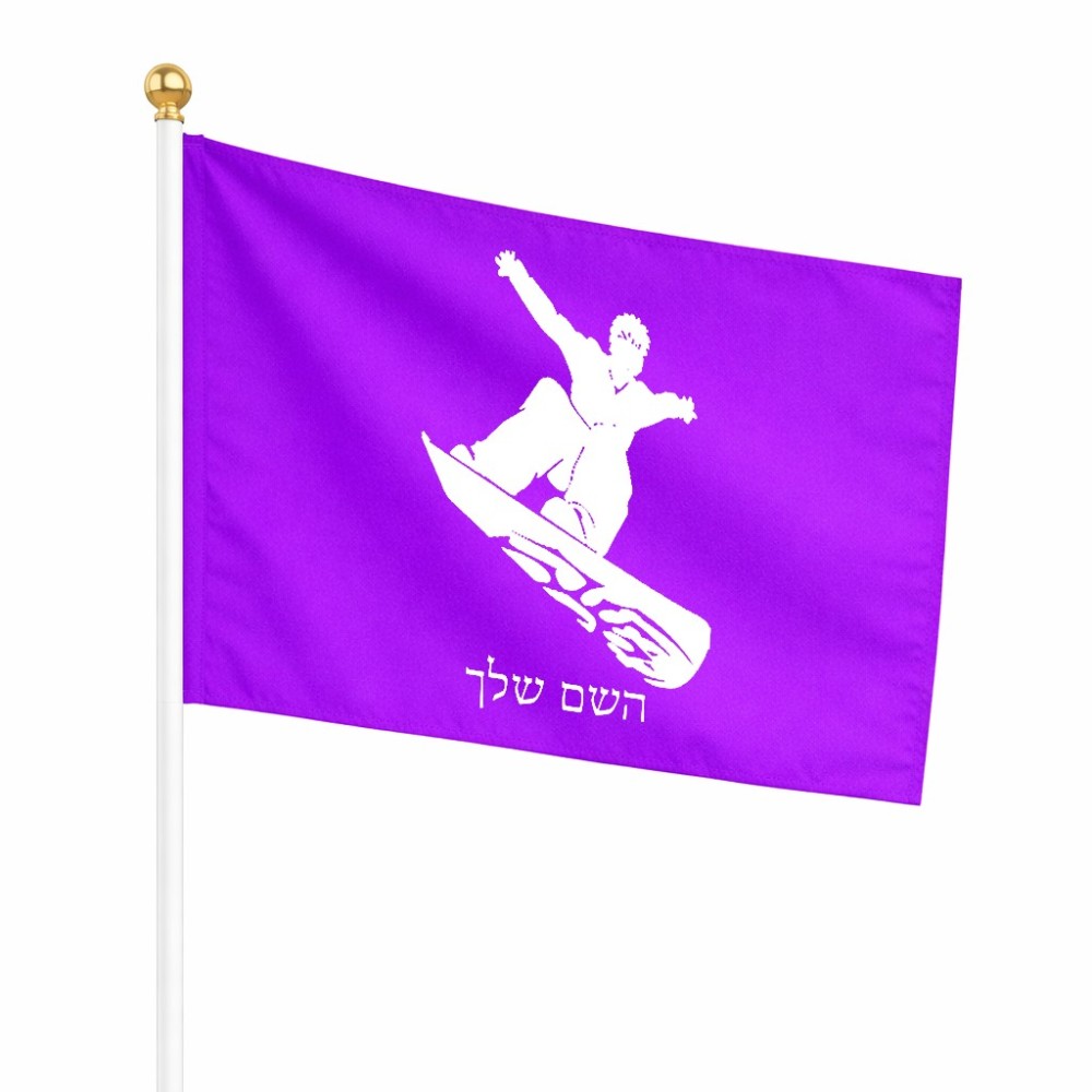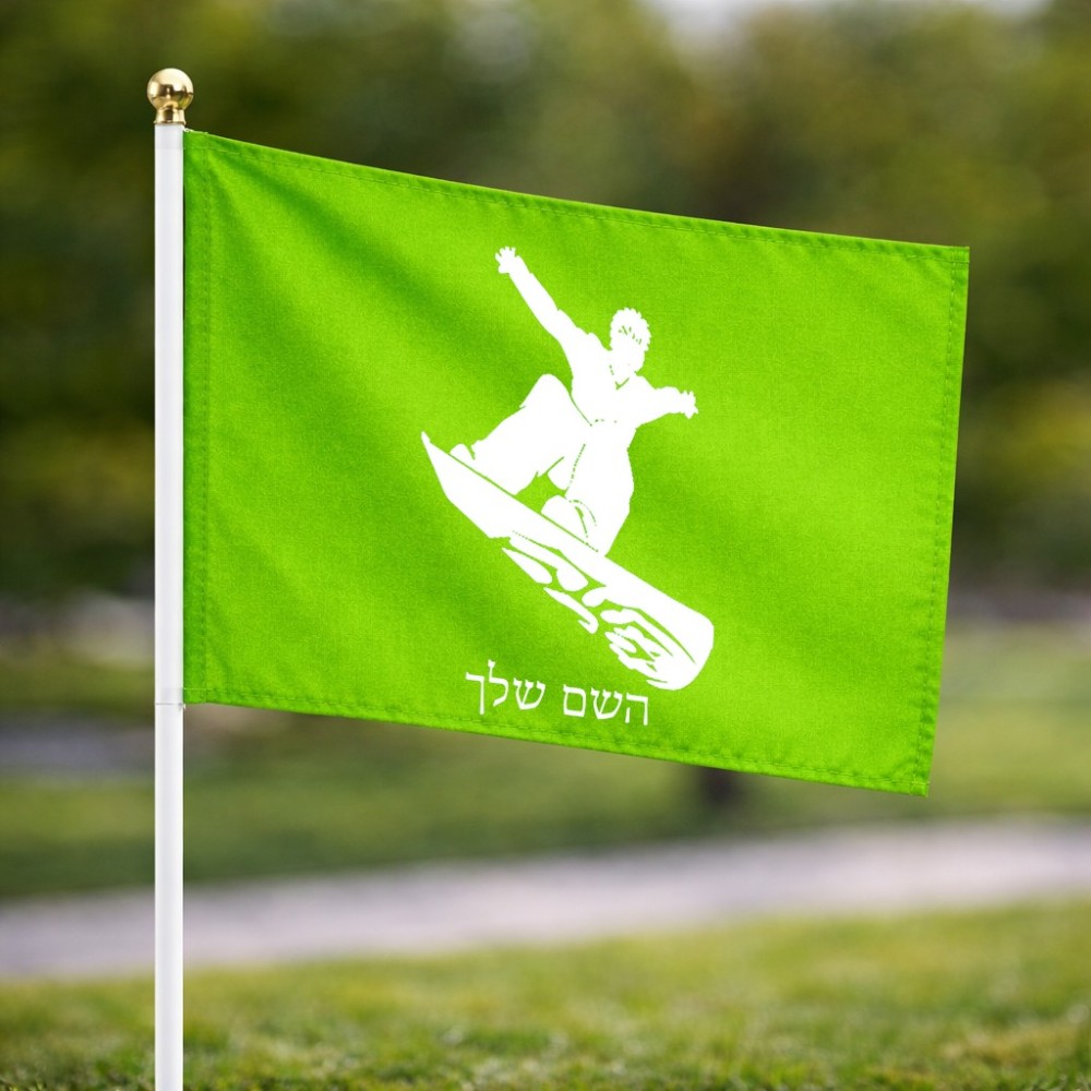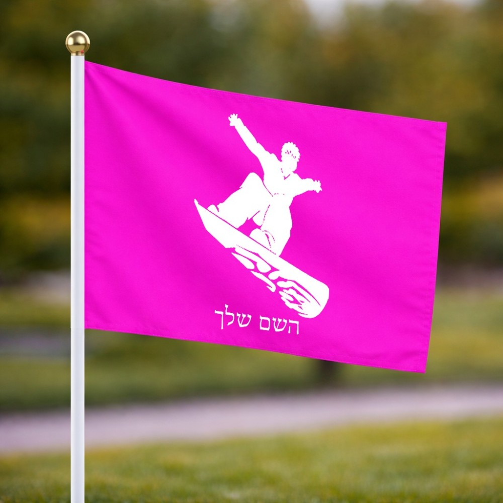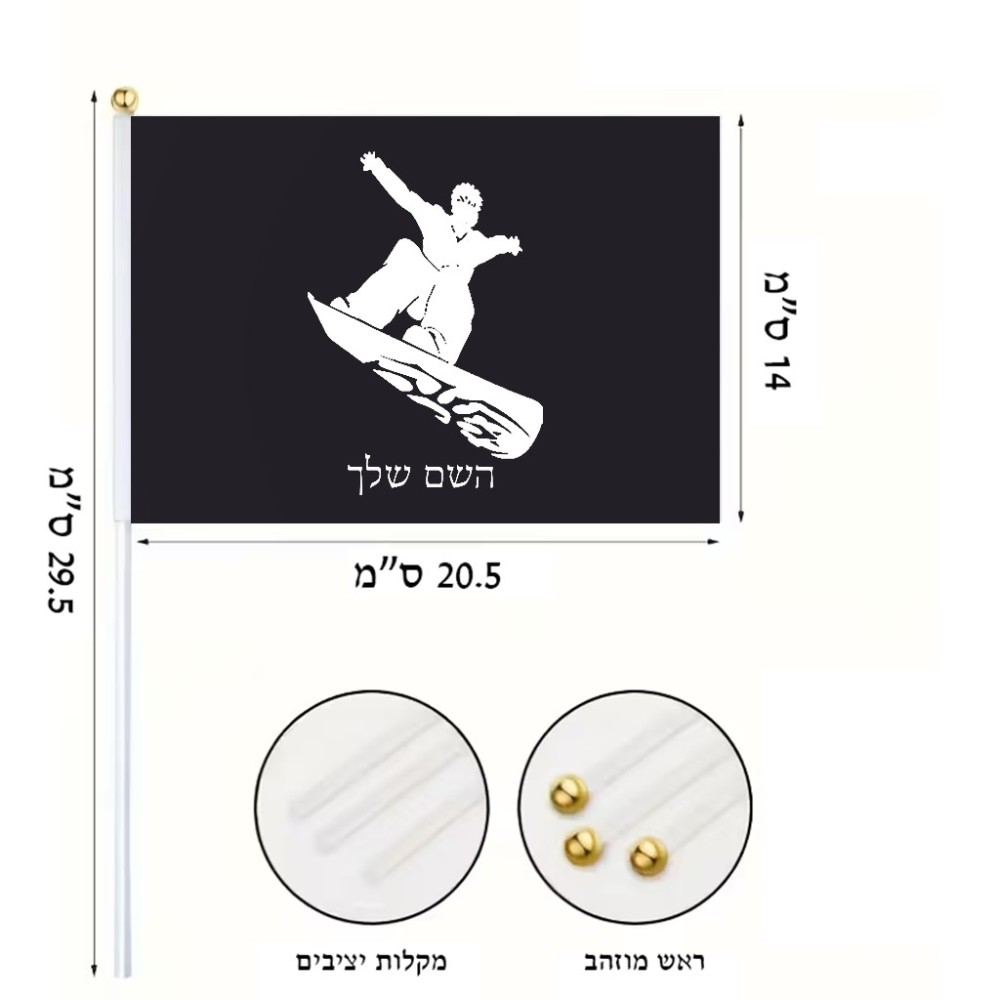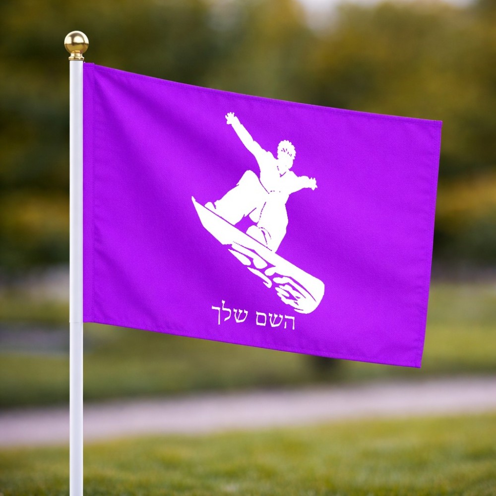 דיגלון בעיצוב אישי עם השם שלך בעיצוב סנובורדיסט גודל הדיגלון 20.5 × 14 ס"מ, ההדפסה מתבצעת בשני צידי הדגל, את השם המבוקש ניתן לציין בהזמנה, אם לא צויין אנחנו ניצור קשר לבירור.