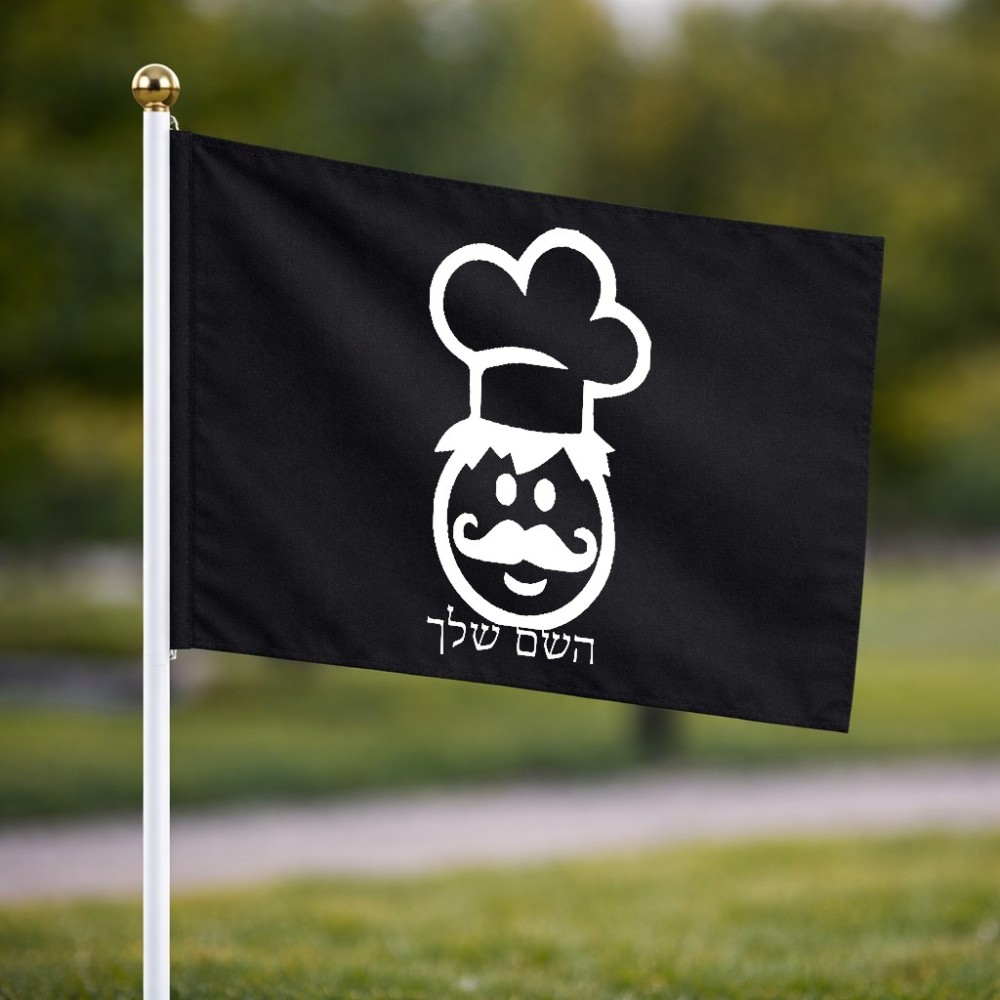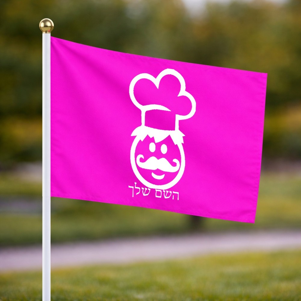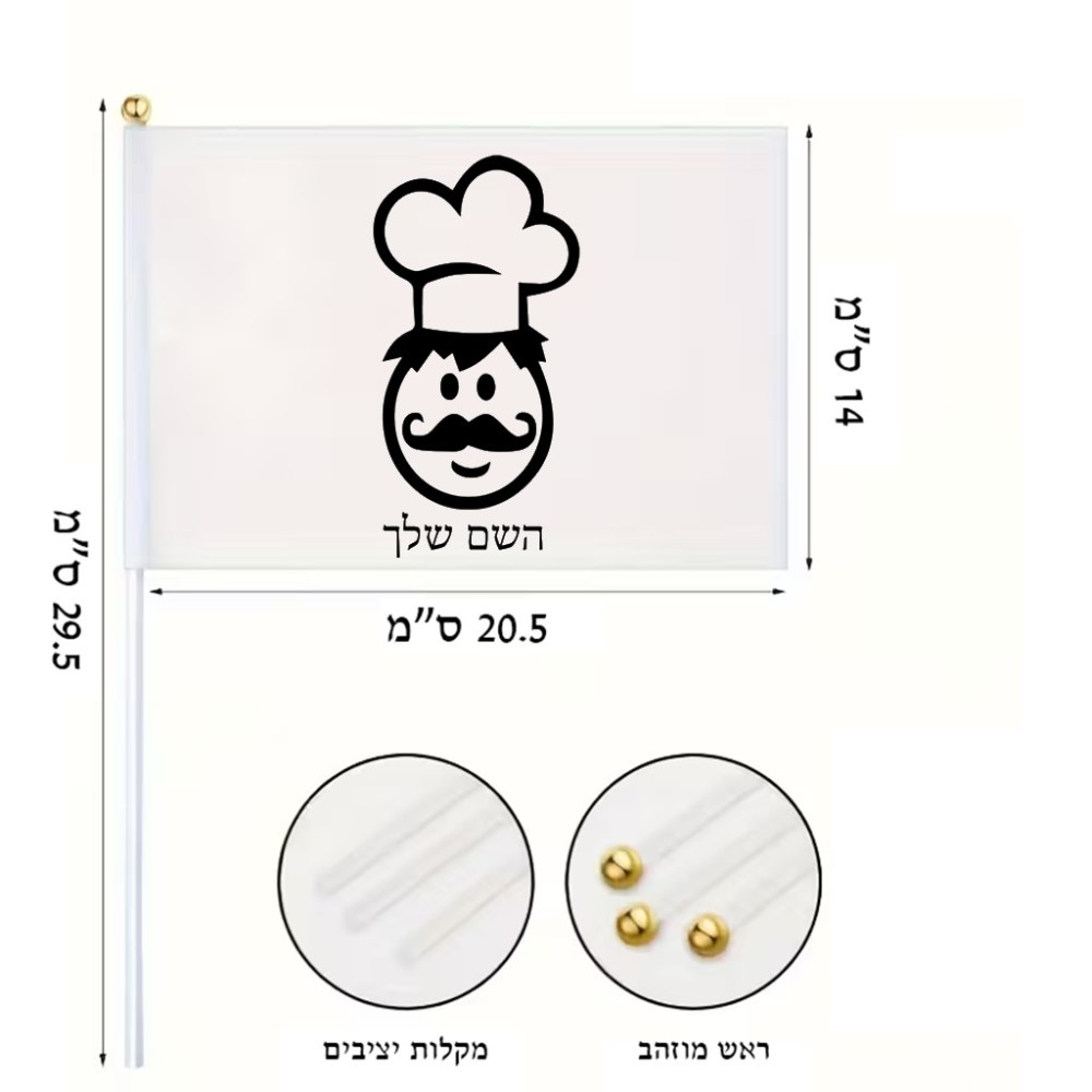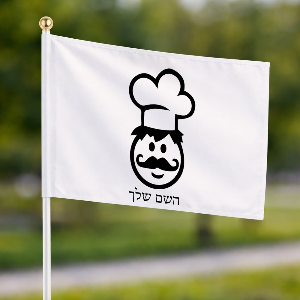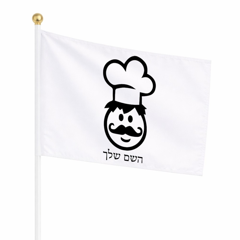 דיגלון בעיצוב אישי עם השם שלך בעיצוב שף גודל הדיגלון 20.5 × 14 ס"מ, ההדפסה מתבצעת בשני צידי הדגל, את השם המבוקש ניתן לציין בהזמנה, אם לא צויין אנחנו ניצור קשר לבירור.