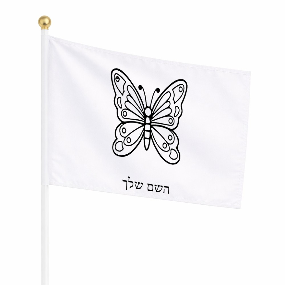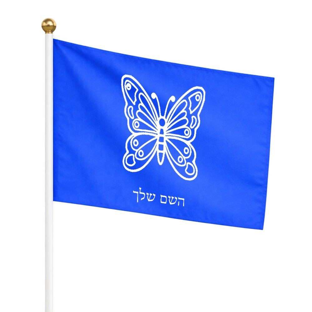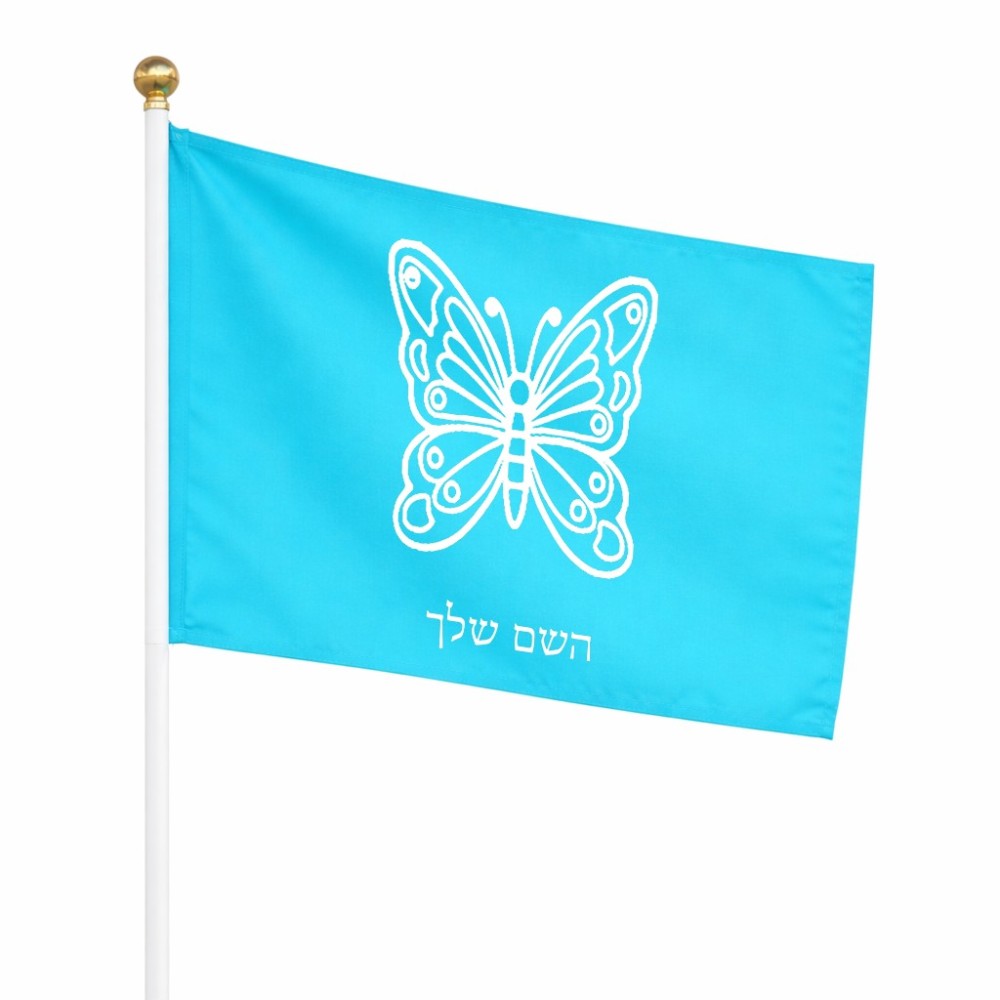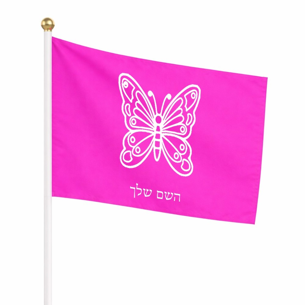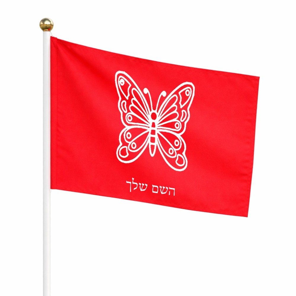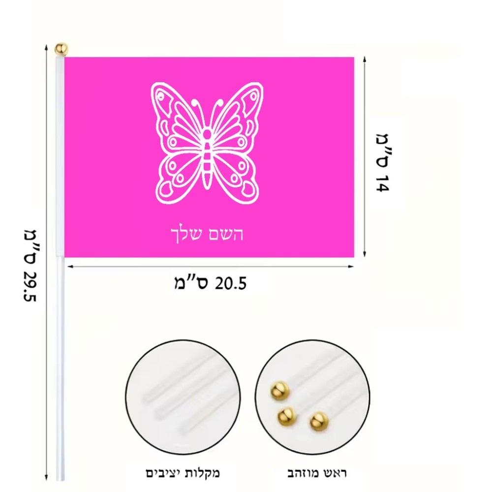 דיגלון בעיצוב אישי עם השם שלך בעיצוב פרפר גודל הדיגלון 20.5 × 14 ס"מ, ההדפסה מתבצעת בשני צידי הדגל, את השם המבוקש ניתן לציין בהזמנה, אם לא צויין אנחנו ניצור קשר לבירור.