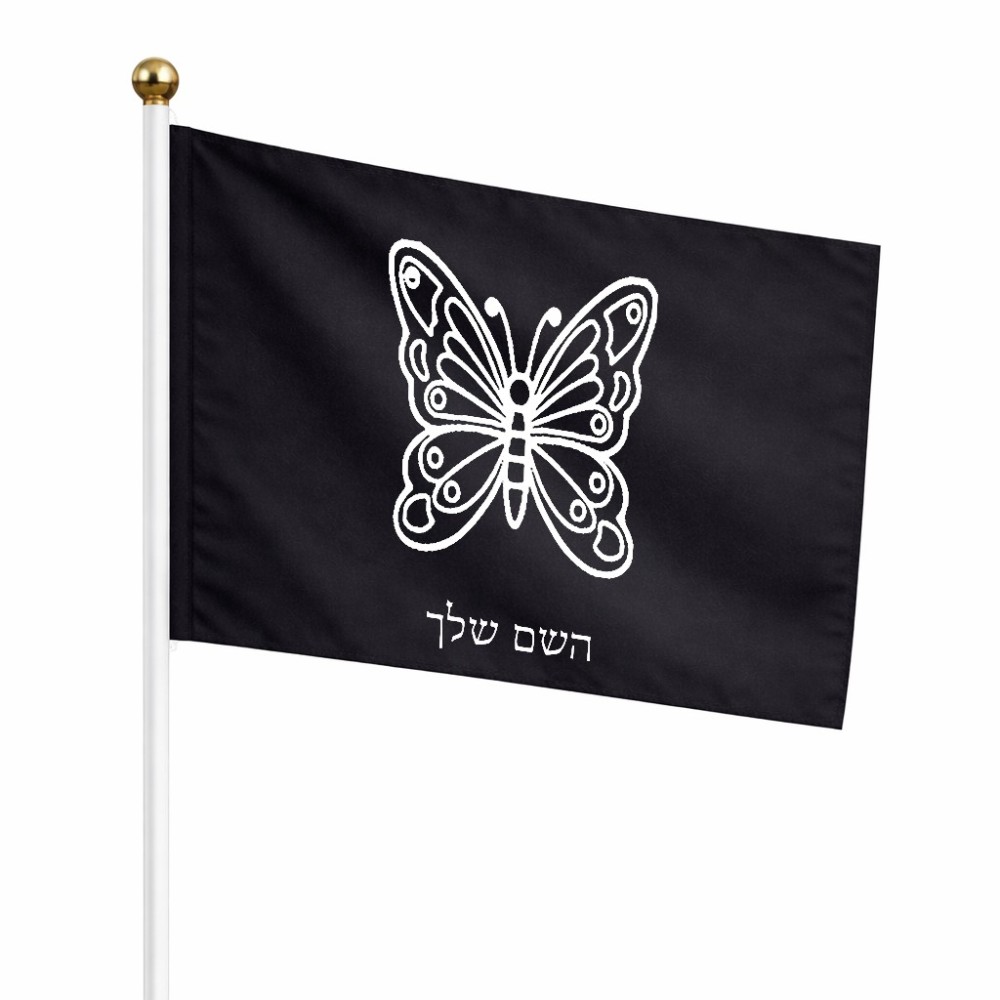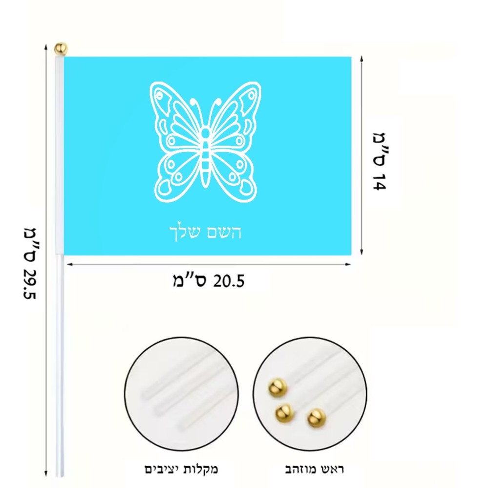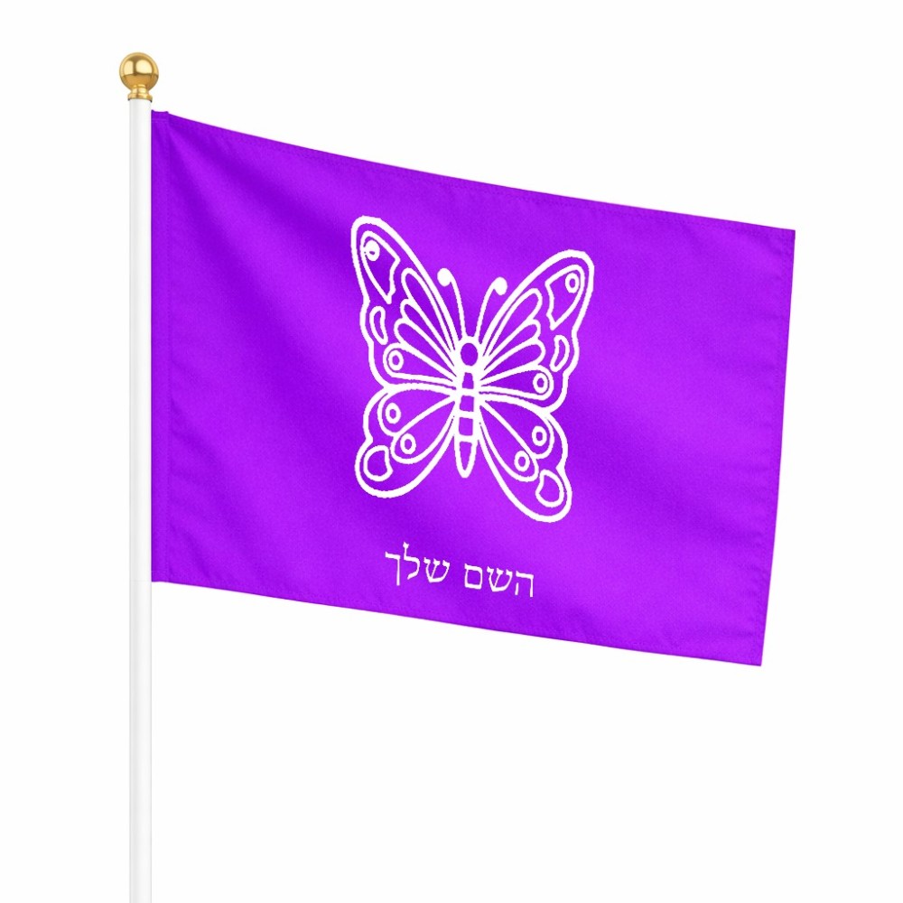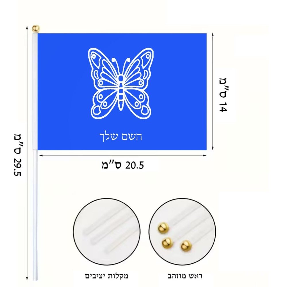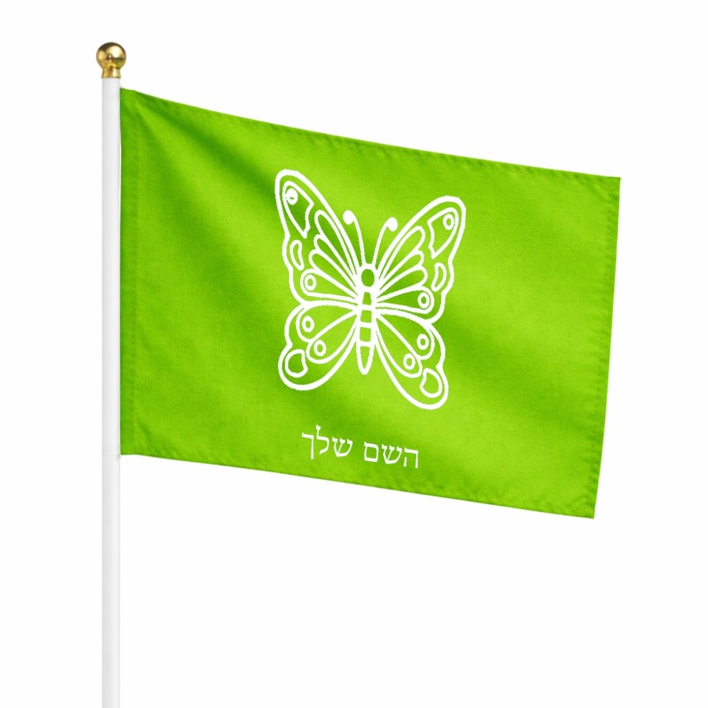 דיגלון בעיצוב אישי עם השם שלך בעיצוב פרפר גודל הדיגלון 20.5 × 14 ס"מ, ההדפסה מתבצעת בשני צידי הדגל, את השם המבוקש ניתן לציין בהזמנה, אם לא צויין אנחנו ניצור קשר לבירור.