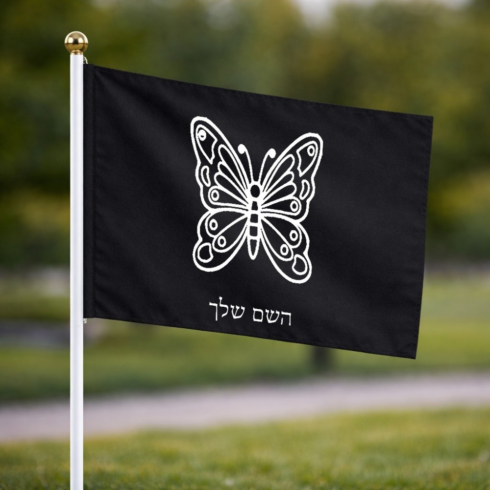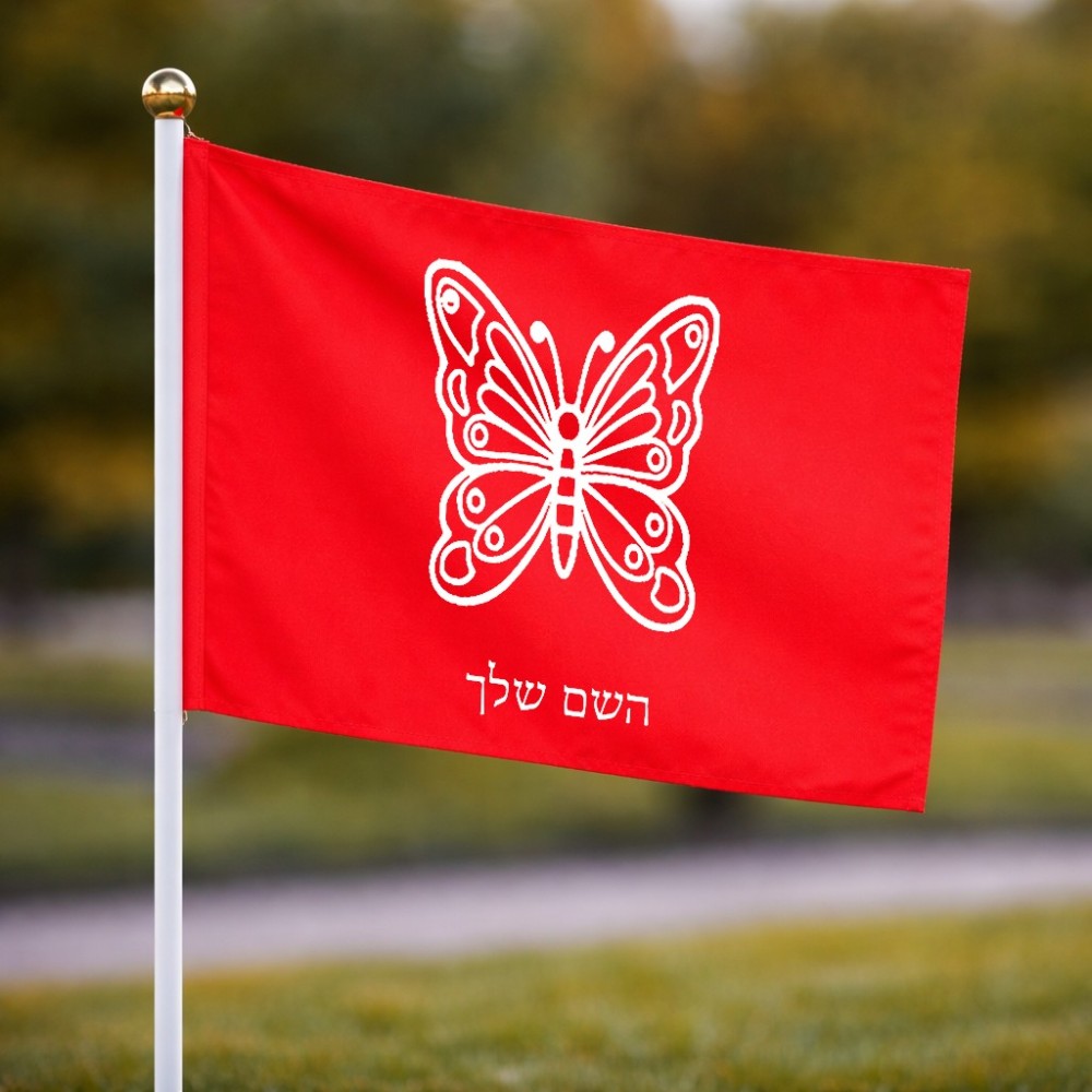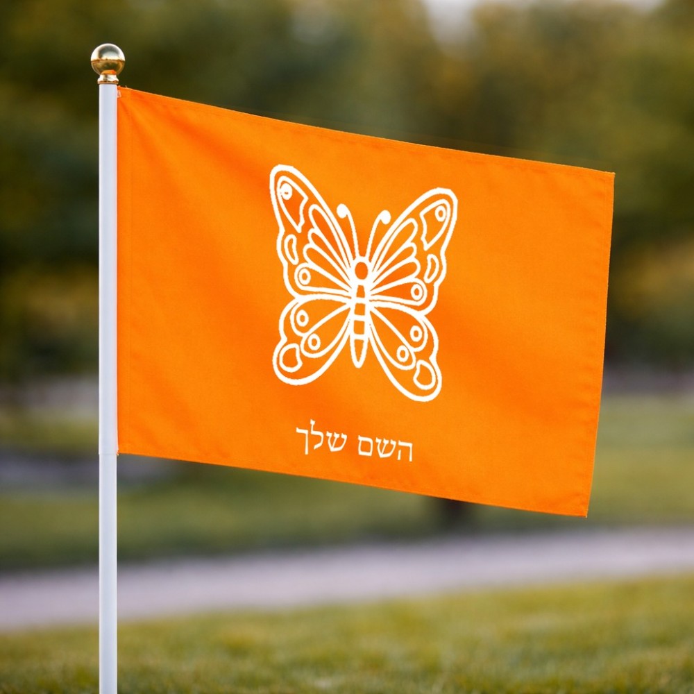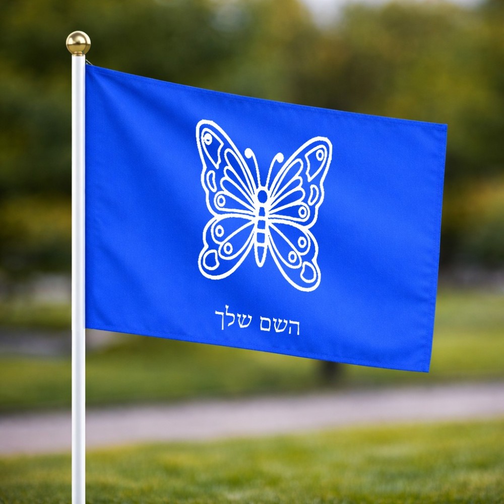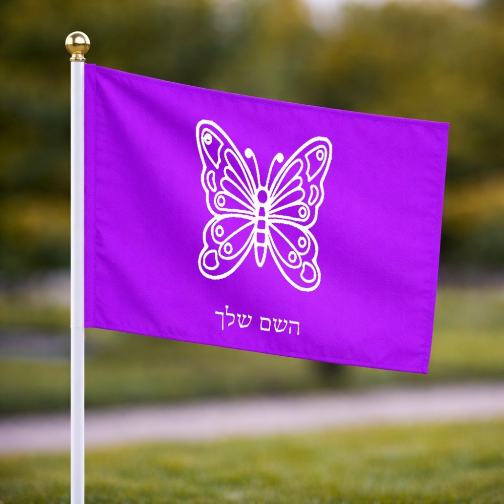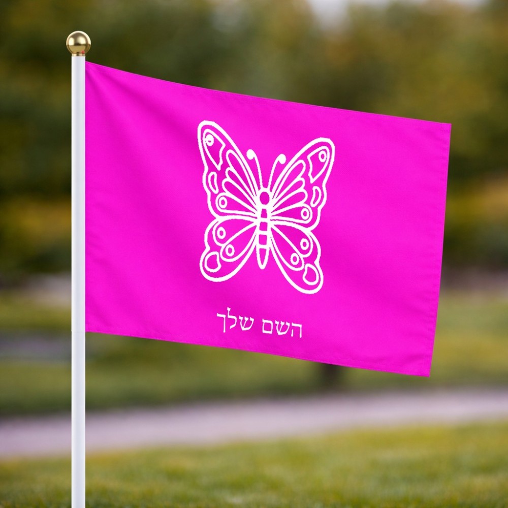 דיגלון בעיצוב אישי עם השם שלך בעיצוב פרפר גודל הדיגלון 20.5 × 14 ס"מ, ההדפסה מתבצעת בשני צידי הדגל, את השם המבוקש ניתן לציין בהזמנה, אם לא צויין אנחנו ניצור קשר לבירור.