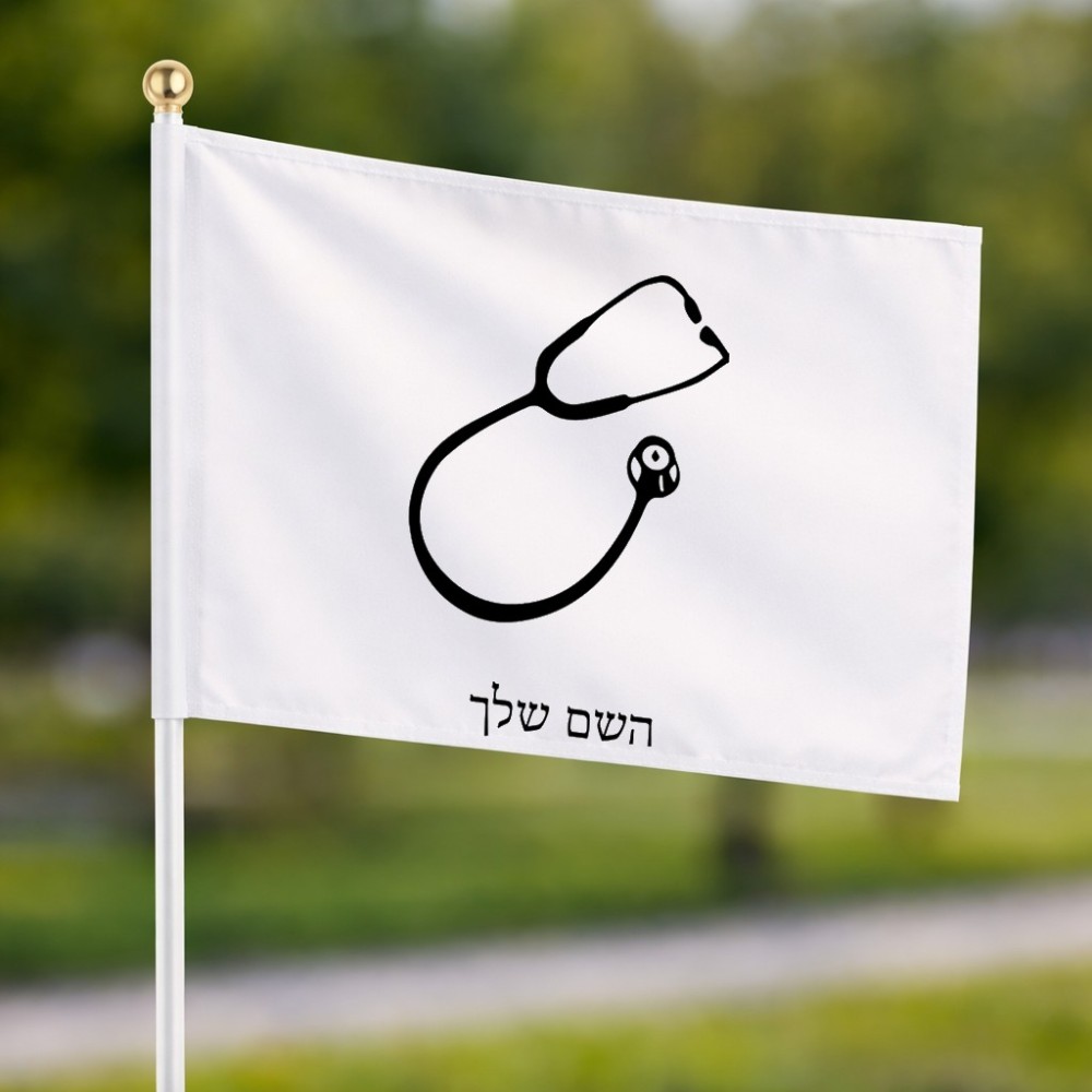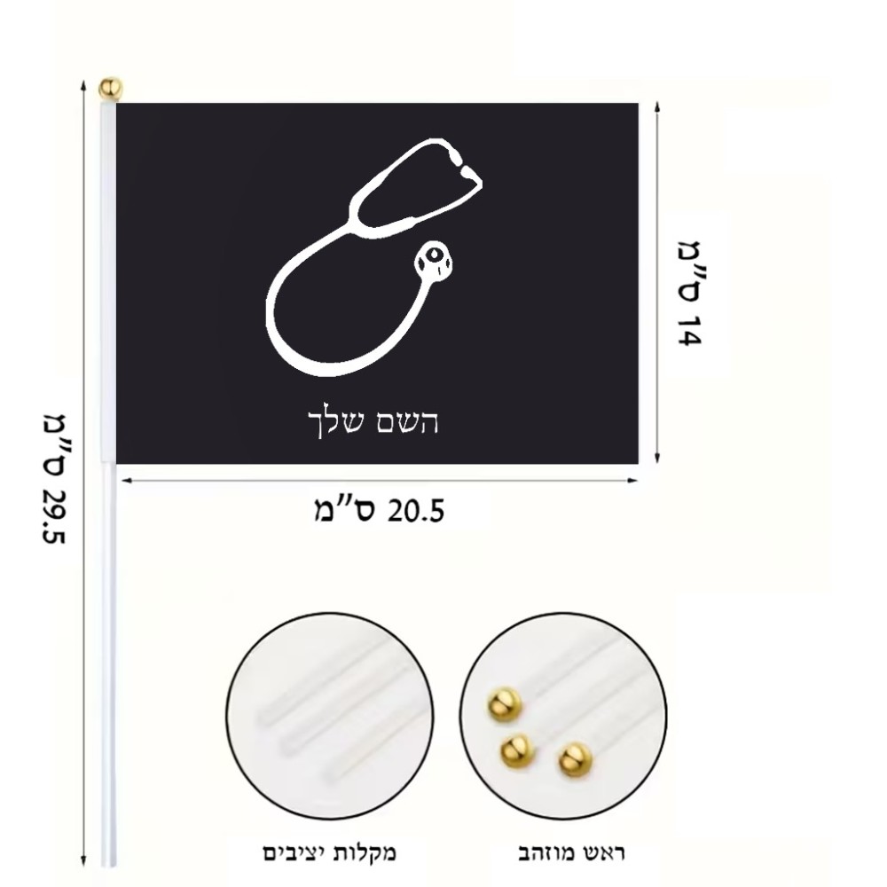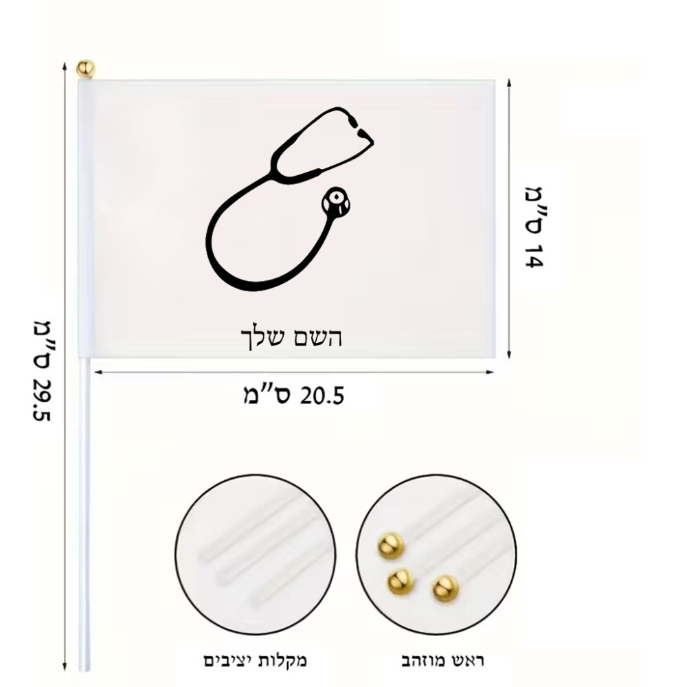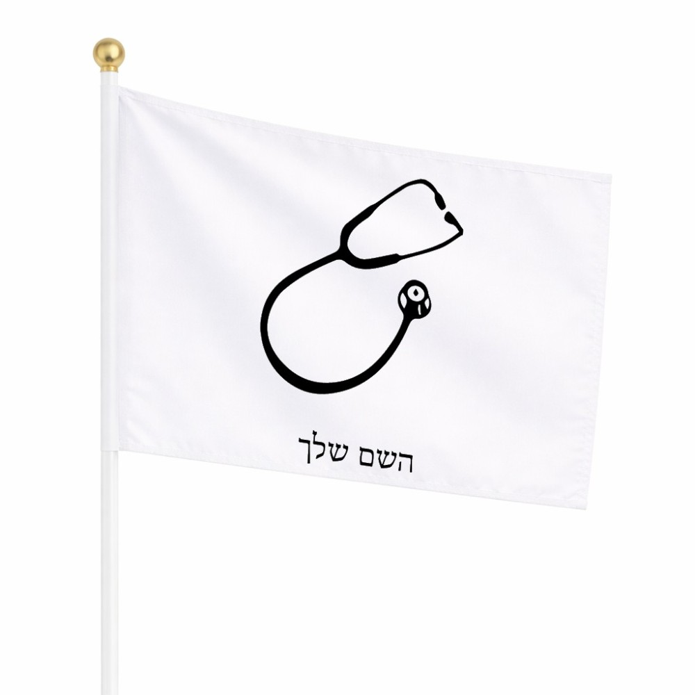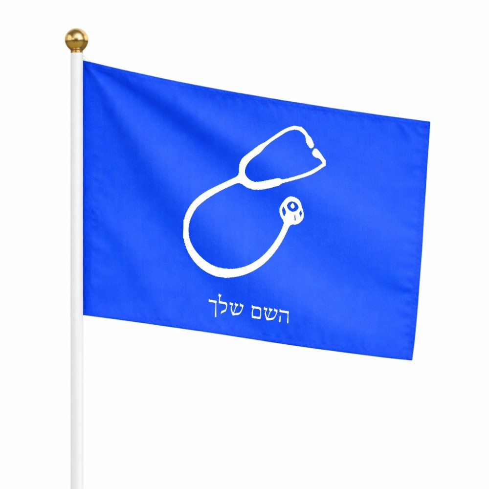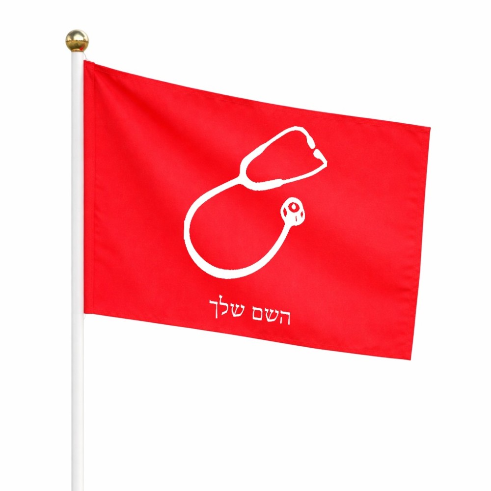 דיגלון בעיצוב אישי עם השם שלך בעיצוב סטטוסקופ רופא גודל הדיגלון 20.5 × 14 ס"מ, ההדפסה מתבצעת בשני צידי הדגל, את השם המבוקש ניתן לציין בהזמנה, אם לא צויין אנחנו ניצור קשר לבירור.