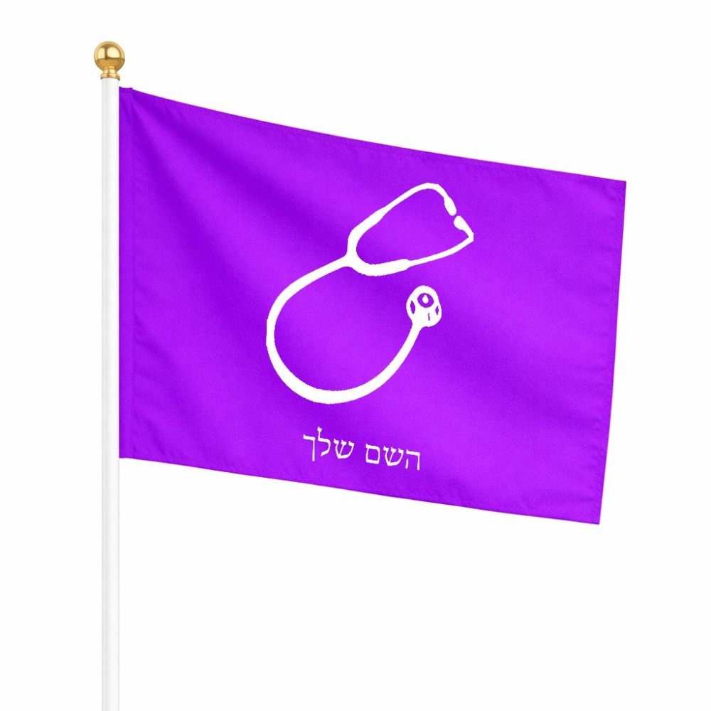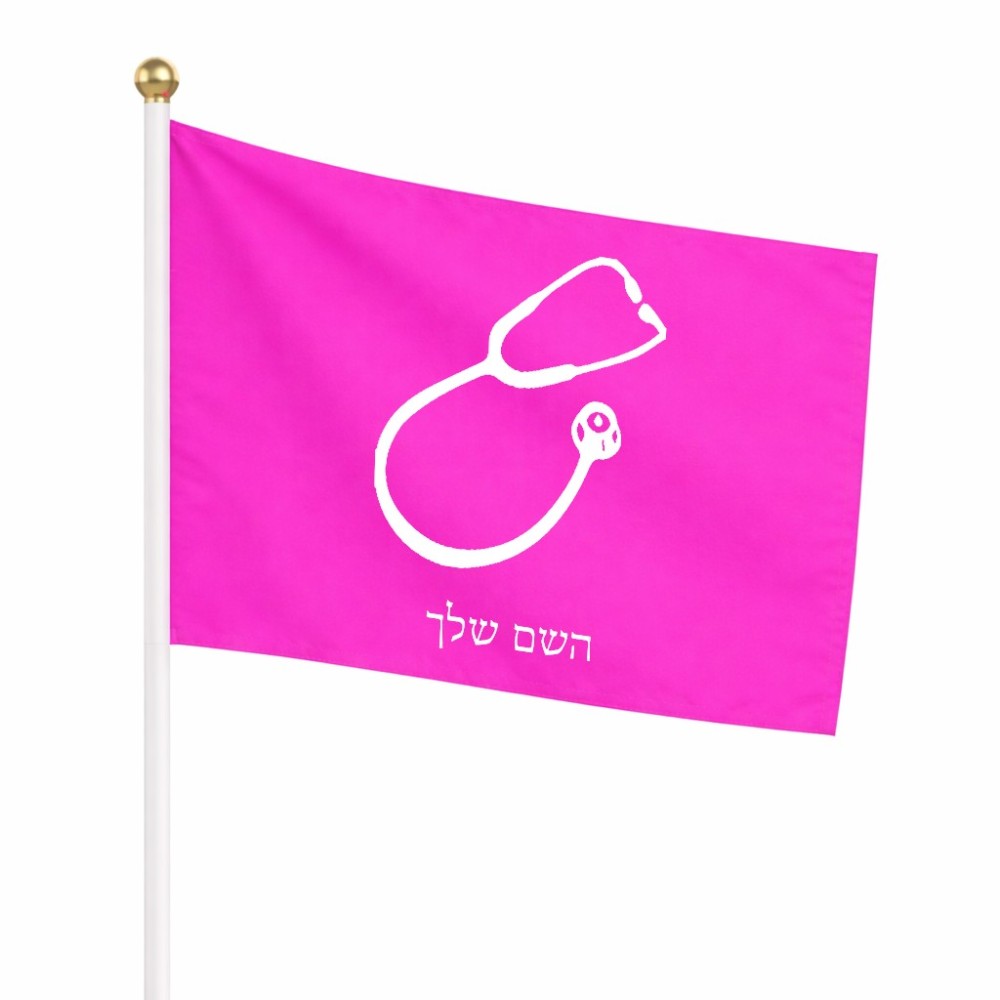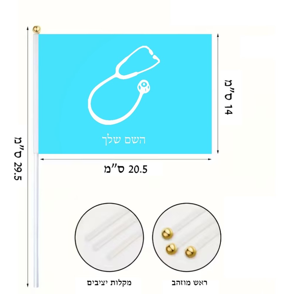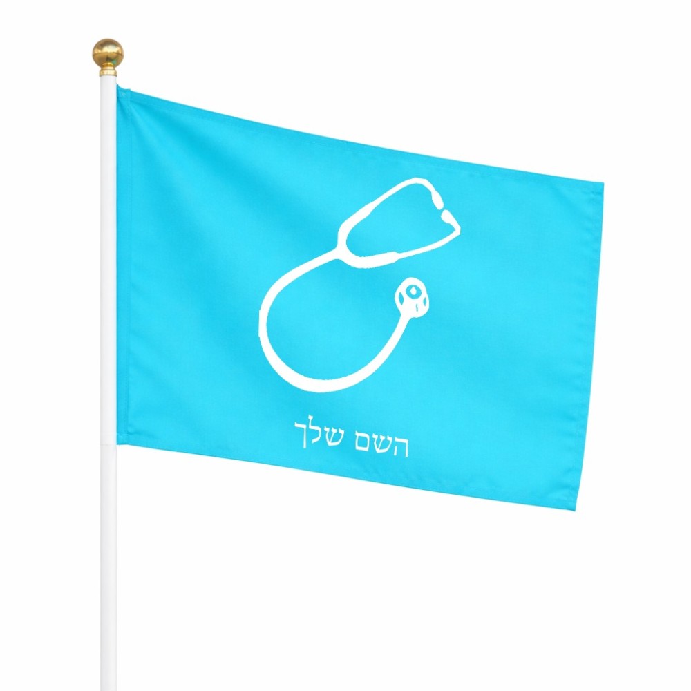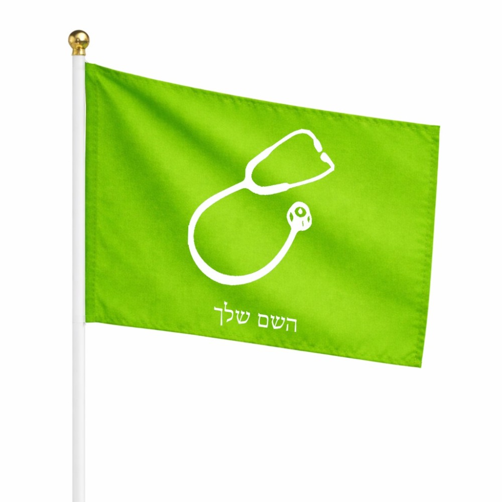 דיגלון בעיצוב אישי עם השם שלך בעיצוב סטטוסקופ רופא גודל הדיגלון 20.5 × 14 ס"מ, ההדפסה מתבצעת בשני צידי הדגל, את השם המבוקש ניתן לציין בהזמנה, אם לא צויין אנחנו ניצור קשר לבירור.