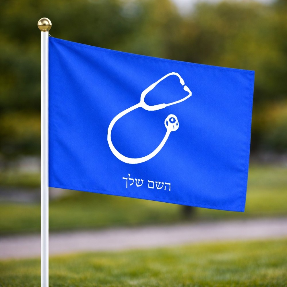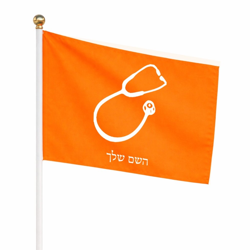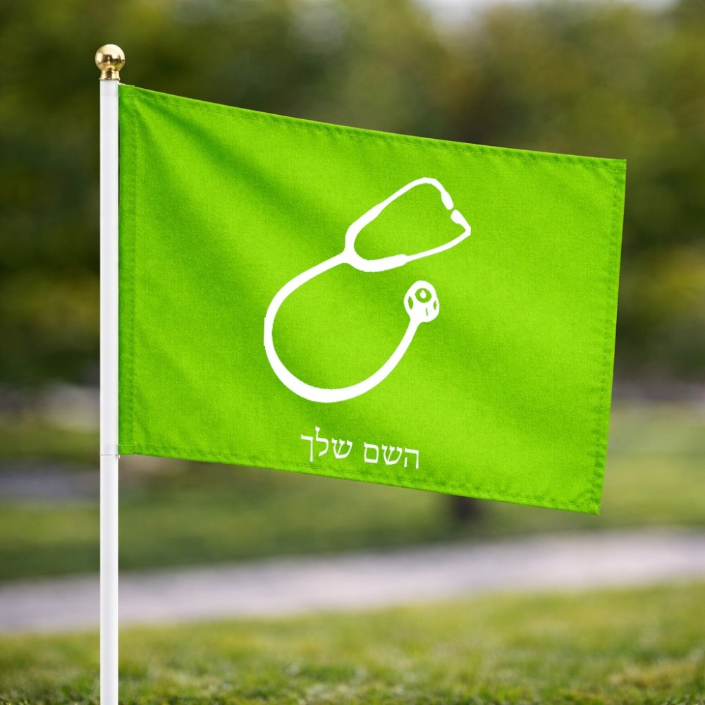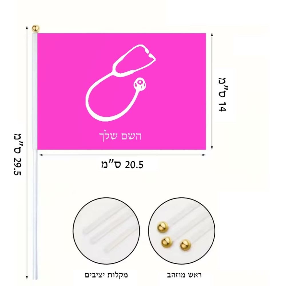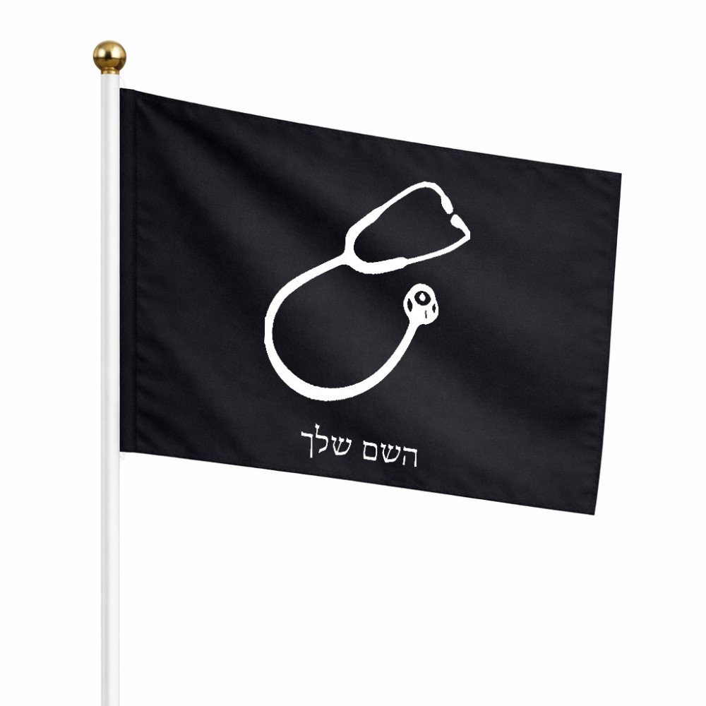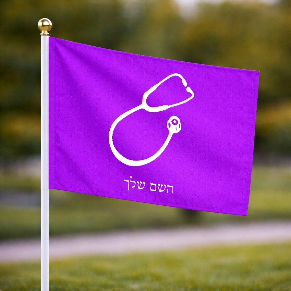 דיגלון בעיצוב אישי עם השם שלך בעיצוב סטטוסקופ רופא גודל הדיגלון 20.5 × 14 ס"מ, ההדפסה מתבצעת בשני צידי הדגל, את השם המבוקש ניתן לציין בהזמנה, אם לא צויין אנחנו ניצור קשר לבירור.