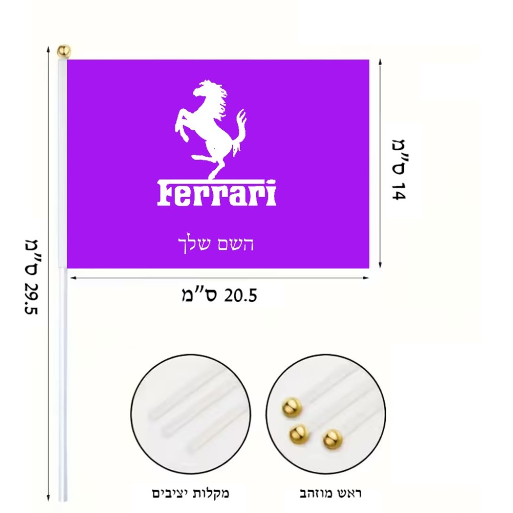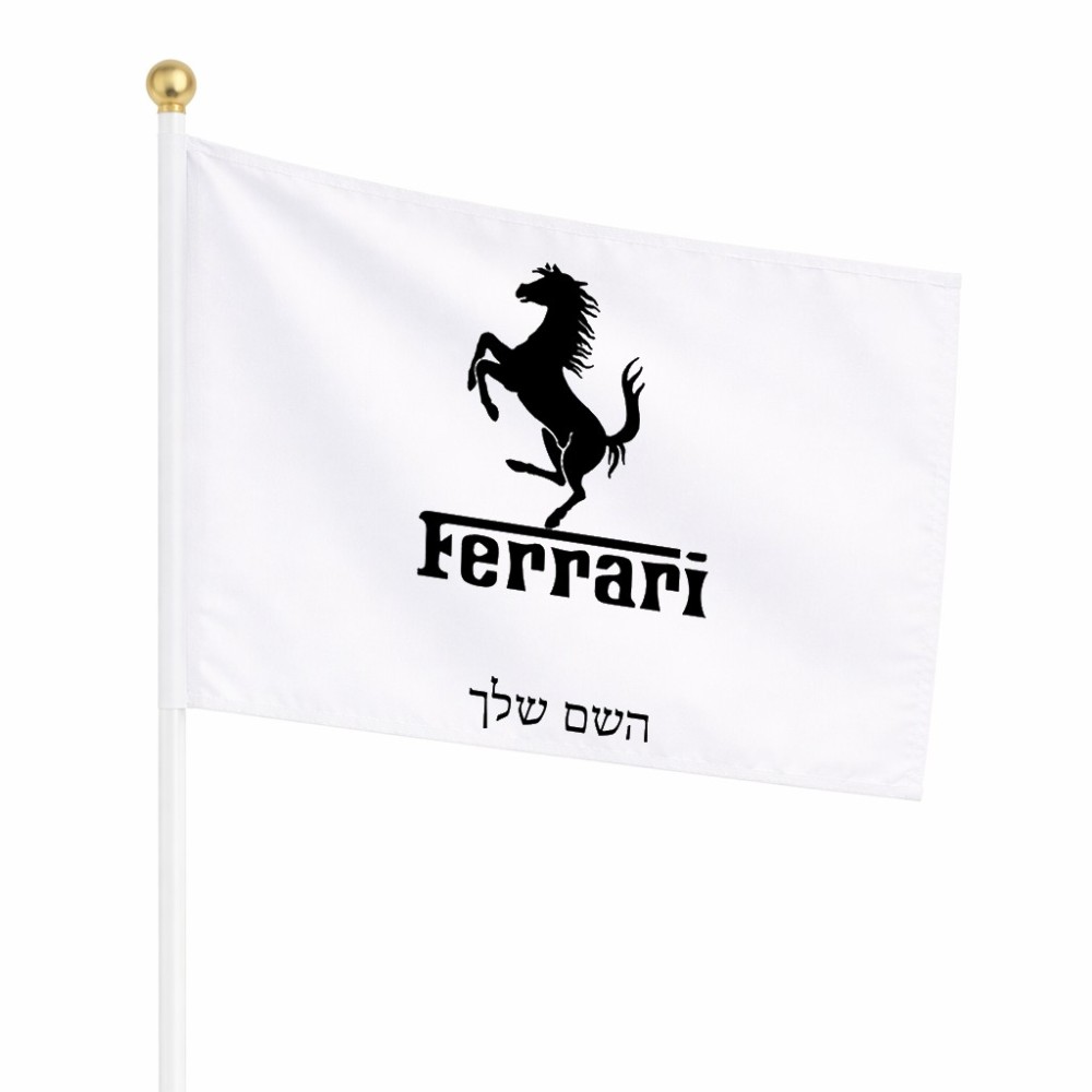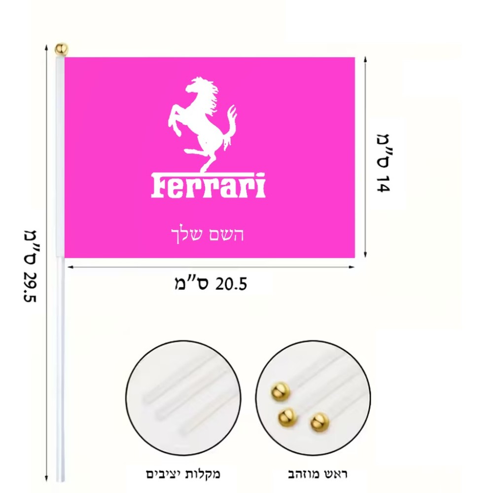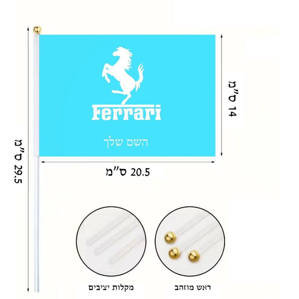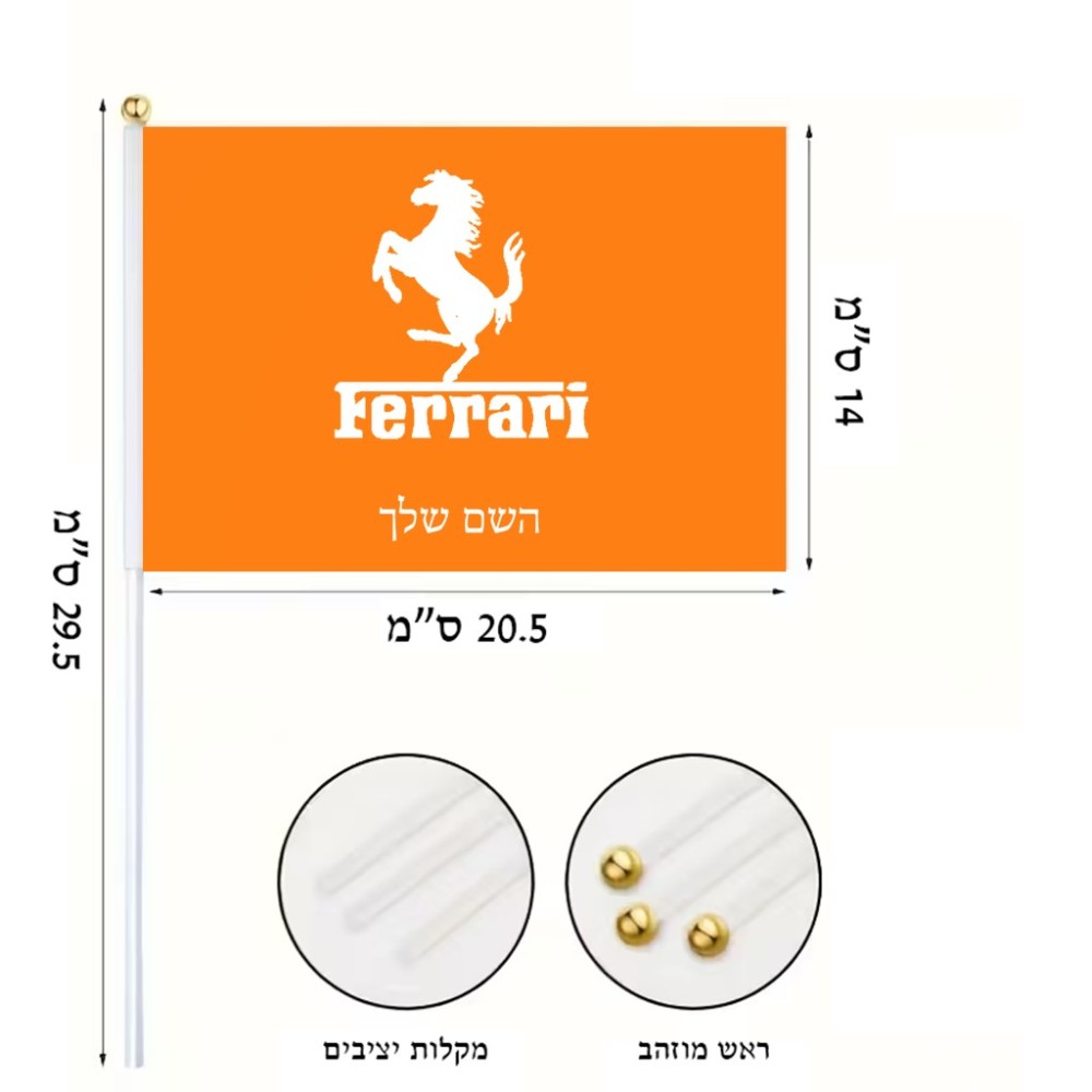 דיגלון בעיצוב אישי עם השם שלך בעיצוב פרארי גודל הדיגלון 20.5 × 14 ס"מ, ההדפסה מתבצעת בשני צידי הדגל, את השם המבוקש ניתן לציין בהזמנה, אם לא צויין אנחנו ניצור קשר לבירור.