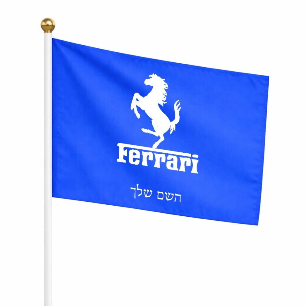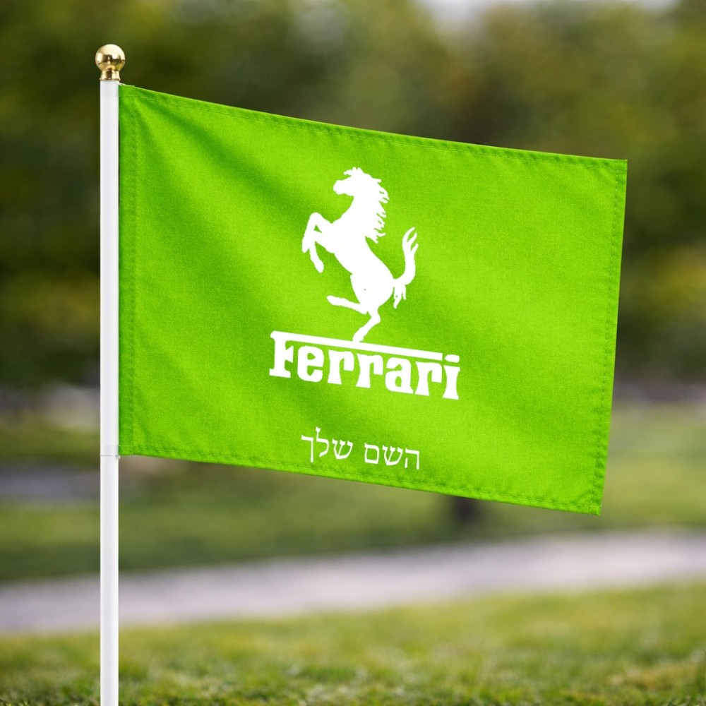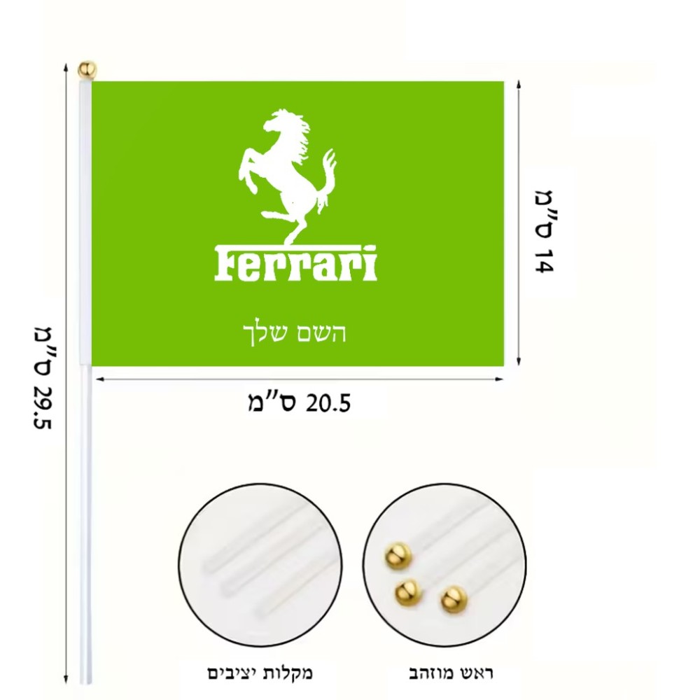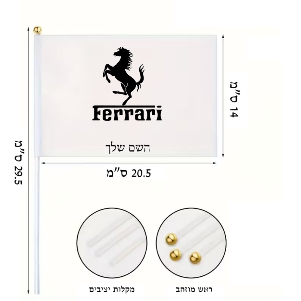 דיגלון בעיצוב אישי עם השם שלך בעיצוב פרארי גודל הדיגלון 20.5 × 14 ס"מ, ההדפסה מתבצעת בשני צידי הדגל, את השם המבוקש ניתן לציין בהזמנה, אם לא צויין אנחנו ניצור קשר לבירור.
