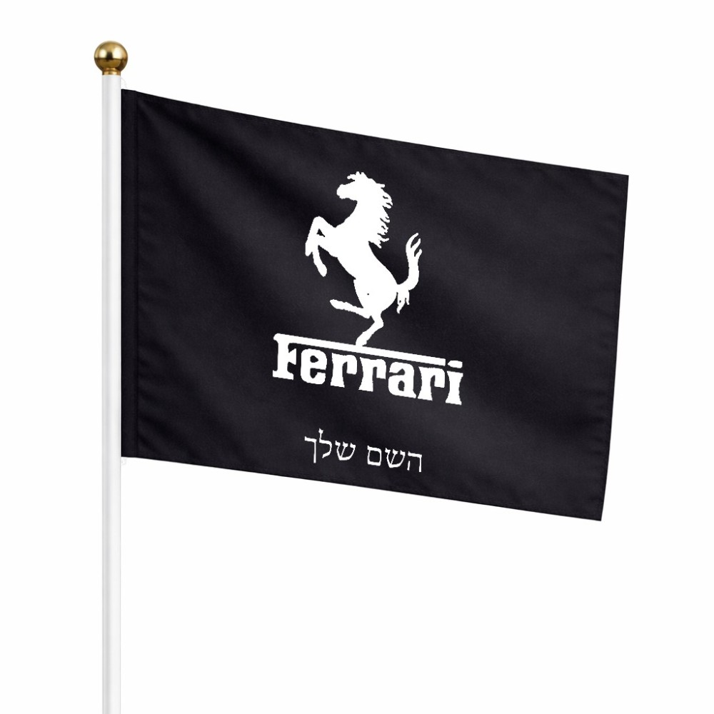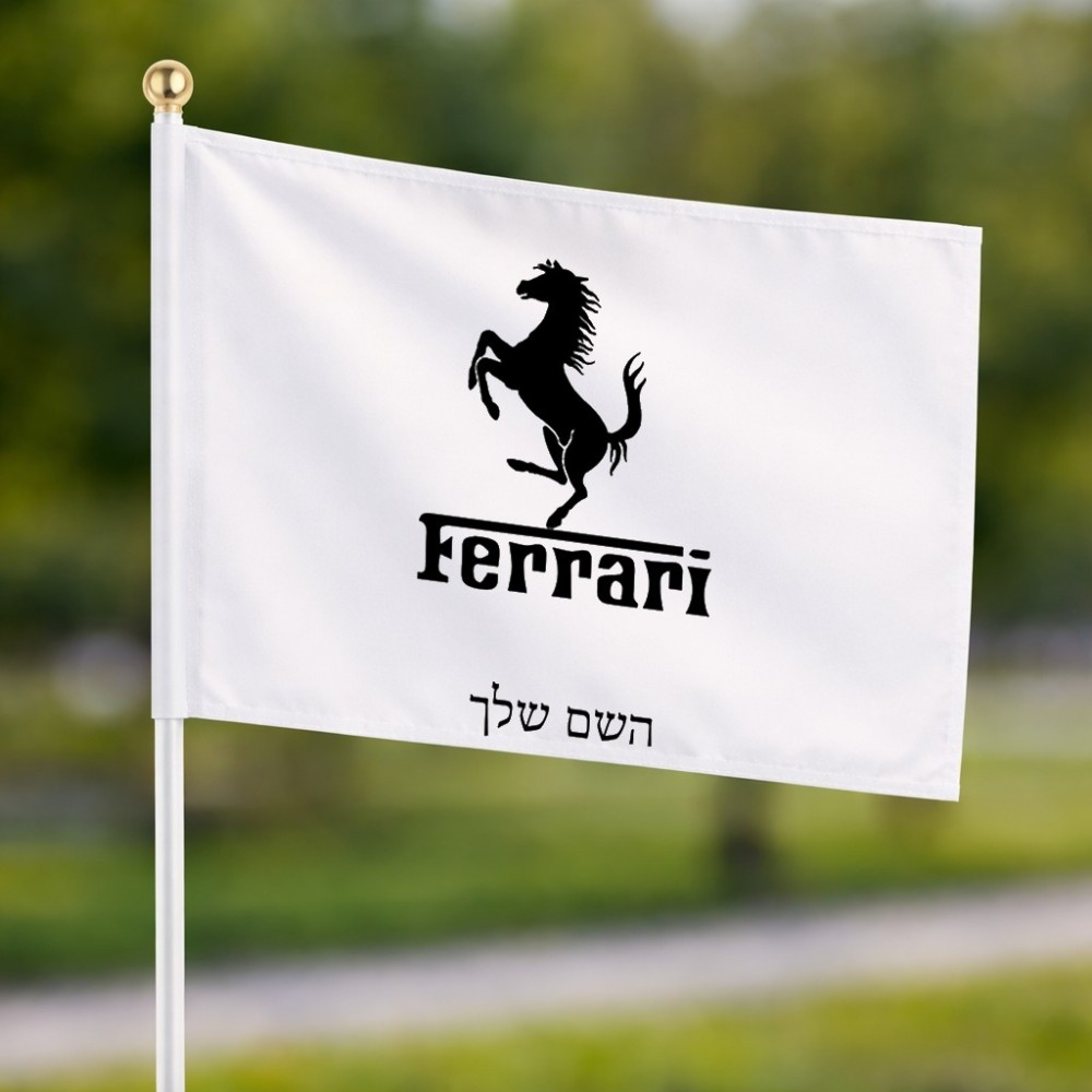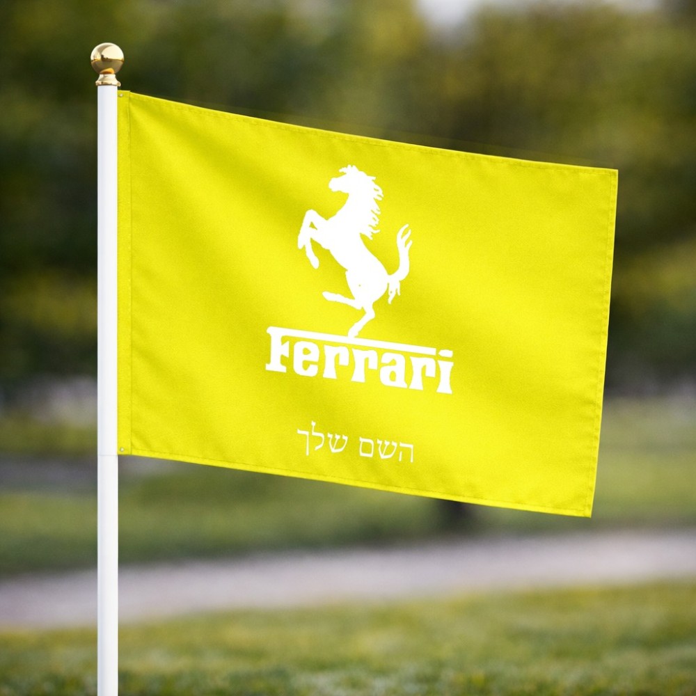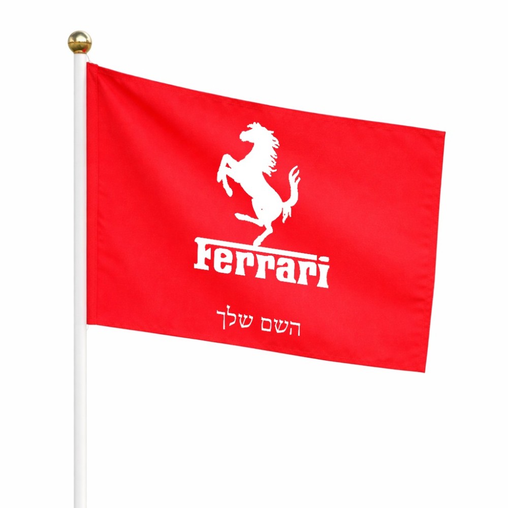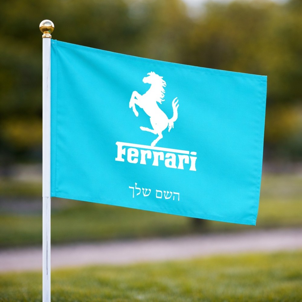 דיגלון בעיצוב אישי עם השם שלך בעיצוב פרארי גודל הדיגלון 20.5 × 14 ס"מ, ההדפסה מתבצעת בשני צידי הדגל, את השם המבוקש ניתן לציין בהזמנה, אם לא צויין אנחנו ניצור קשר לבירור.