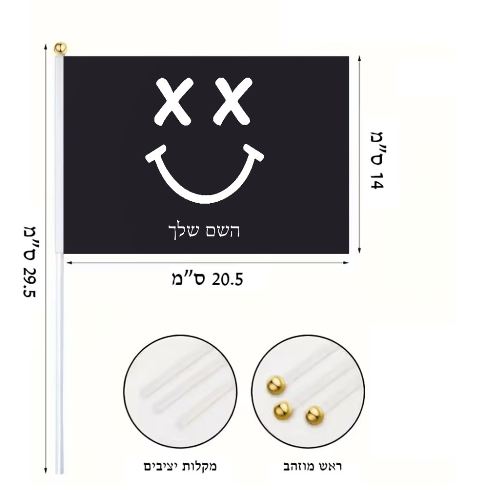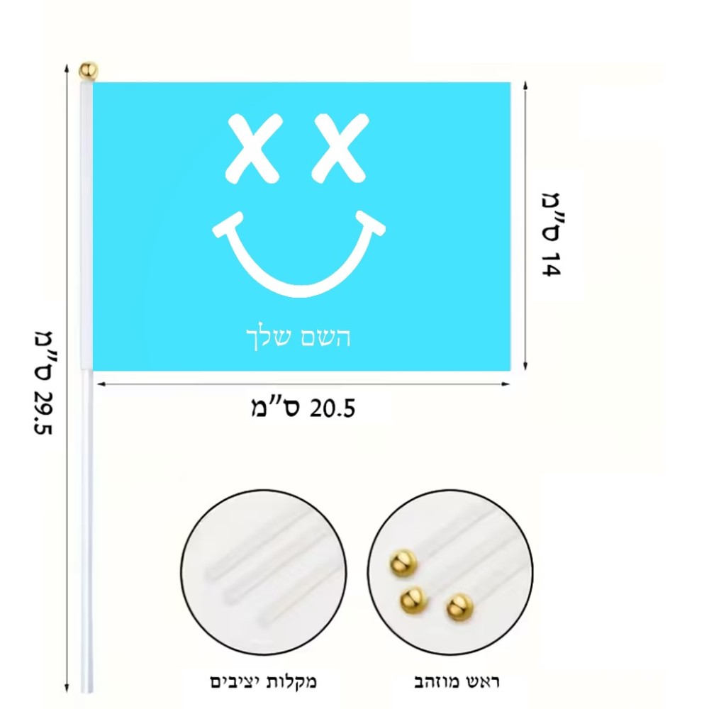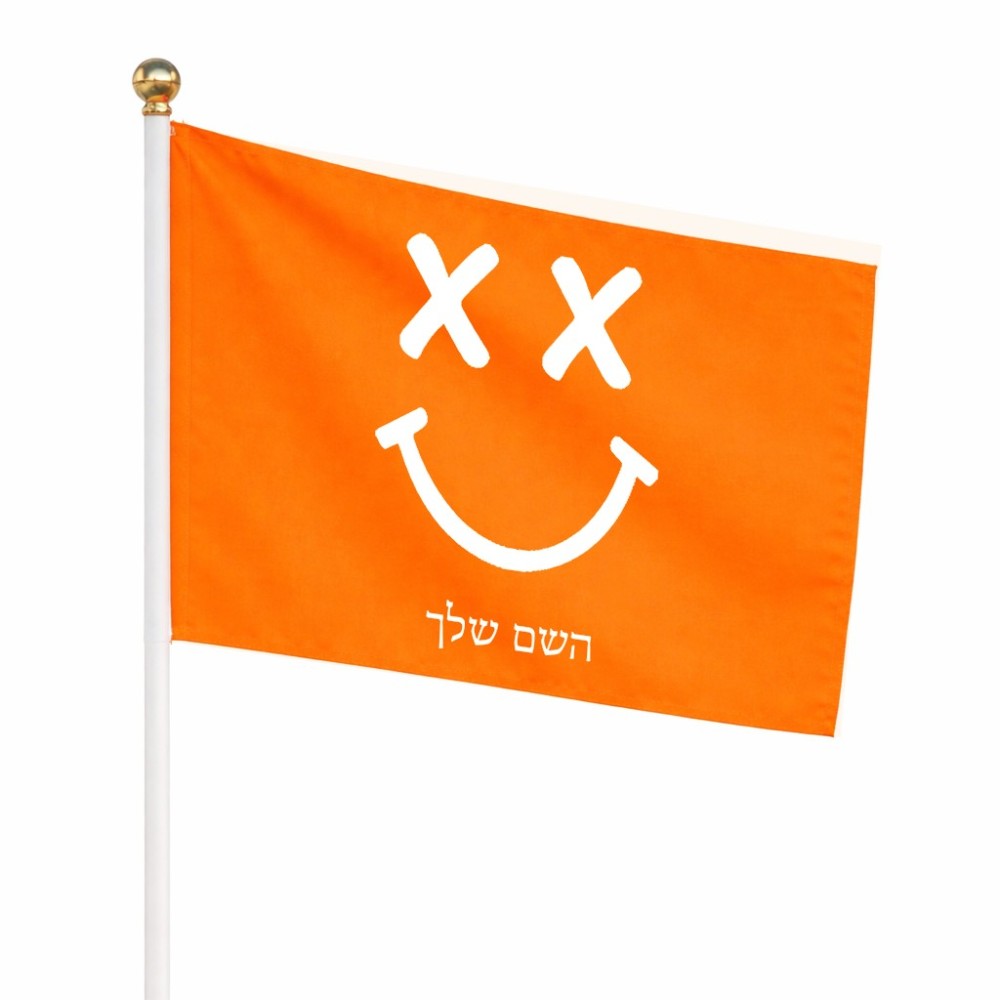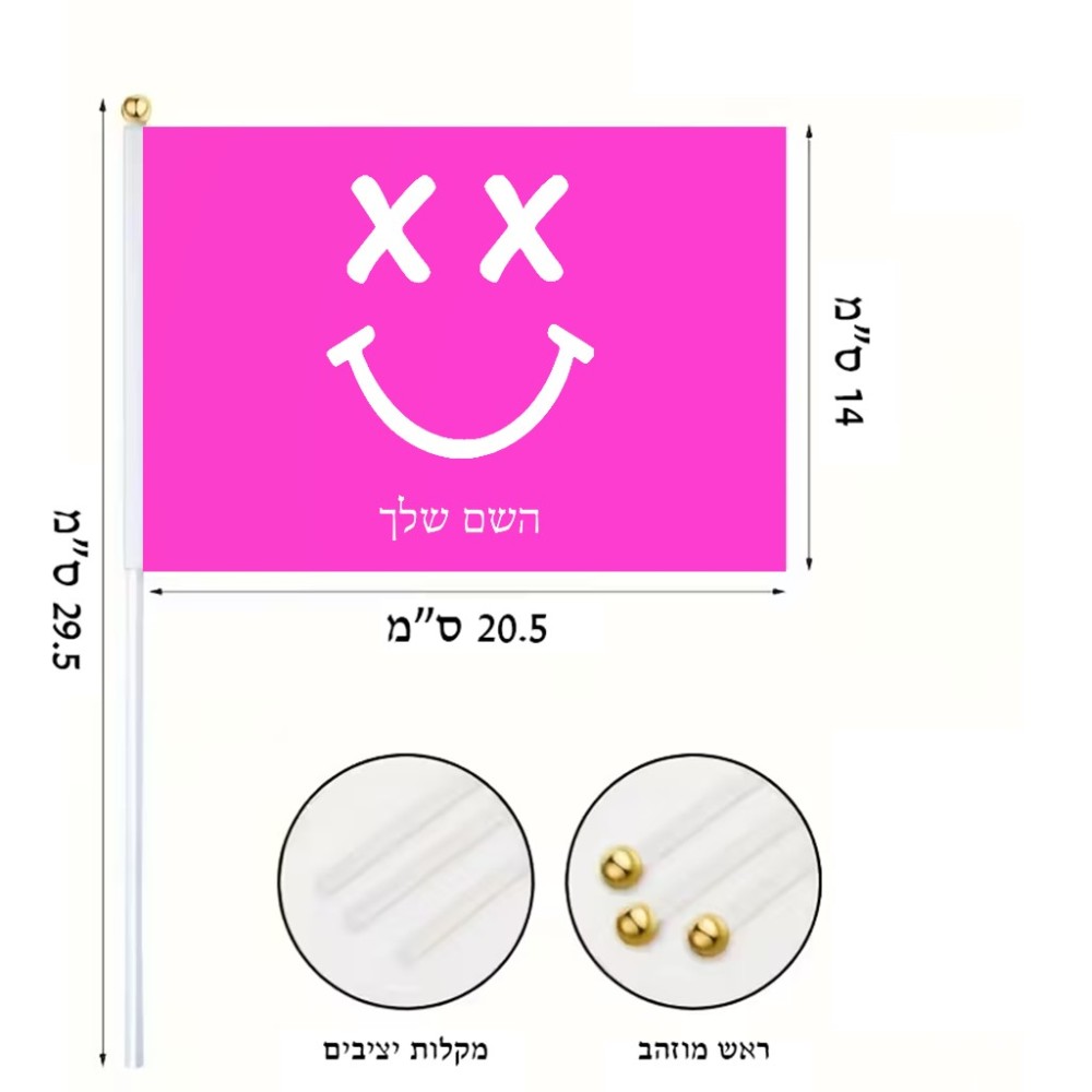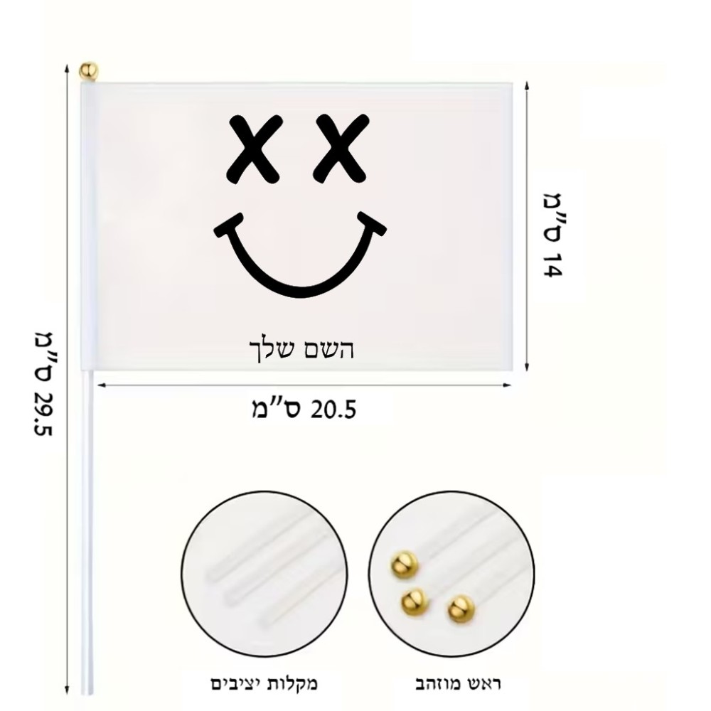 דיגלון בעיצוב אישי עם השם שלך בעיצוב סמיילי גודל הדיגלון 20.5 × 14 ס"מ, ההדפסה מתבצעת בשני צידי הדגל, את השם המבוקש ניתן לציין בהזמנה, אם לא צויין אנחנו ניצור קשר לבירור.