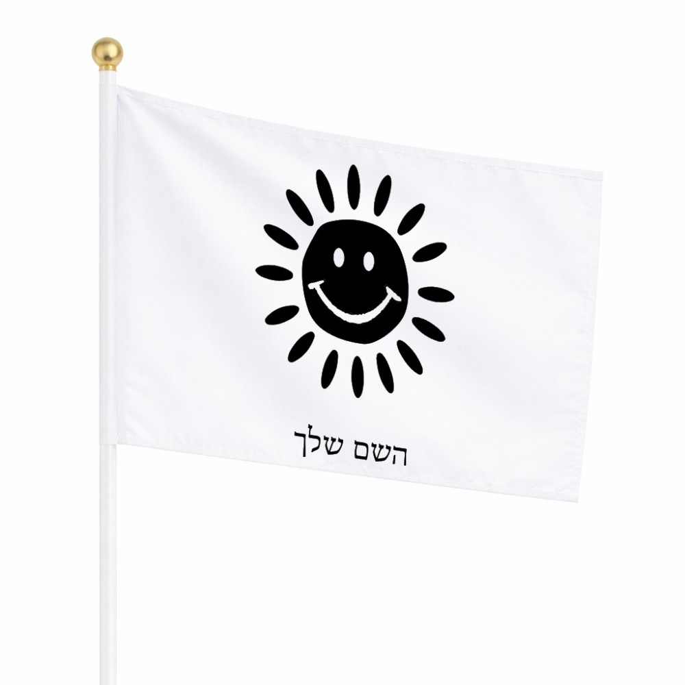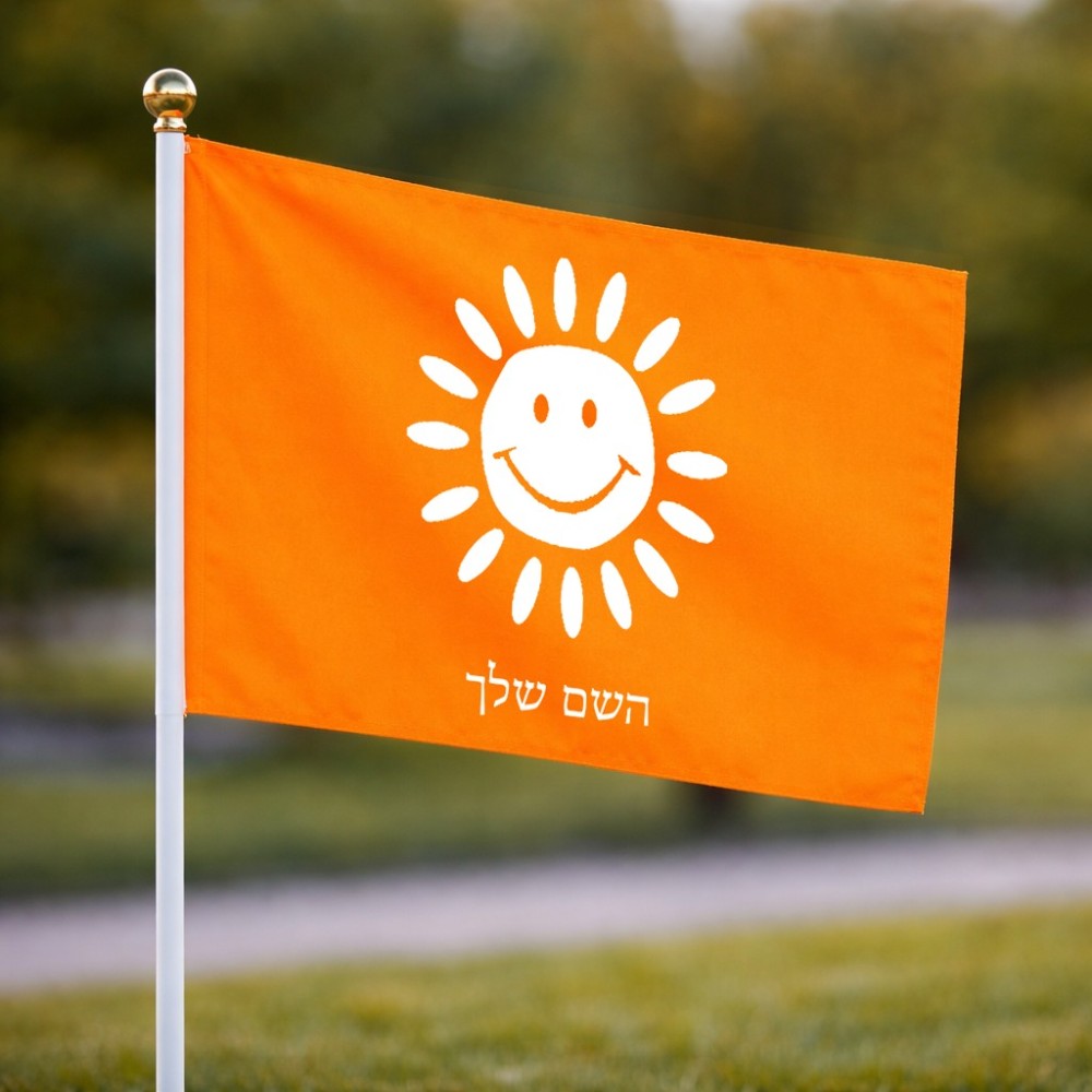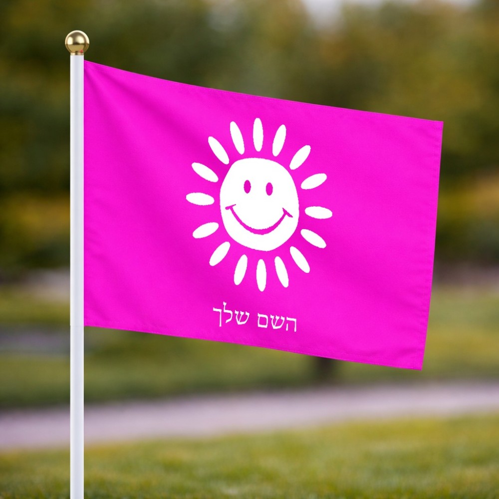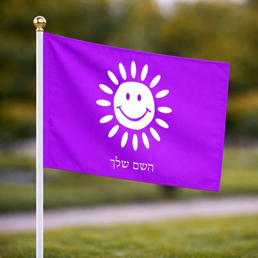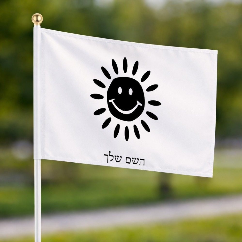 דיגלון בעיצוב אישי עם השם שלך בעיצוב שמש גודל הדיגלון 20.5 × 14 ס"מ, ההדפסה מתבצעת בשני צידי הדגל, את השם המבוקש ניתן לציין בהזמנה, אם לא צויין אנחנו ניצור קשר לבירור.