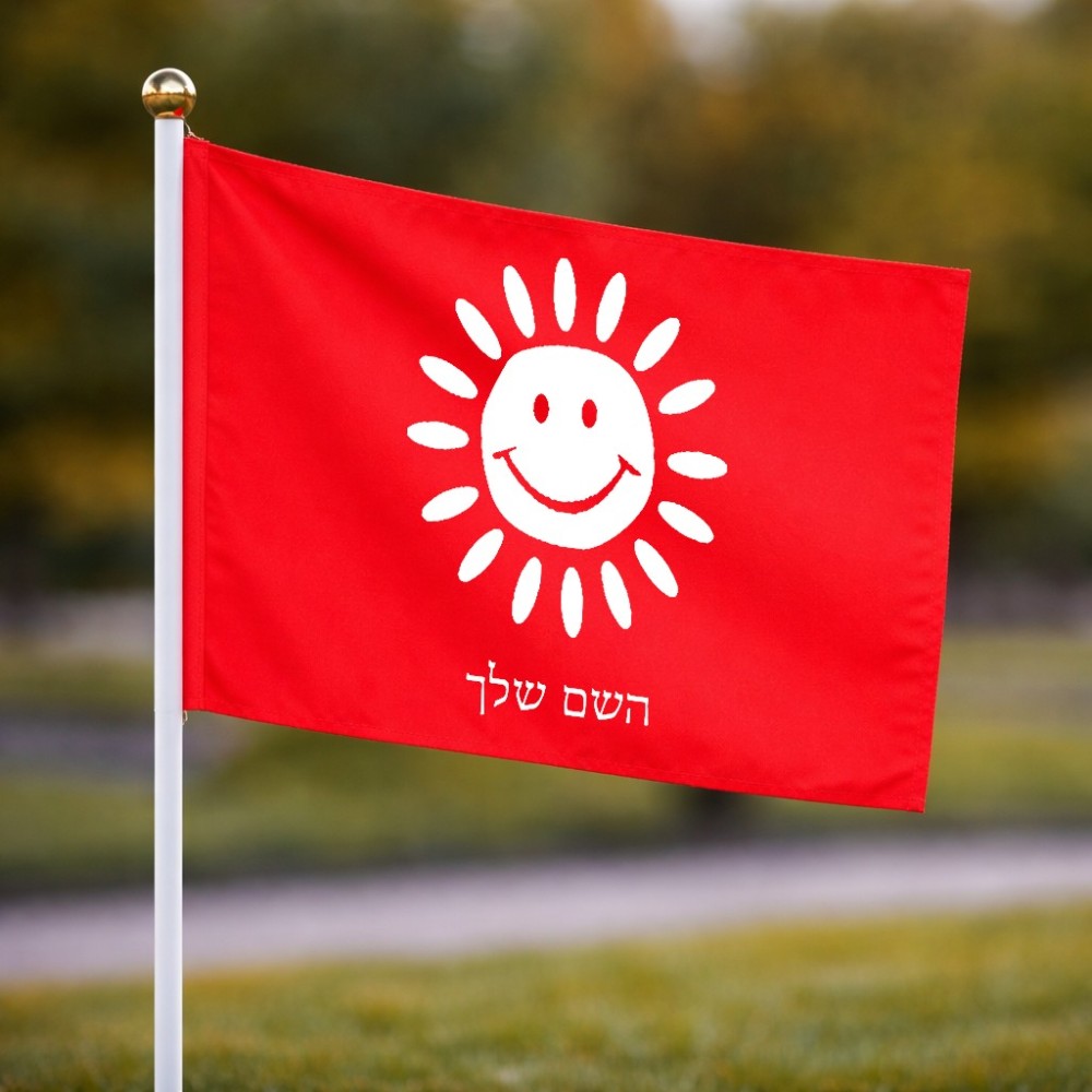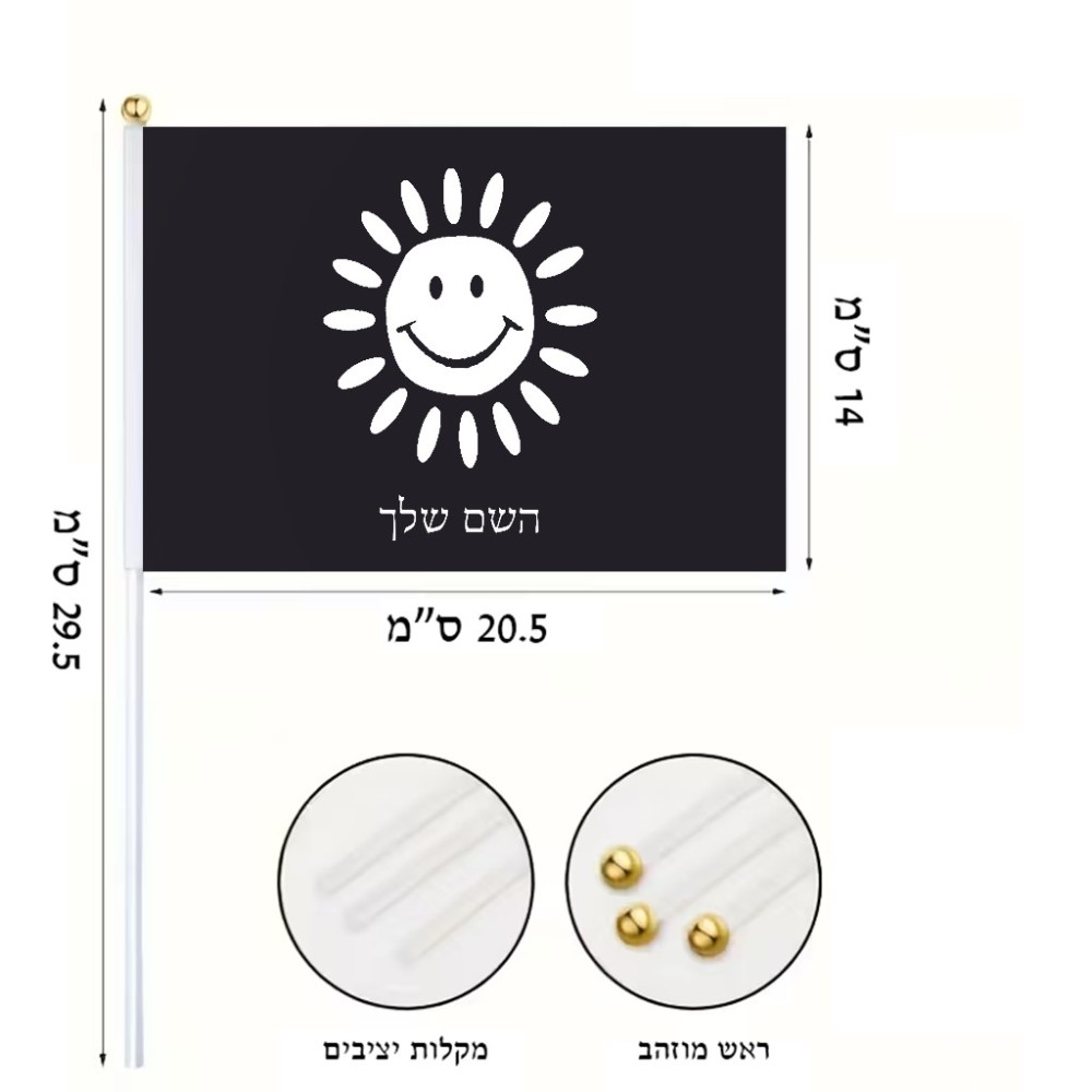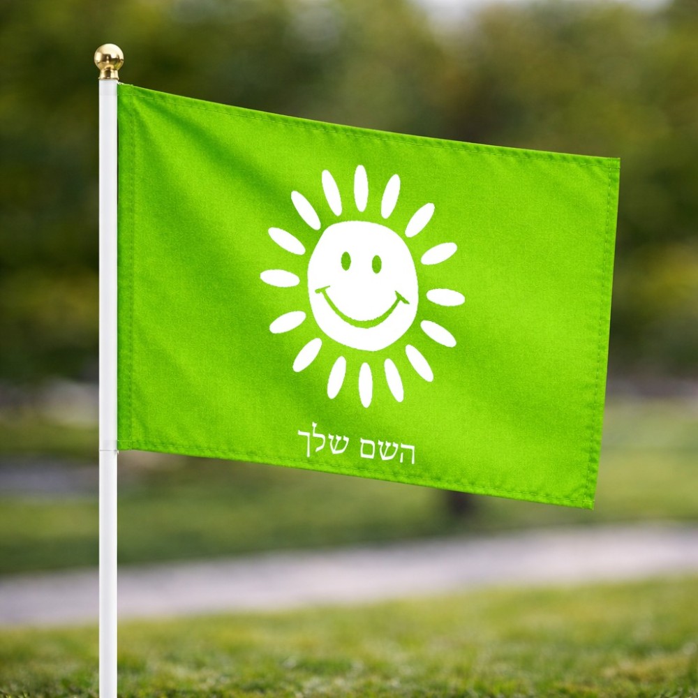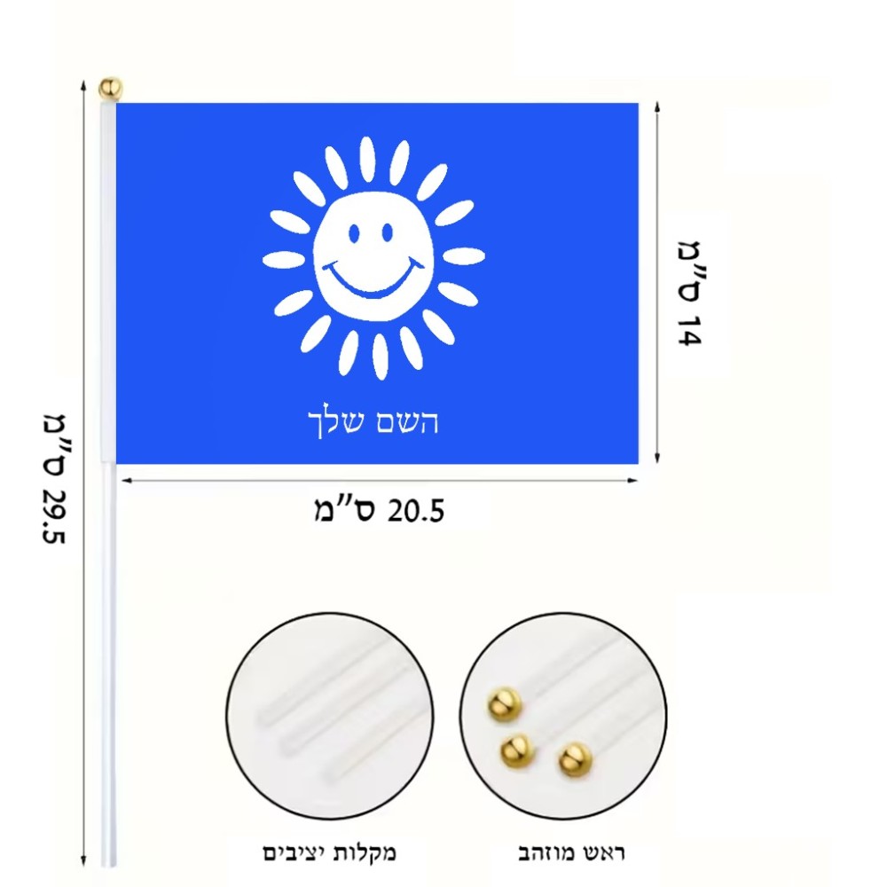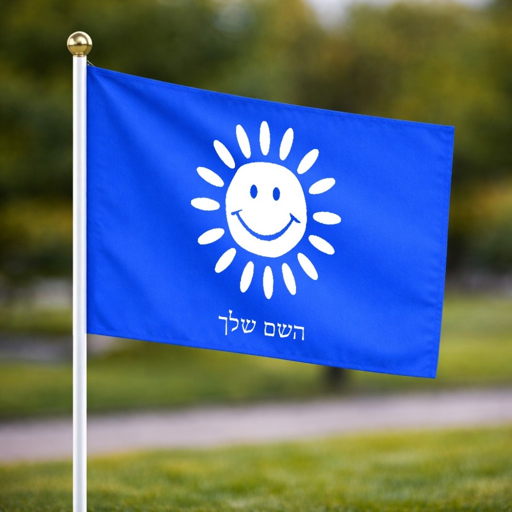 דיגלון בעיצוב אישי עם השם שלך בעיצוב שמש גודל הדיגלון 20.5 × 14 ס"מ, ההדפסה מתבצעת בשני צידי הדגל, את השם המבוקש ניתן לציין בהזמנה, אם לא צויין אנחנו ניצור קשר לבירור.