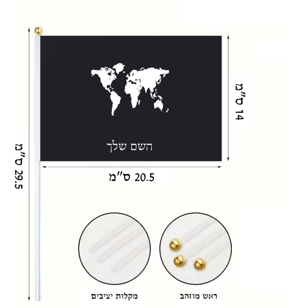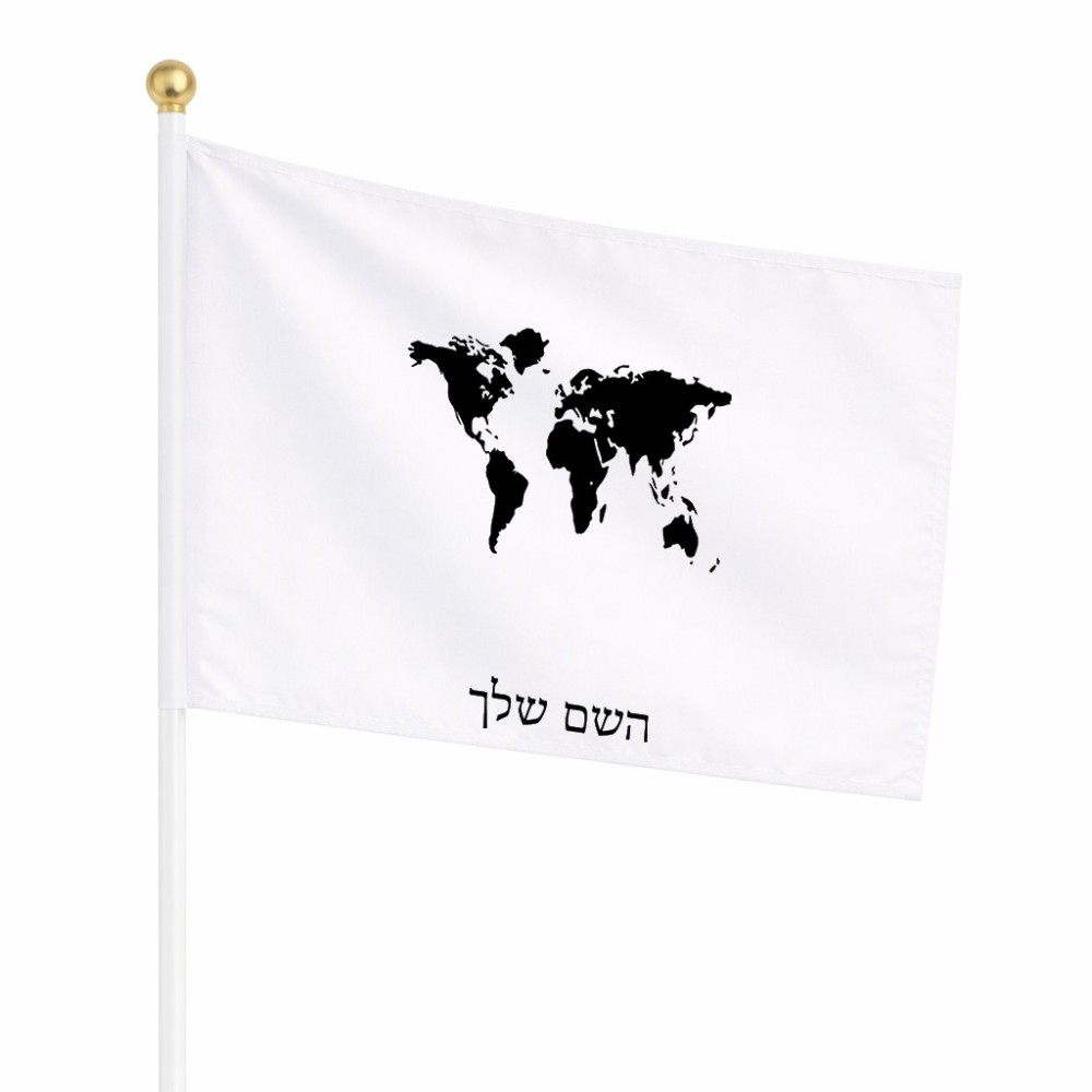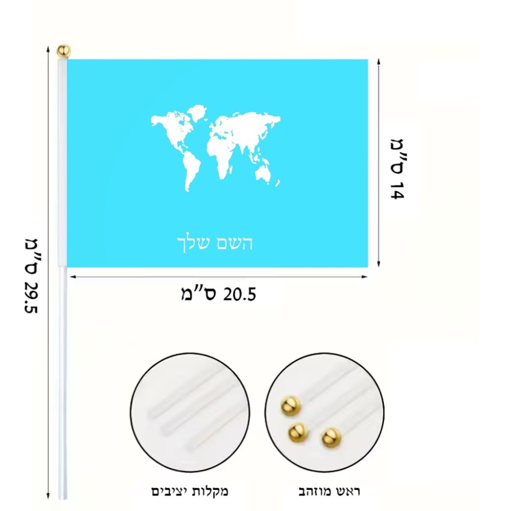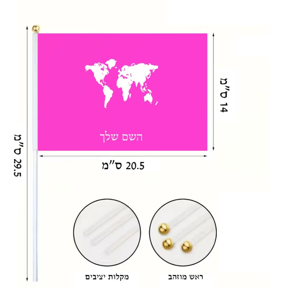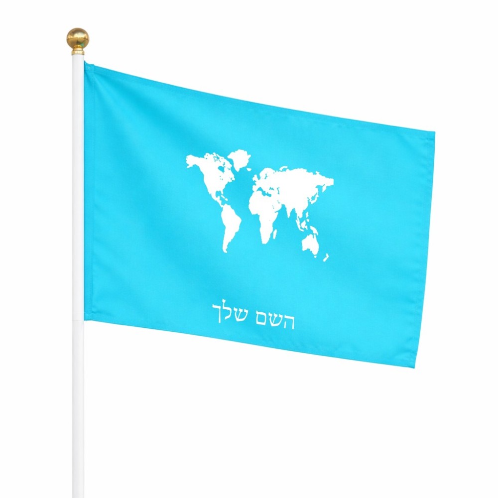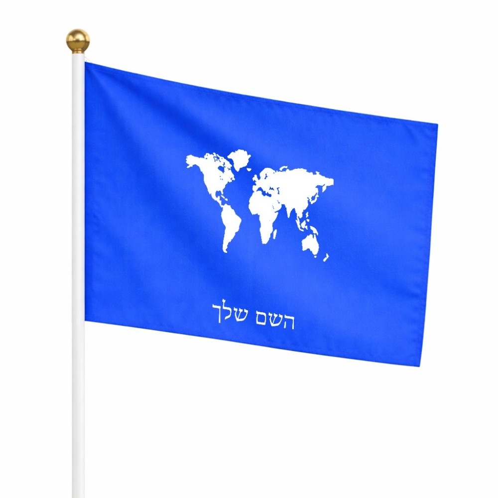 דיגלון בעיצוב אישי עם השם שלך בעיצוב מפת העולם גודל הדיגלון 20.5 × 14 ס"מ, ההדפסה מתבצעת בשני צידי הדגל, את השם המבוקש ניתן לציין בהזמנה, אם לא צויין אנחנו ניצור קשר לבירור.