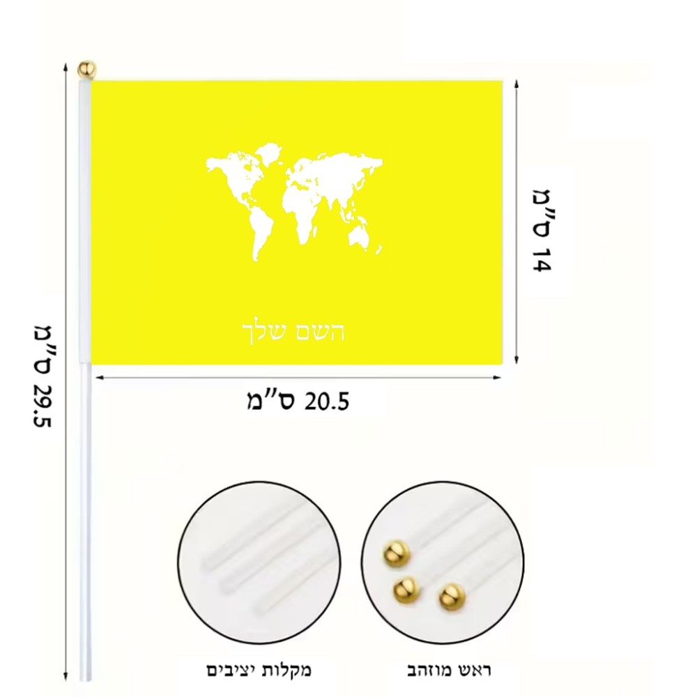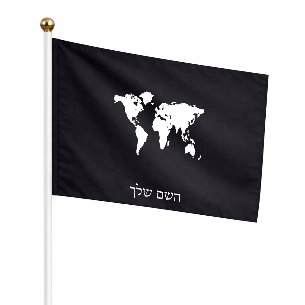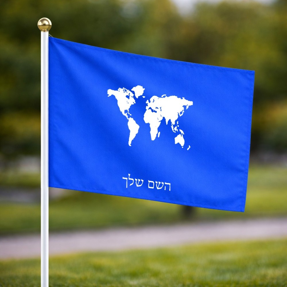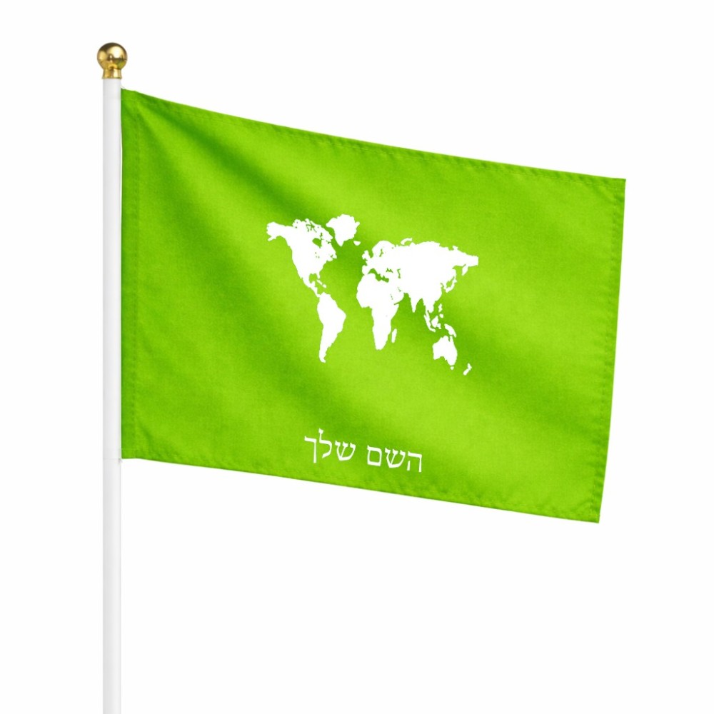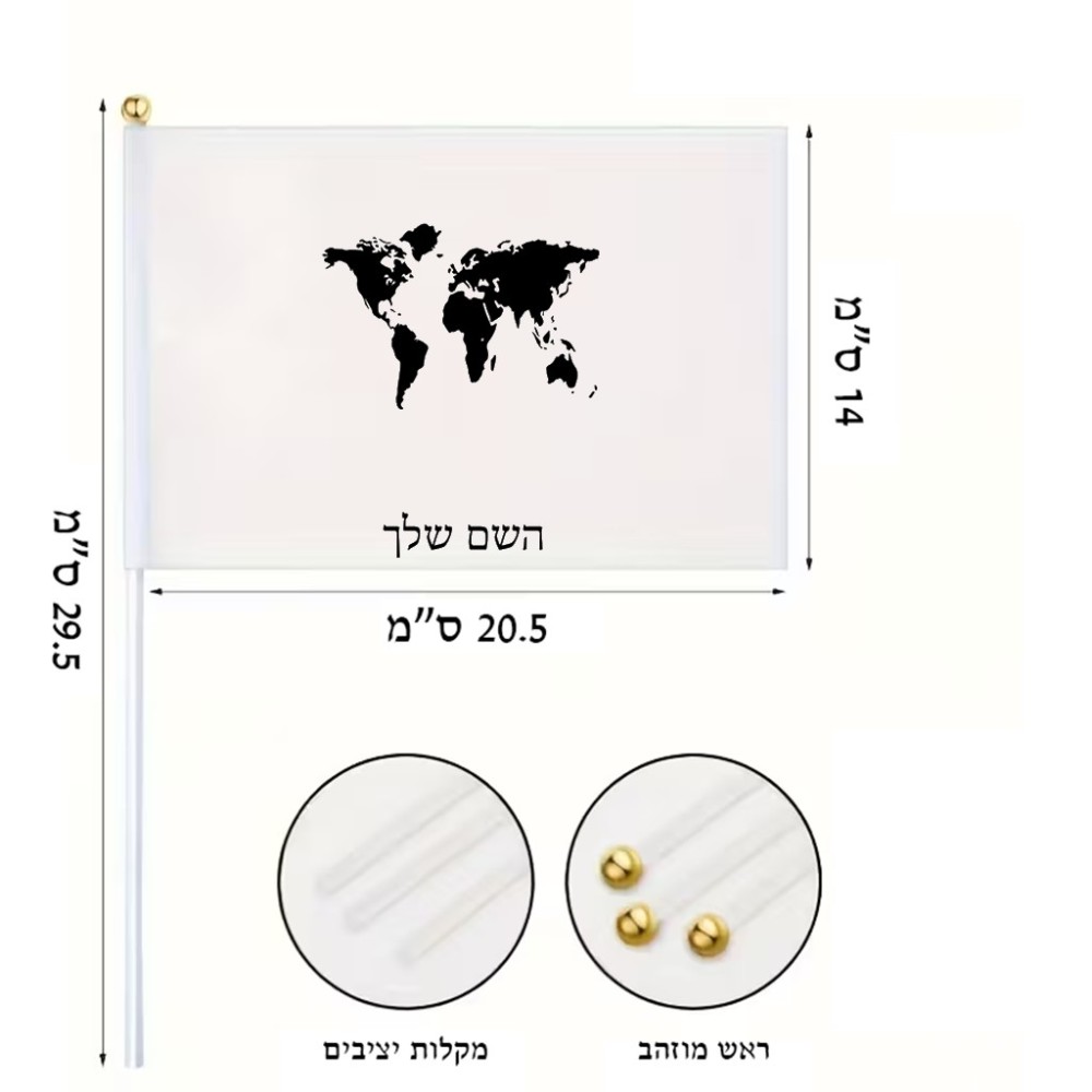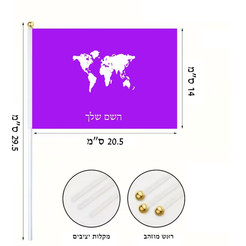 דיגלון בעיצוב אישי עם השם שלך בעיצוב מפת העולם גודל הדיגלון 20.5 × 14 ס"מ, ההדפסה מתבצעת בשני צידי הדגל, את השם המבוקש ניתן לציין בהזמנה, אם לא צויין אנחנו ניצור קשר לבירור.