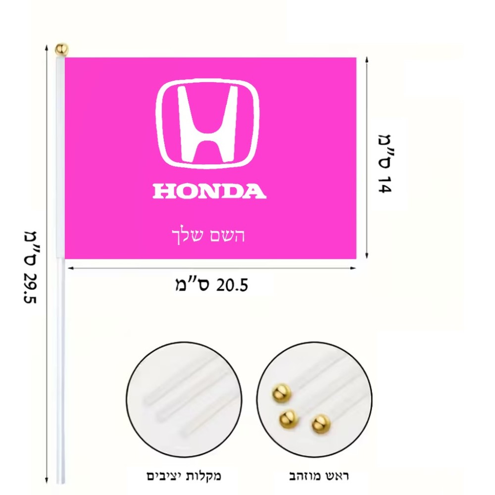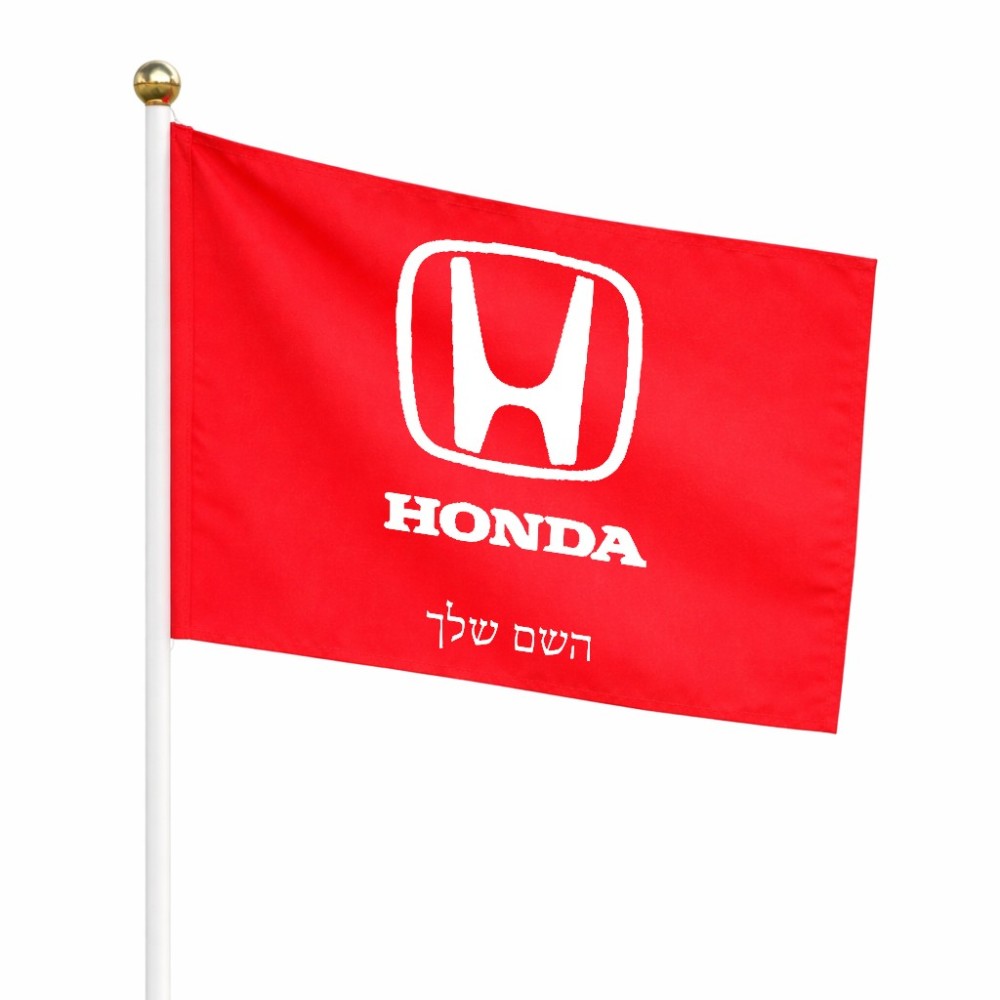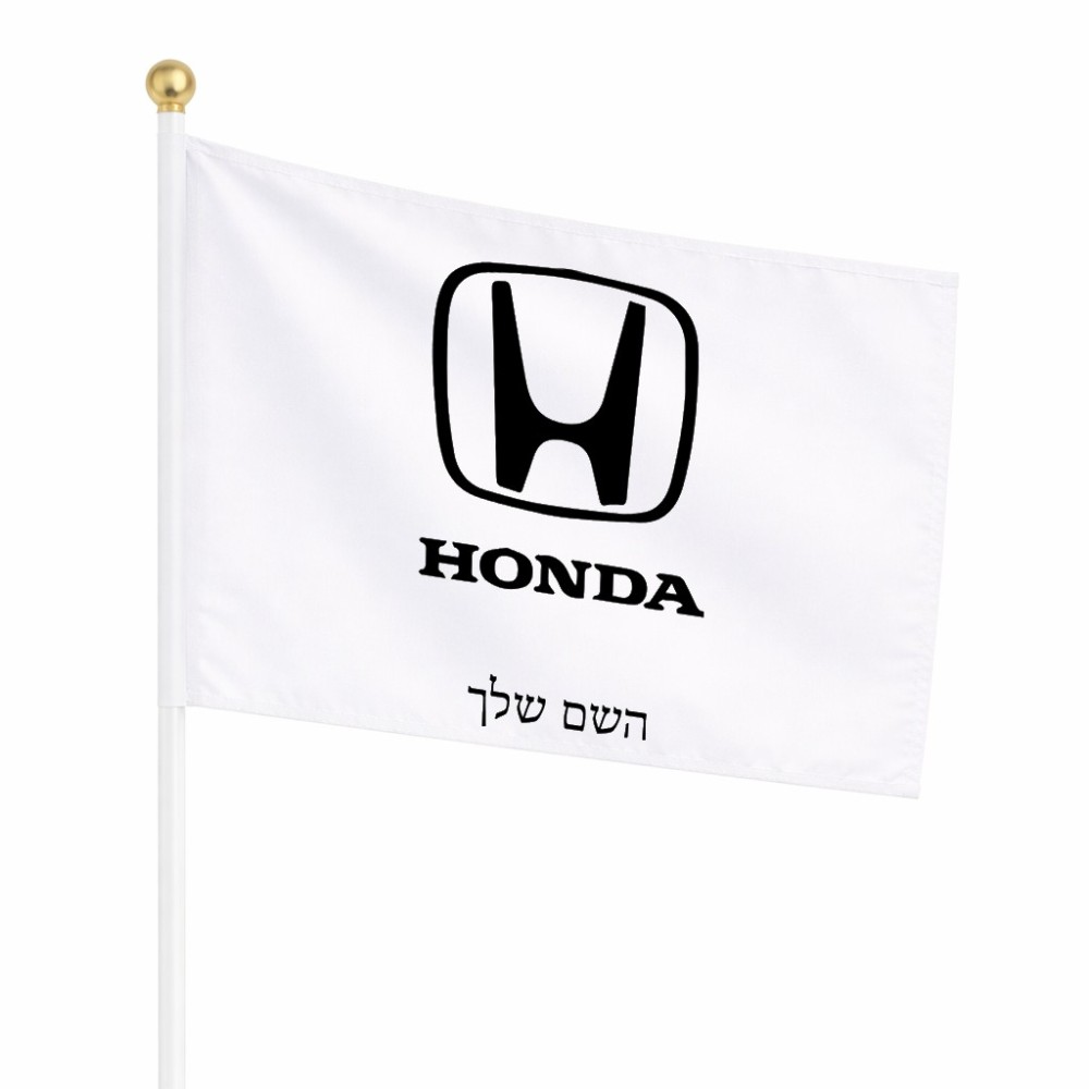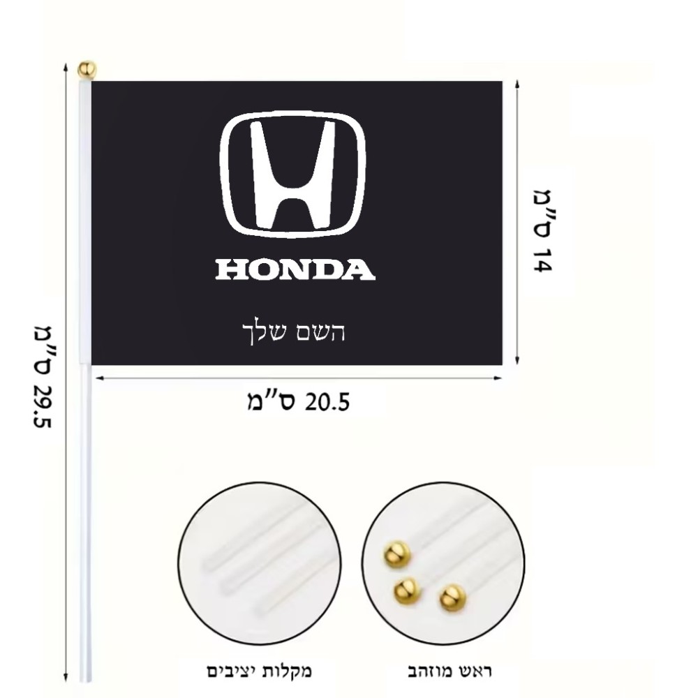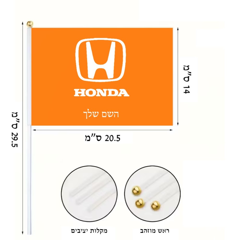 דיגלון בעיצוב אישי עם השם שלך בעיצוב הונדה 2 גודל הדיגלון 20.5 × 14 ס"מ, ההדפסה מתבצעת בשני צידי הדגל, את השם המבוקש ניתן לציין בהזמנה, אם לא צויין אנחנו ניצור קשר לבירור.