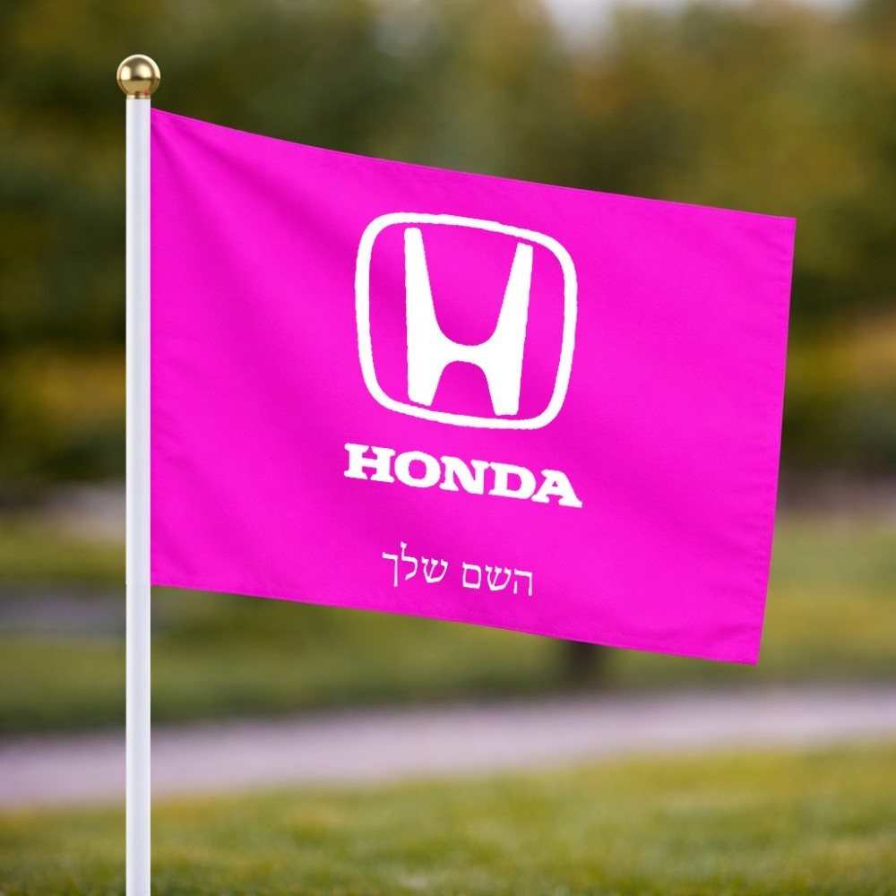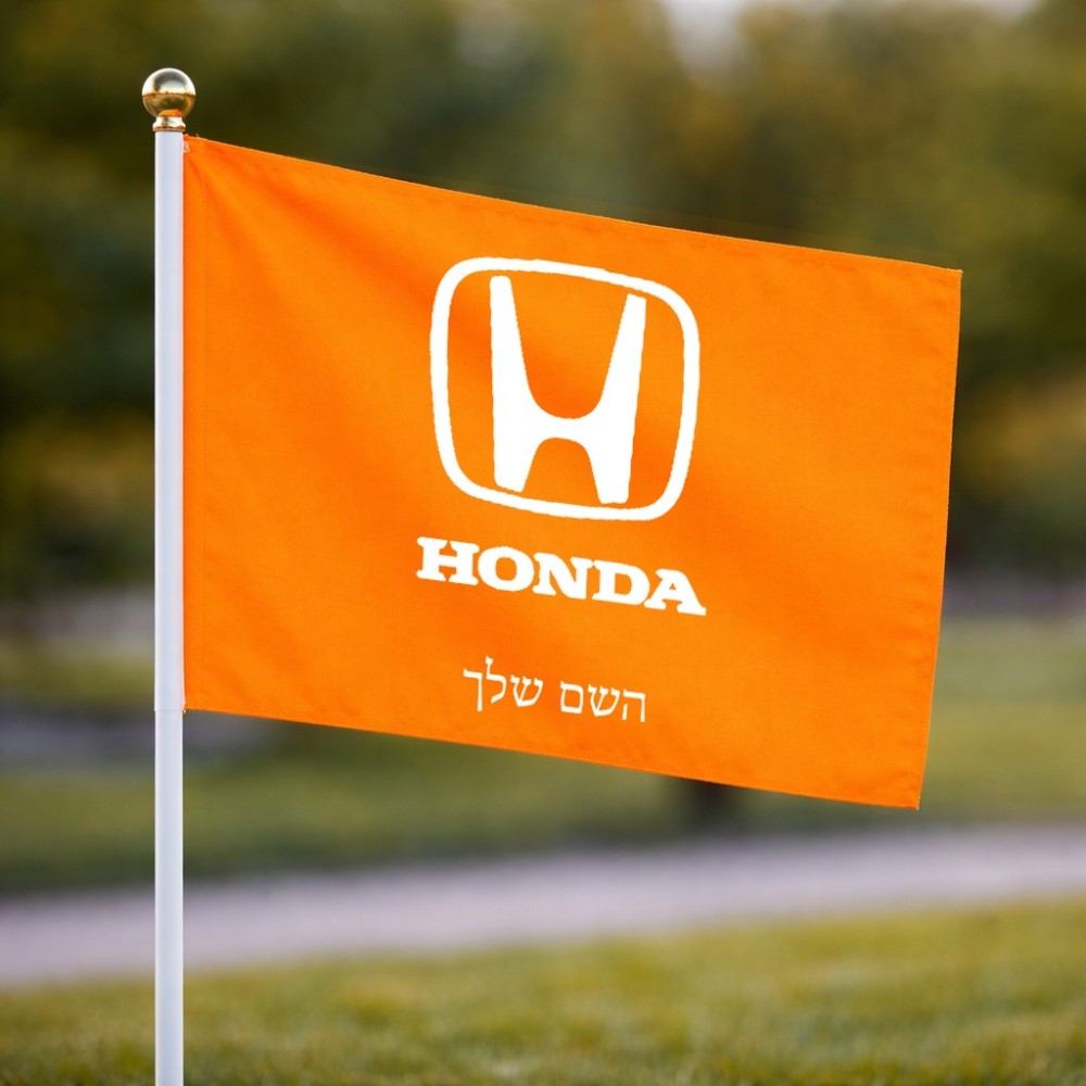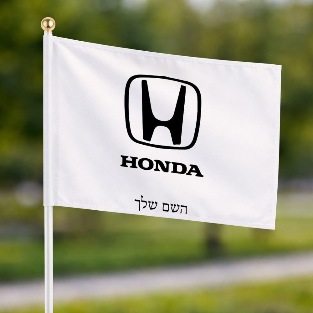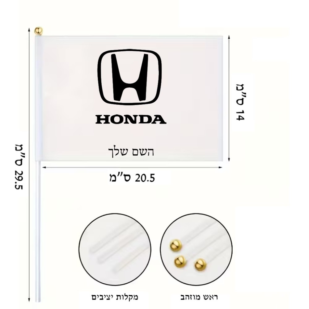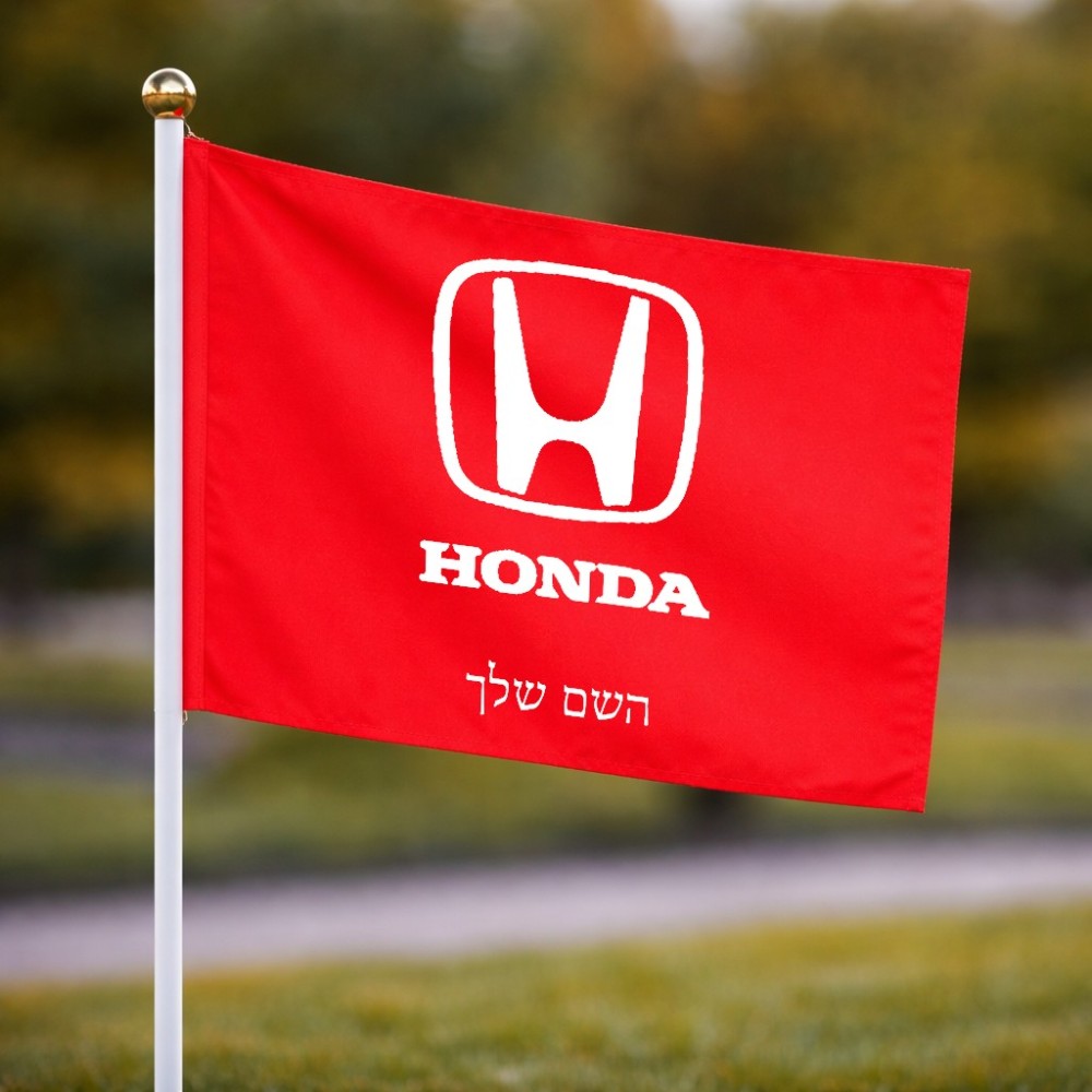 דיגלון בעיצוב אישי עם השם שלך בעיצוב הונדה 2 גודל הדיגלון 20.5 × 14 ס"מ, ההדפסה מתבצעת בשני צידי הדגל, את השם המבוקש ניתן לציין בהזמנה, אם לא צויין אנחנו ניצור קשר לבירור.