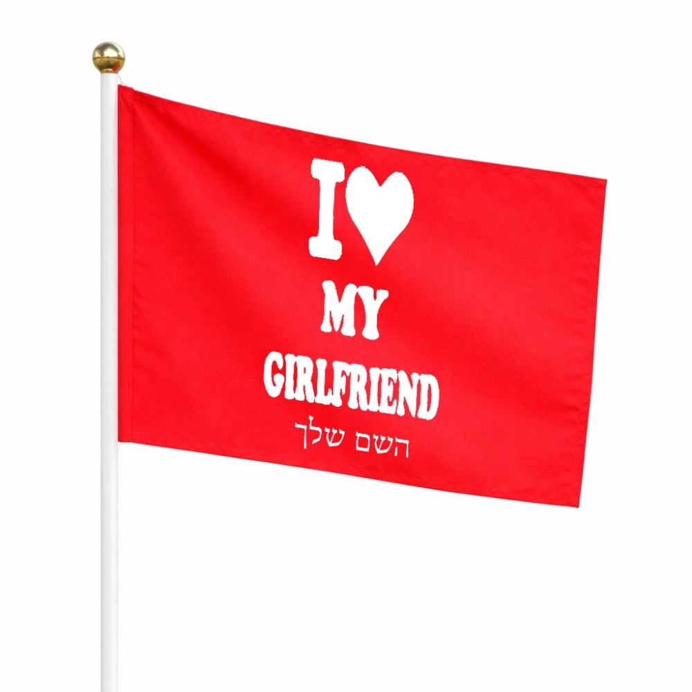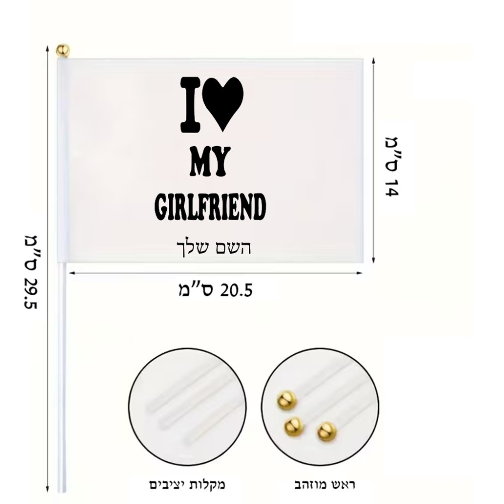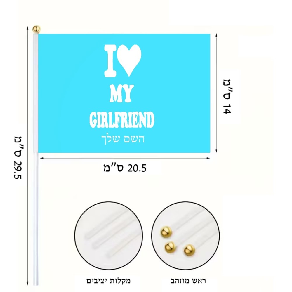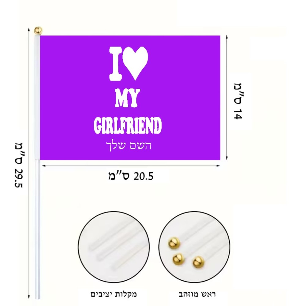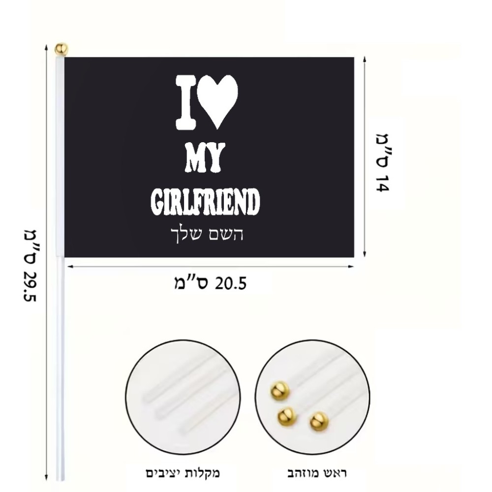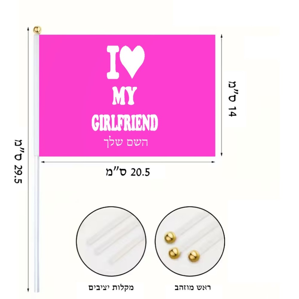 דיגלון בעיצוב אישי עם השם שלך בעיצוב אוהב את החברה שלי גודל הדיגלון 20.5 × 14 ס"מ, ההדפסה מתבצעת בשני צידי הדגל, את השם המבוקש ניתן לציין בהזמנה, אם לא צויין אנחנו ניצור קשר לבירור.