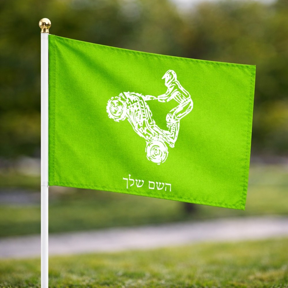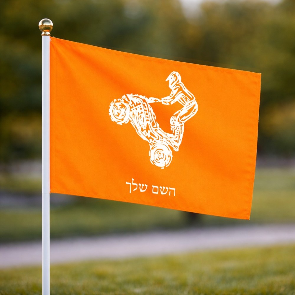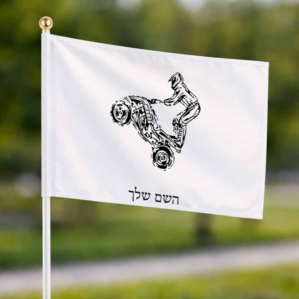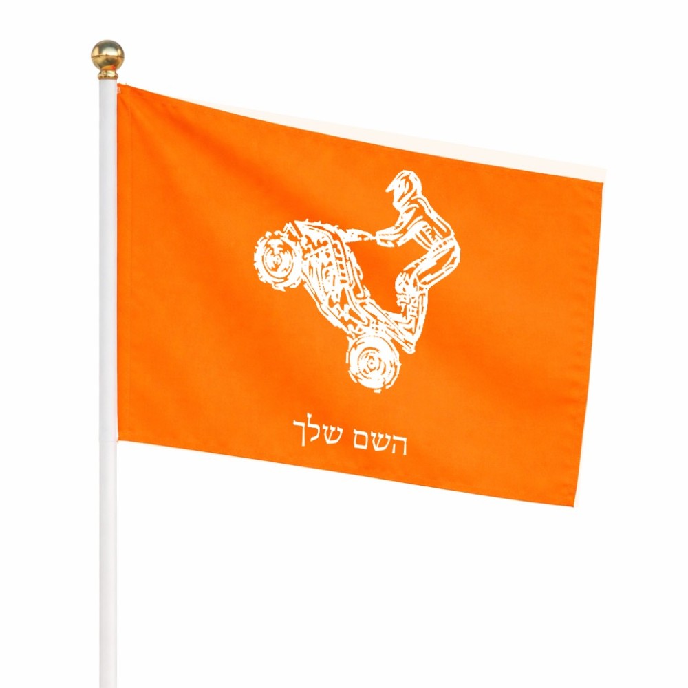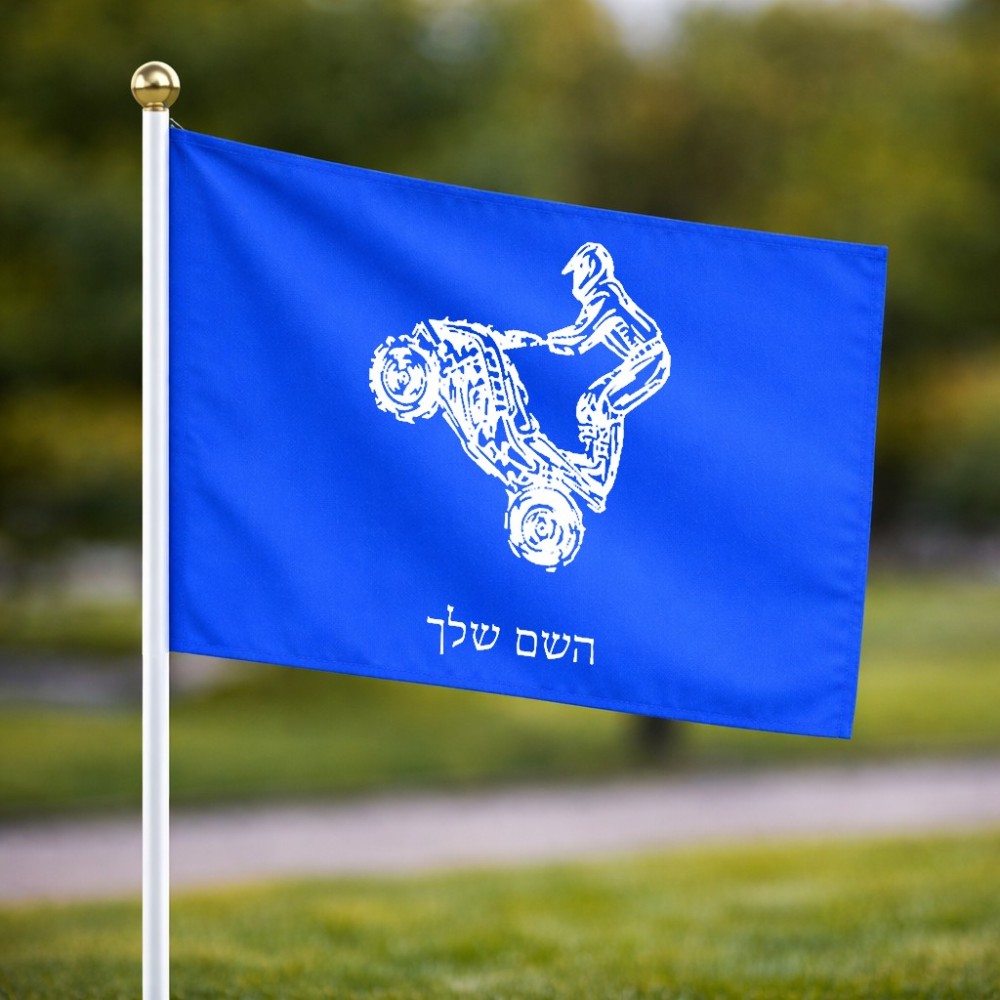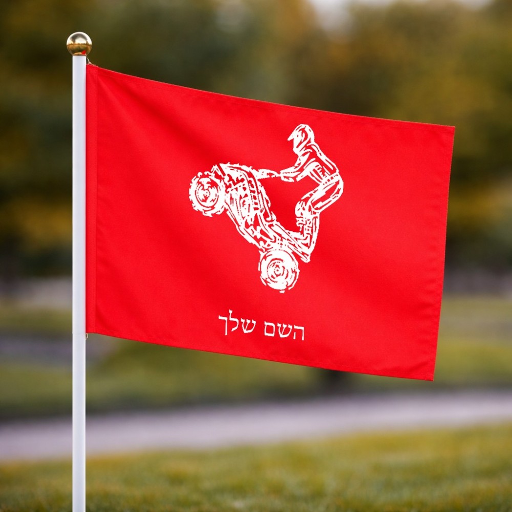 דיגלון בעיצוב אישי עם השם שלך בעיצוב רוכב טרקטורונים גודל הדיגלון 20.5 × 14 ס"מ, ההדפסה מתבצעת בשני צידי הדגל, את השם המבוקש ניתן לציין בהזמנה, אם לא צויין אנחנו ניצור קשר לבירור.
