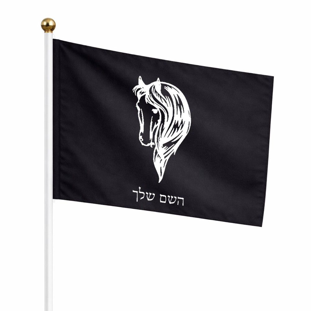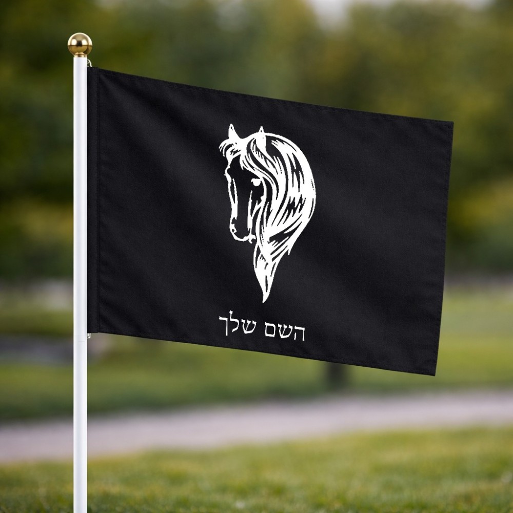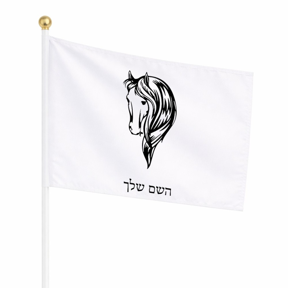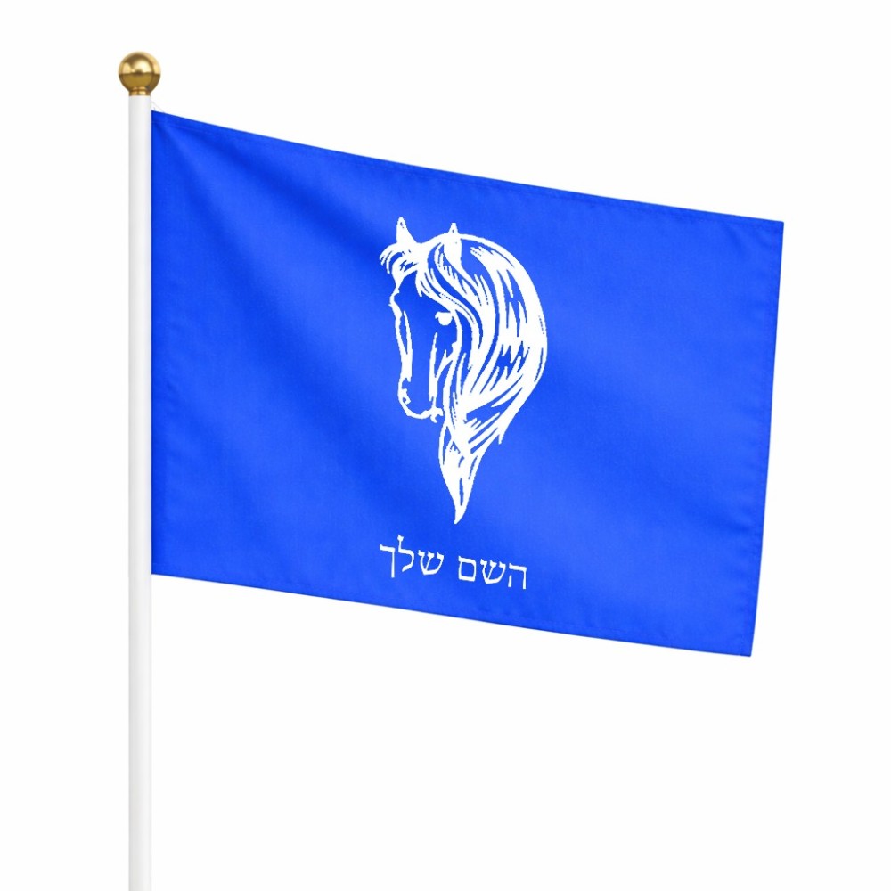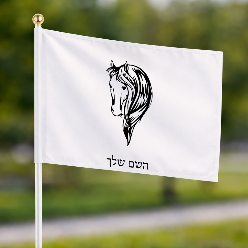 דיגלון בעיצוב אישי עם השם שלך בעיצוב ראש סוס גודל הדיגלון 20.5 × 14 ס"מ, ההדפסה מתבצעת בשני צידי הדגל, את השם המבוקש ניתן לציין בהזמנה, אם לא צויין אנחנו ניצור קשר לבירור.
