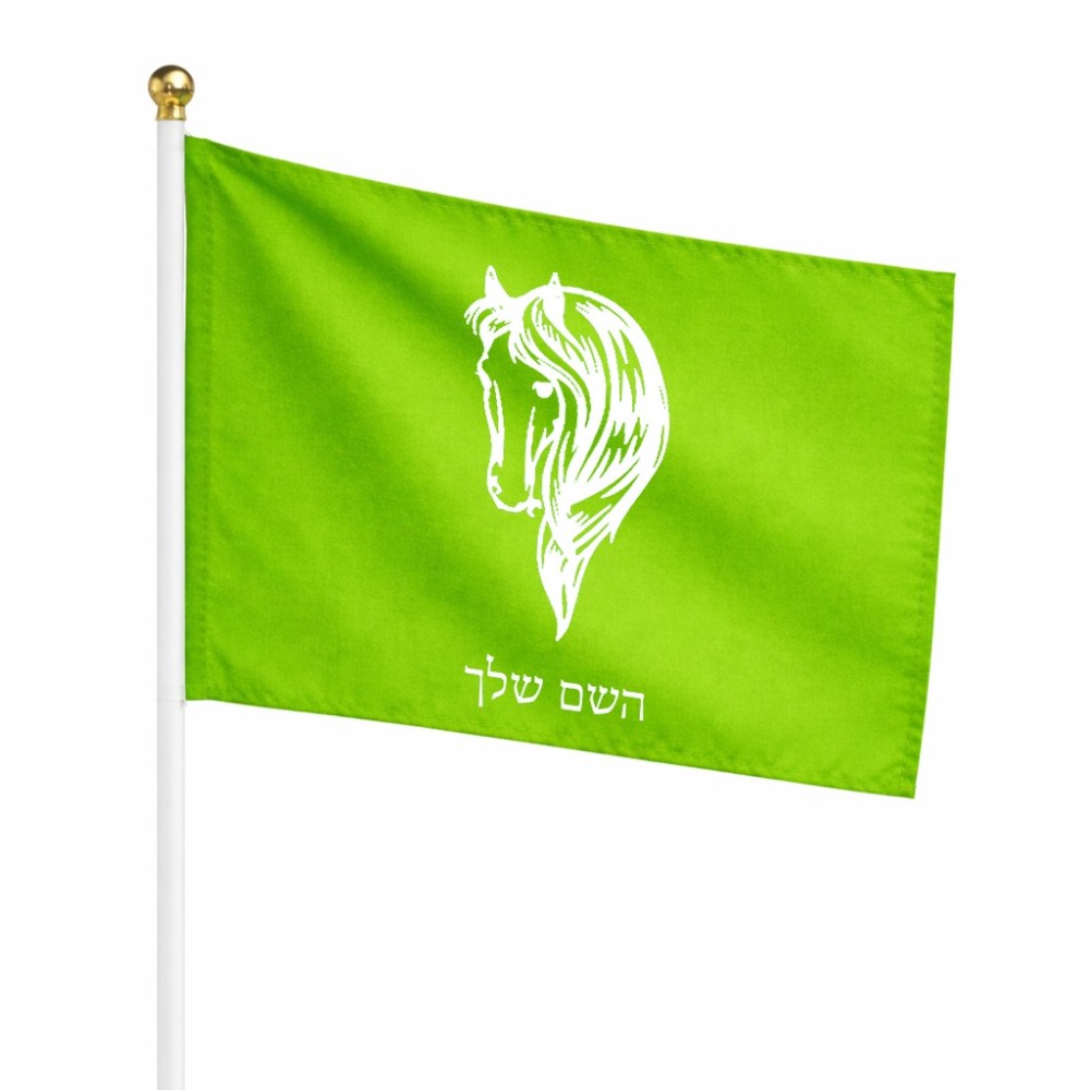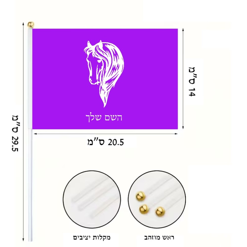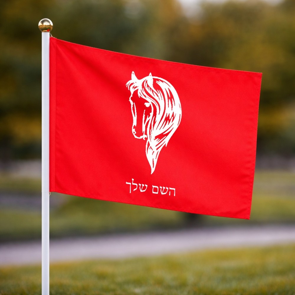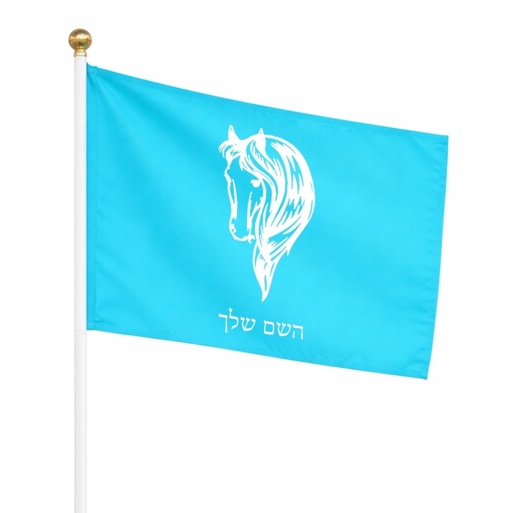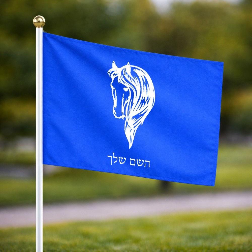 דיגלון בעיצוב אישי עם השם שלך בעיצוב ראש סוס גודל הדיגלון 20.5 × 14 ס"מ, ההדפסה מתבצעת בשני צידי הדגל, את השם המבוקש ניתן לציין בהזמנה, אם לא צויין אנחנו ניצור קשר לבירור.