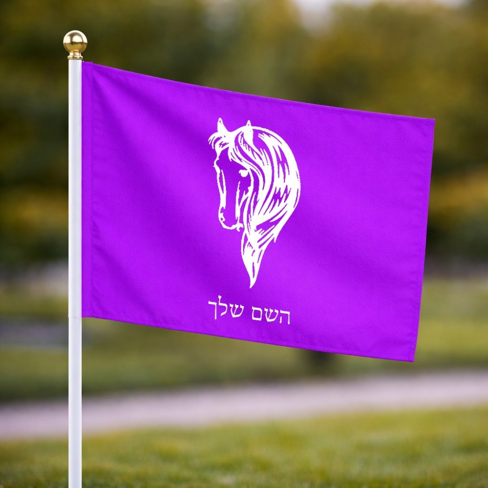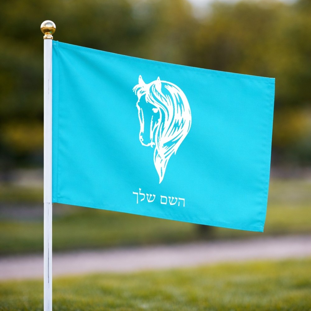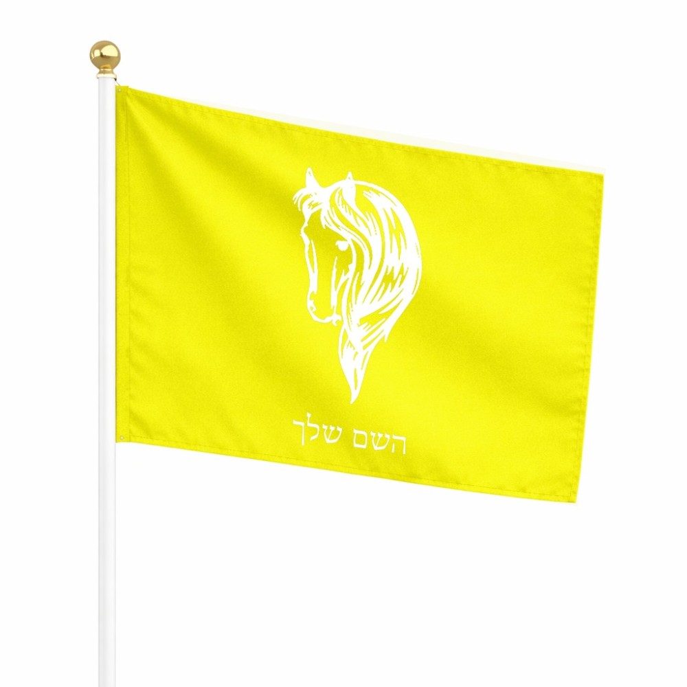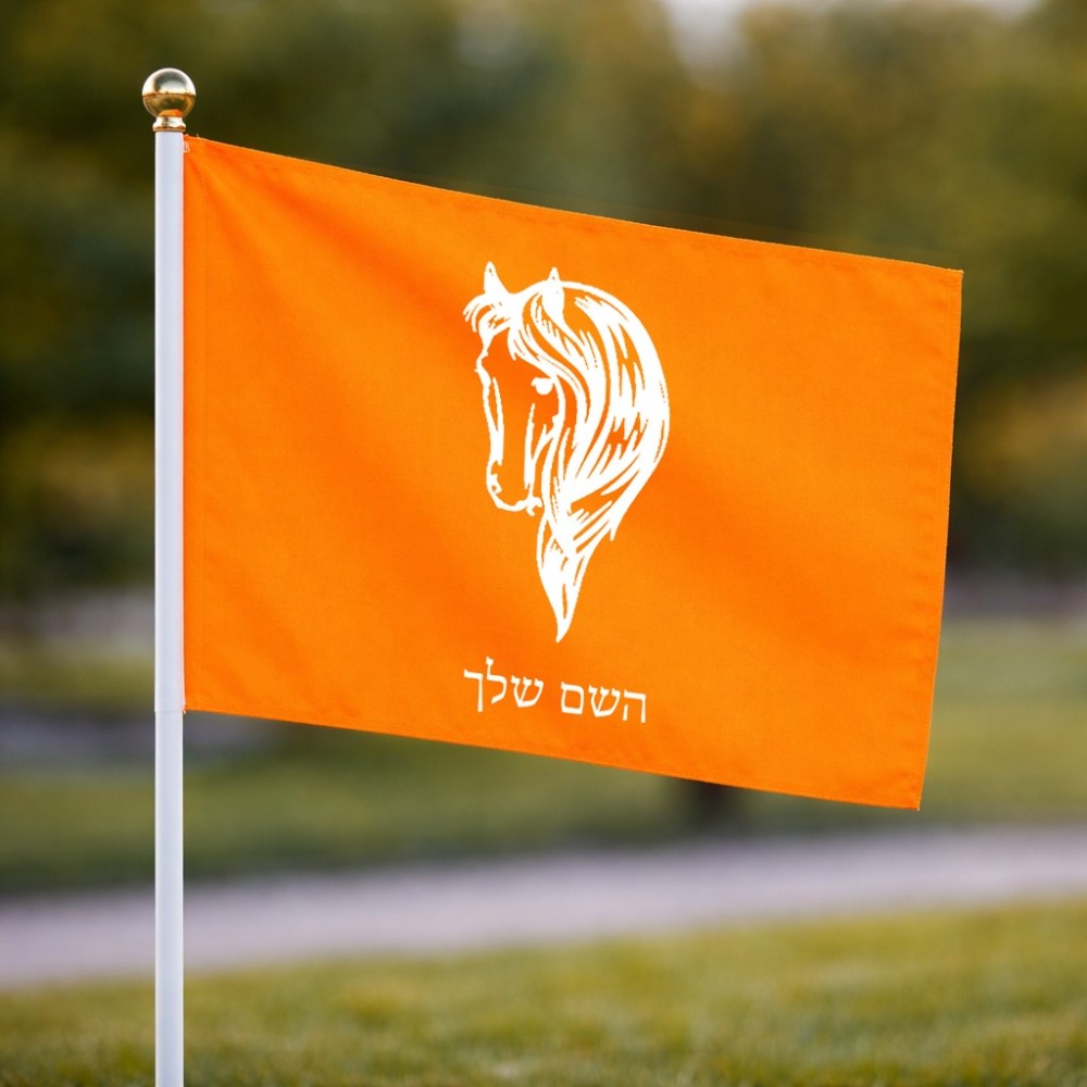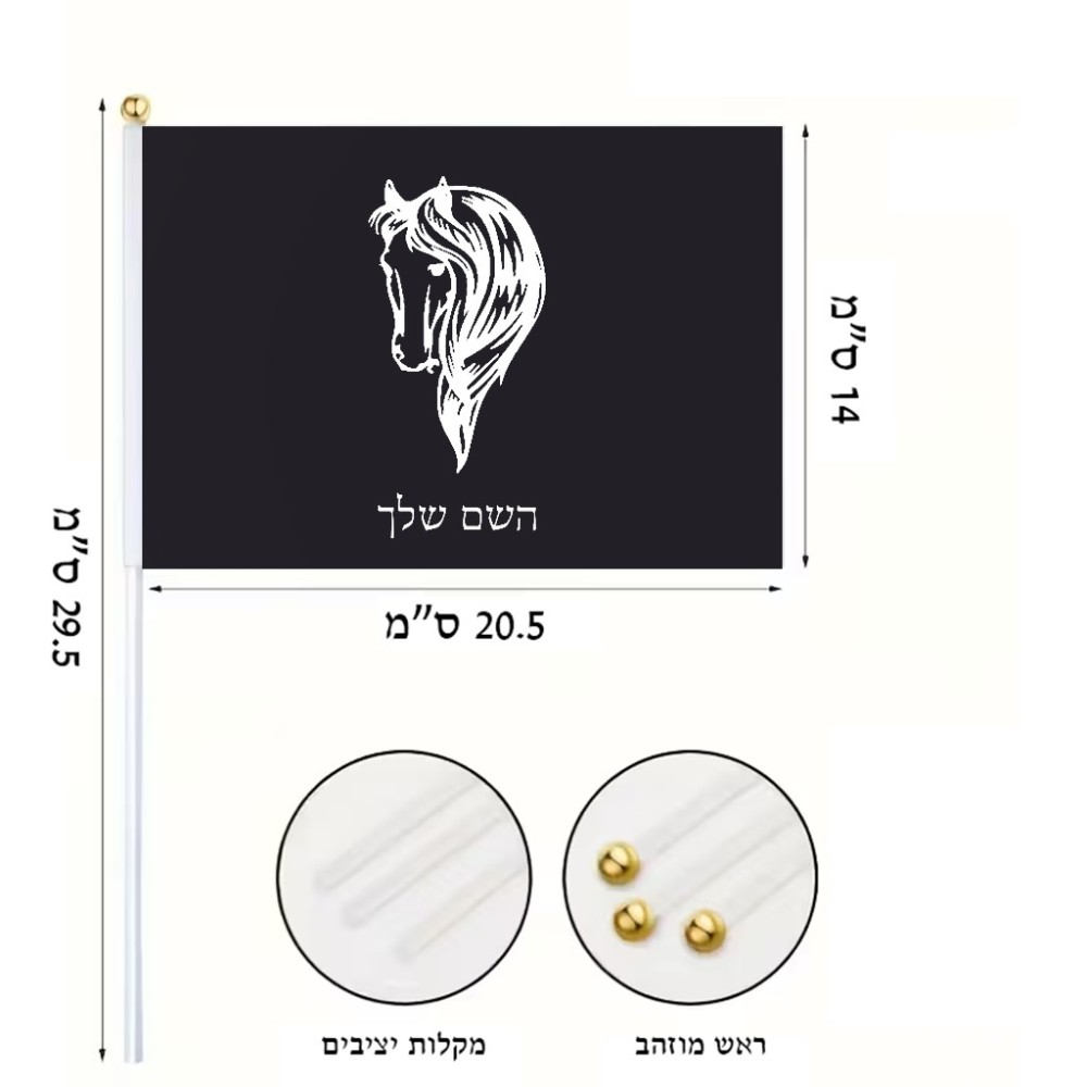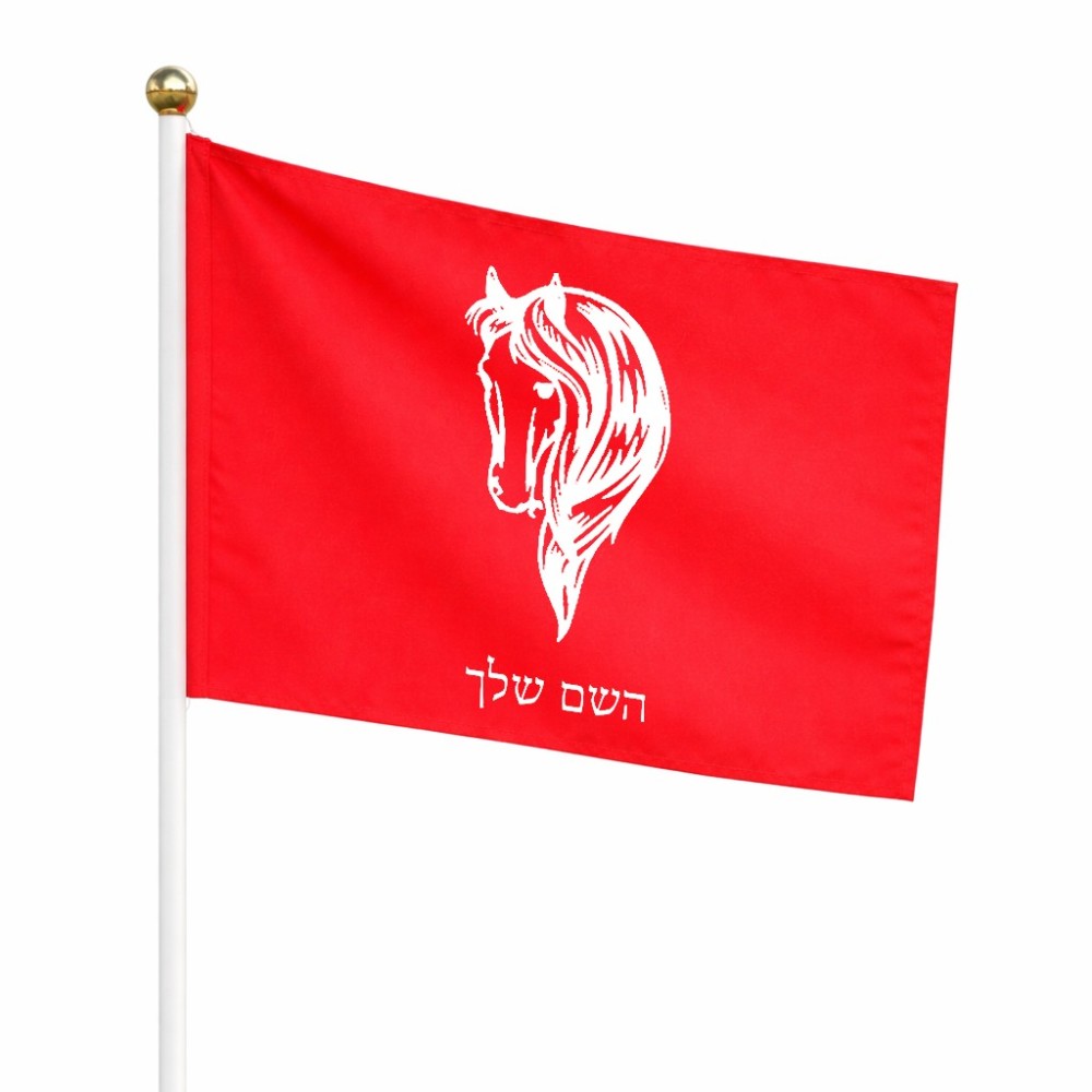 דיגלון בעיצוב אישי עם השם שלך בעיצוב ראש סוס גודל הדיגלון 20.5 × 14 ס"מ, ההדפסה מתבצעת בשני צידי הדגל, את השם המבוקש ניתן לציין בהזמנה, אם לא צויין אנחנו ניצור קשר לבירור.