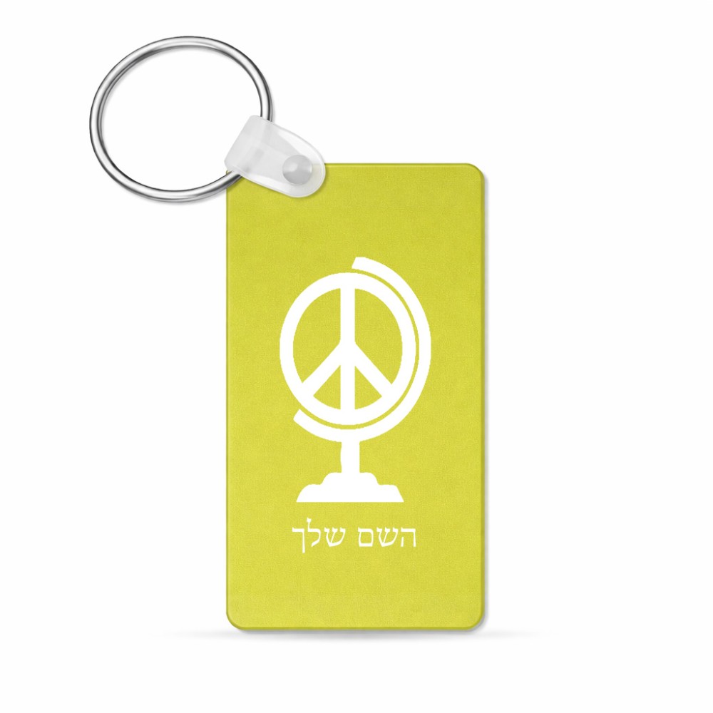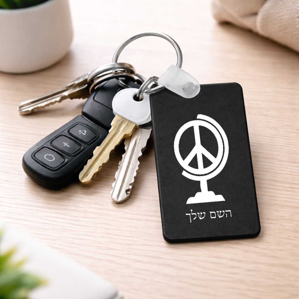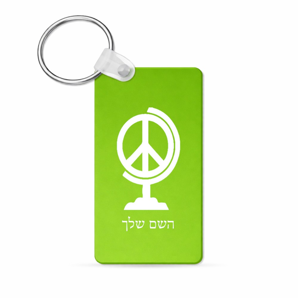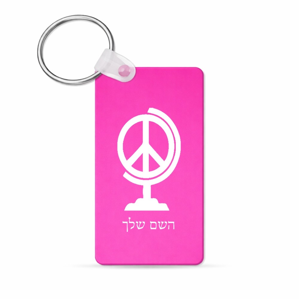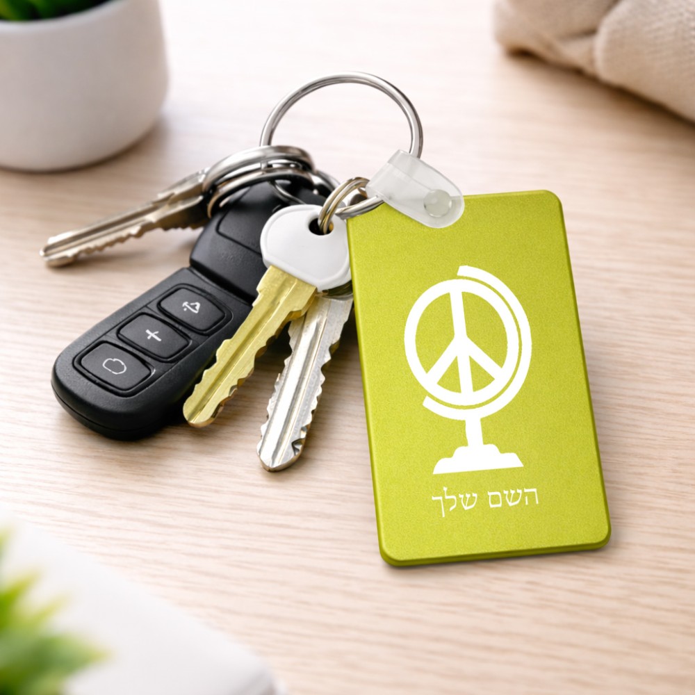מחזיק מפתחות בצורת מלבן בעיצוב אישי עם השם שלך בעיצוב גלובוסי שלום גודל המחזיק 6 × 4 ס"מ. את השם המבוקש ניתן לציין בהזמנה, אם לא צויין אנחנו ניצור קשר לבירור.