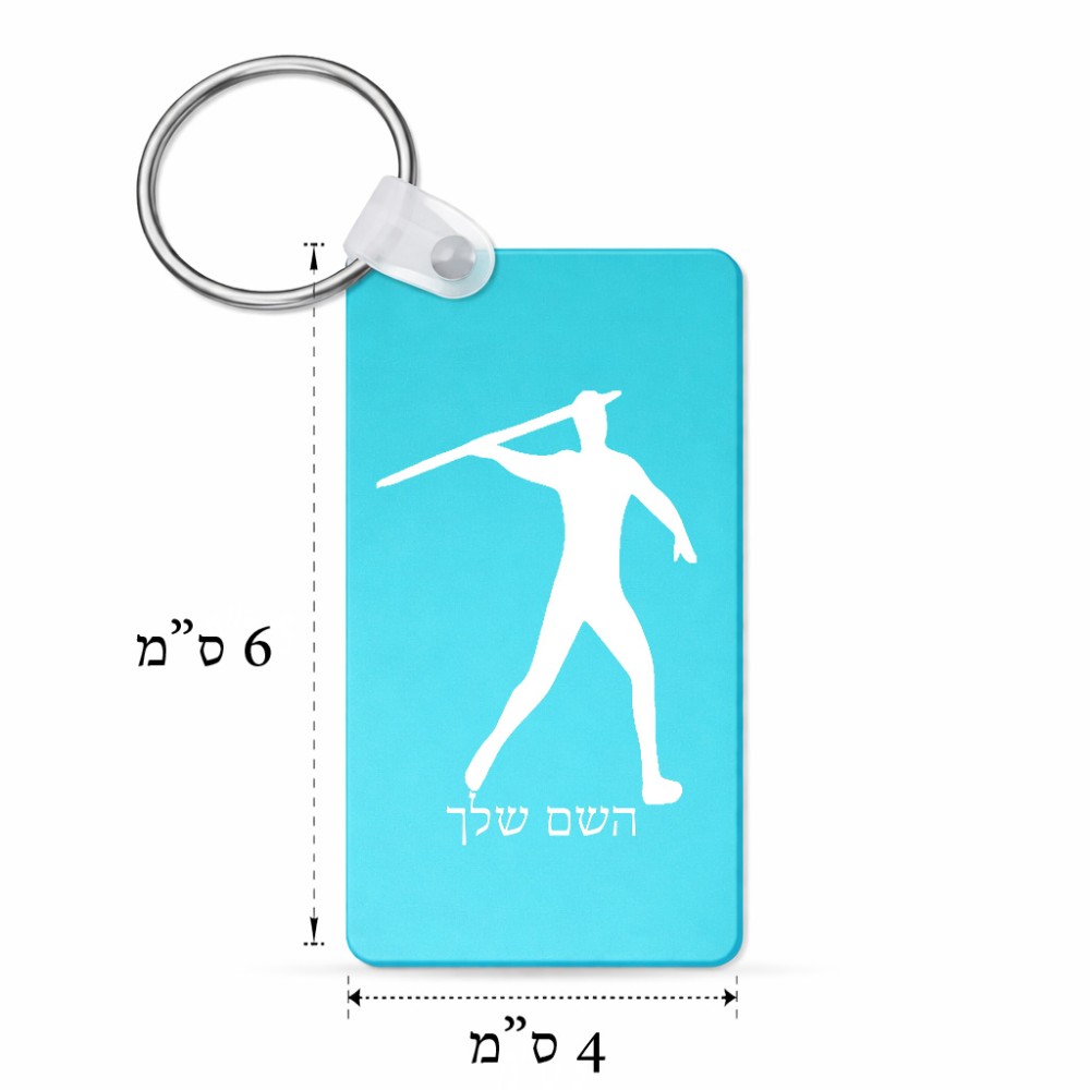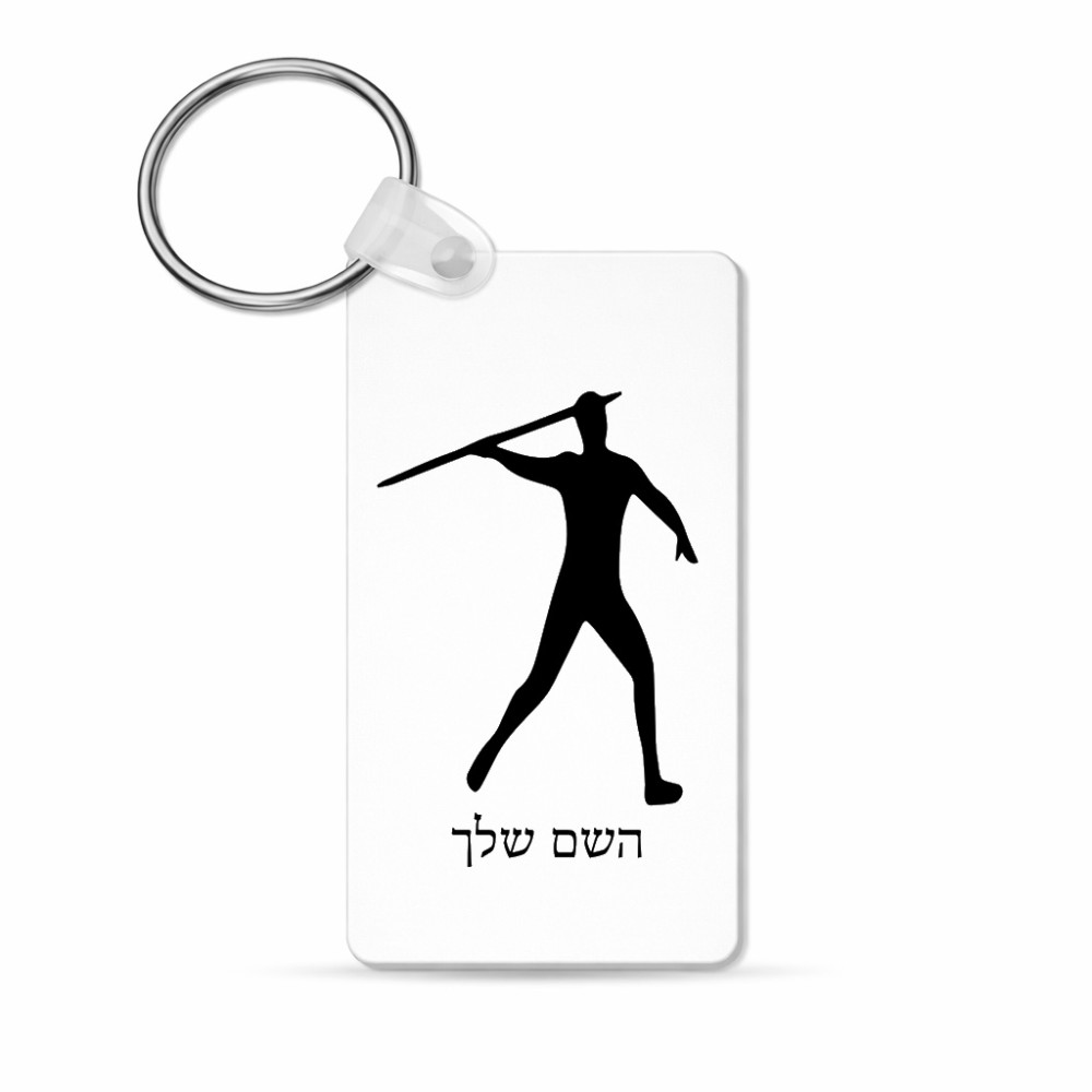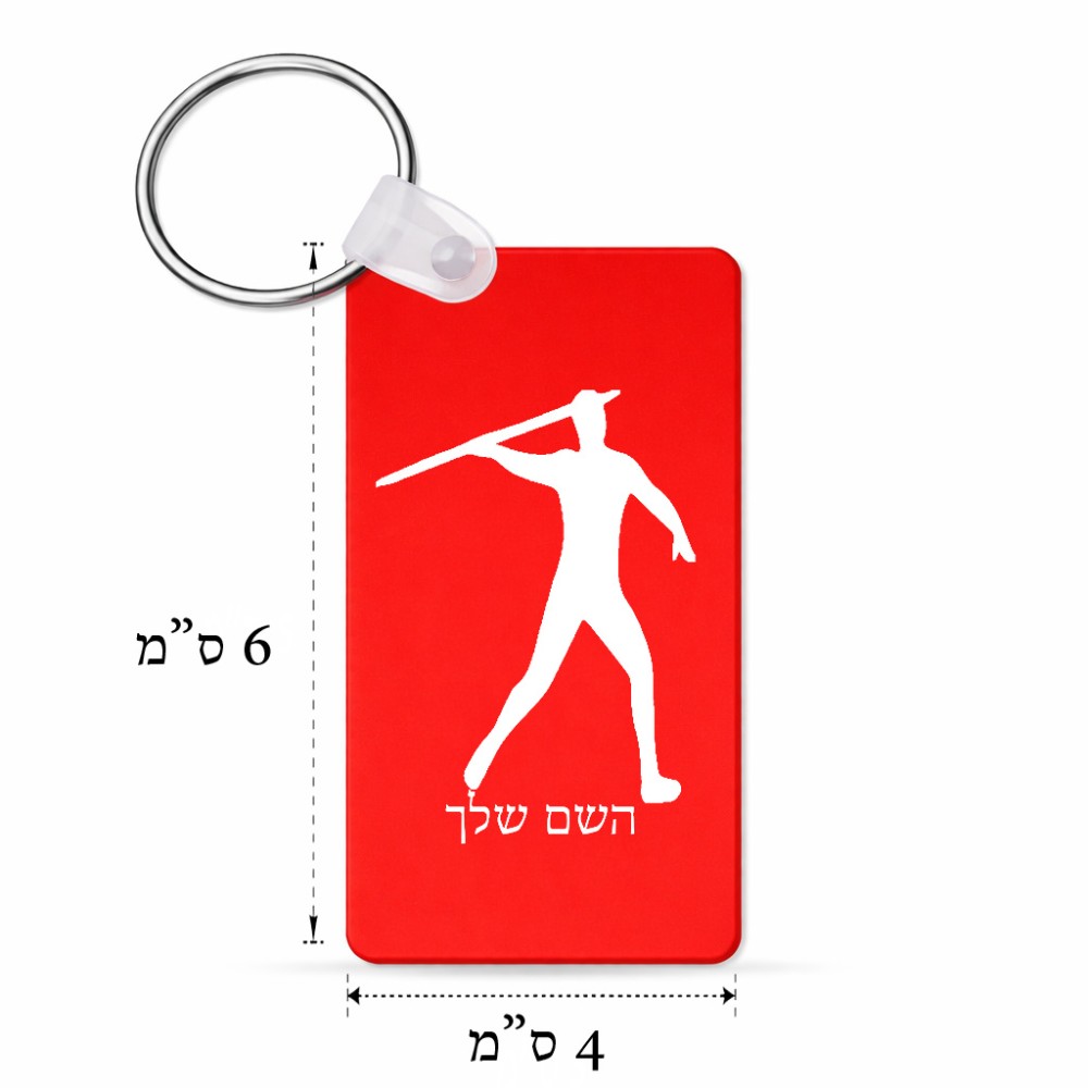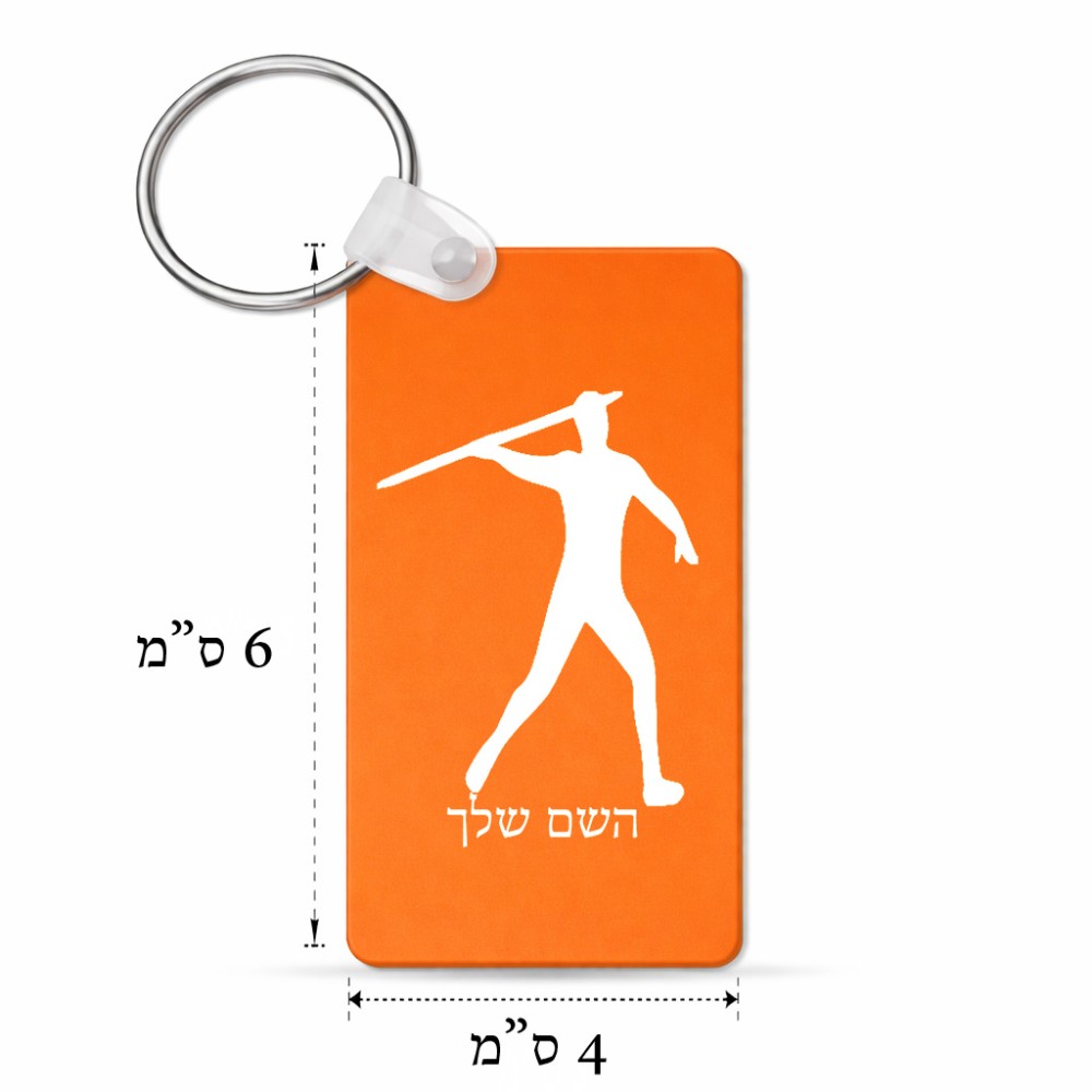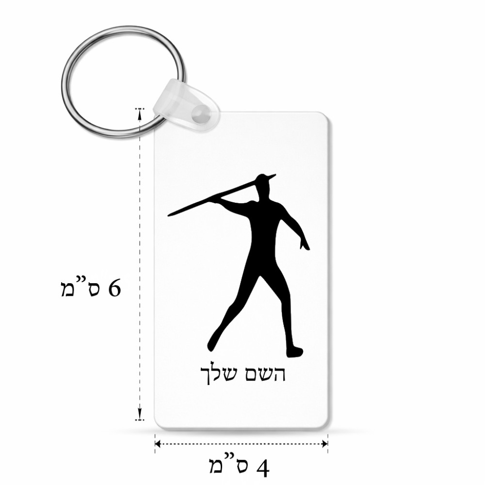 מחזיק מפתחות בצורת מלבן בעיצוב אישי עם השם שלך בעיצוב זורק כידון גודל המחזיק 6 × 4 ס"מ. את השם המבוקש ניתן לציין בהזמנה, אם לא צויין אנחנו ניצור קשר לבירור.