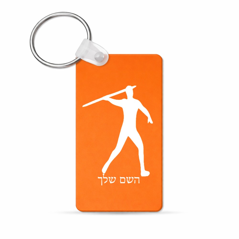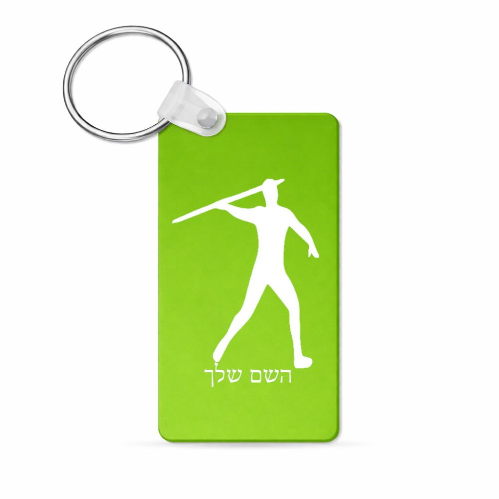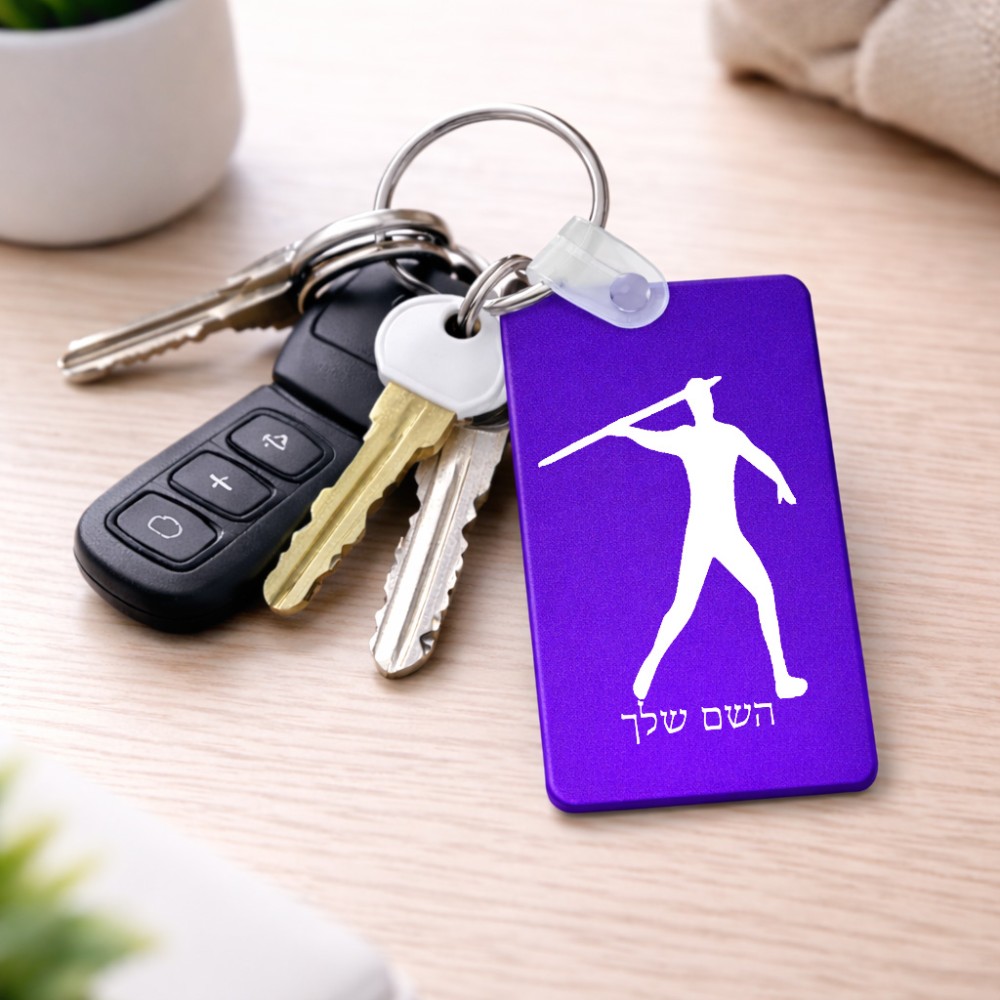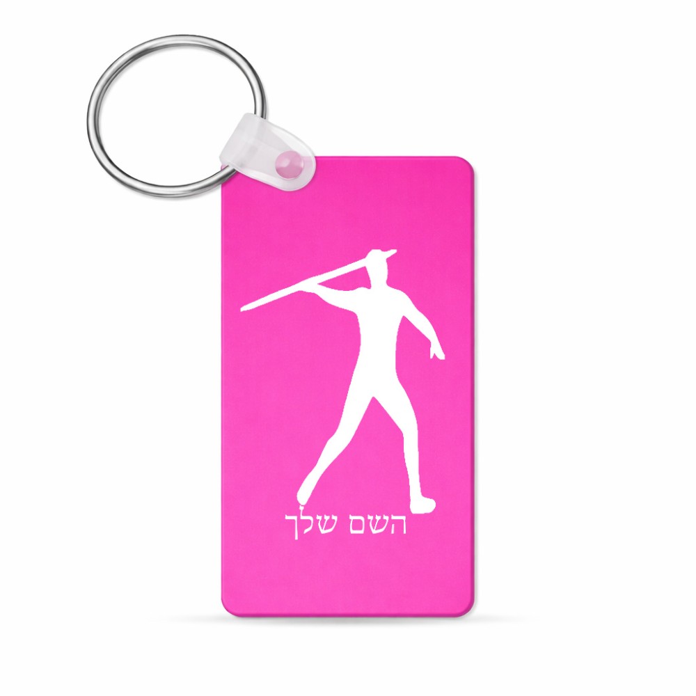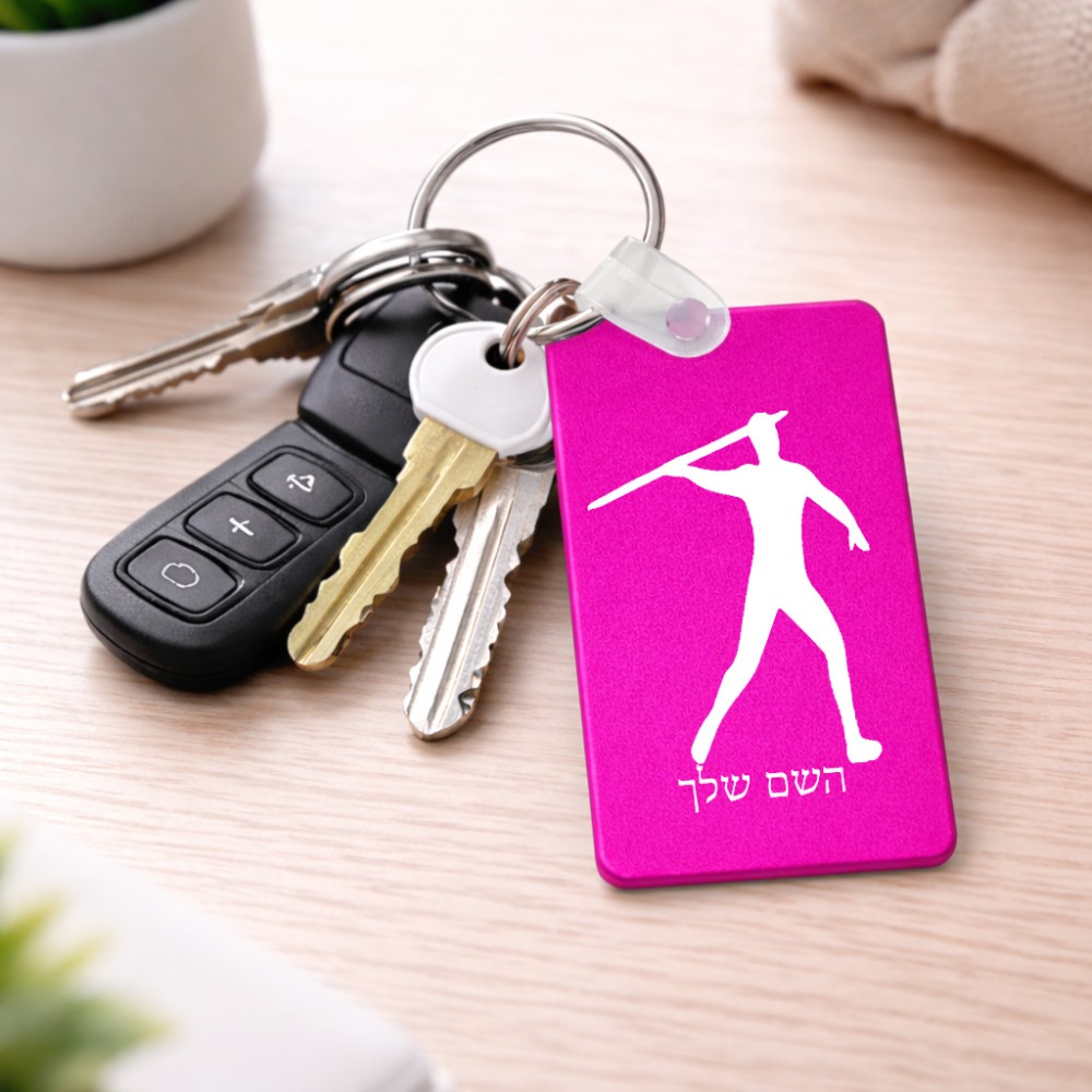 מחזיק מפתחות בצורת מלבן בעיצוב אישי עם השם שלך בעיצוב זורק כידון גודל המחזיק 6 × 4 ס"מ. את השם המבוקש ניתן לציין בהזמנה, אם לא צויין אנחנו ניצור קשר לבירור.