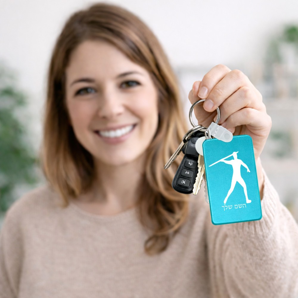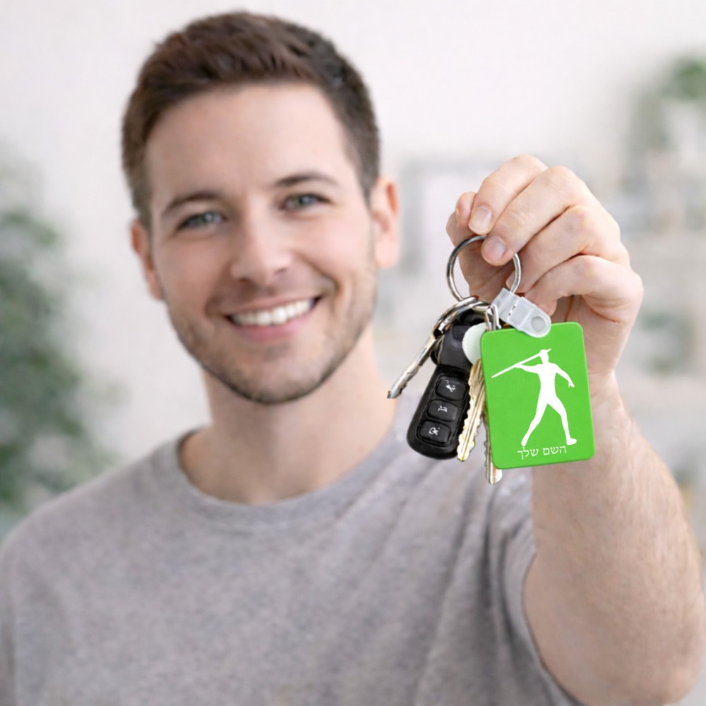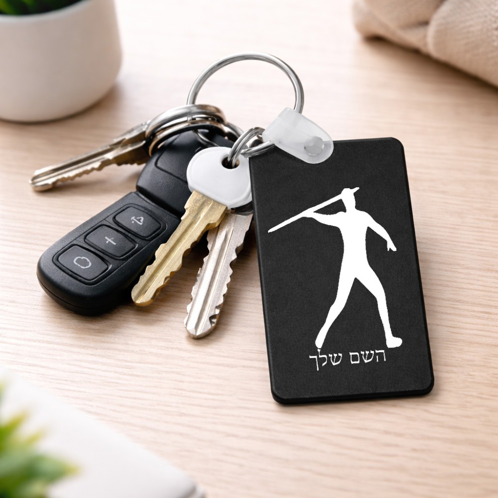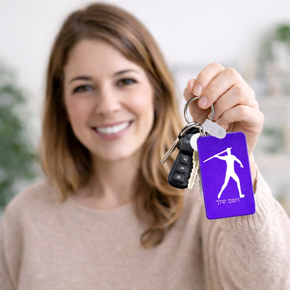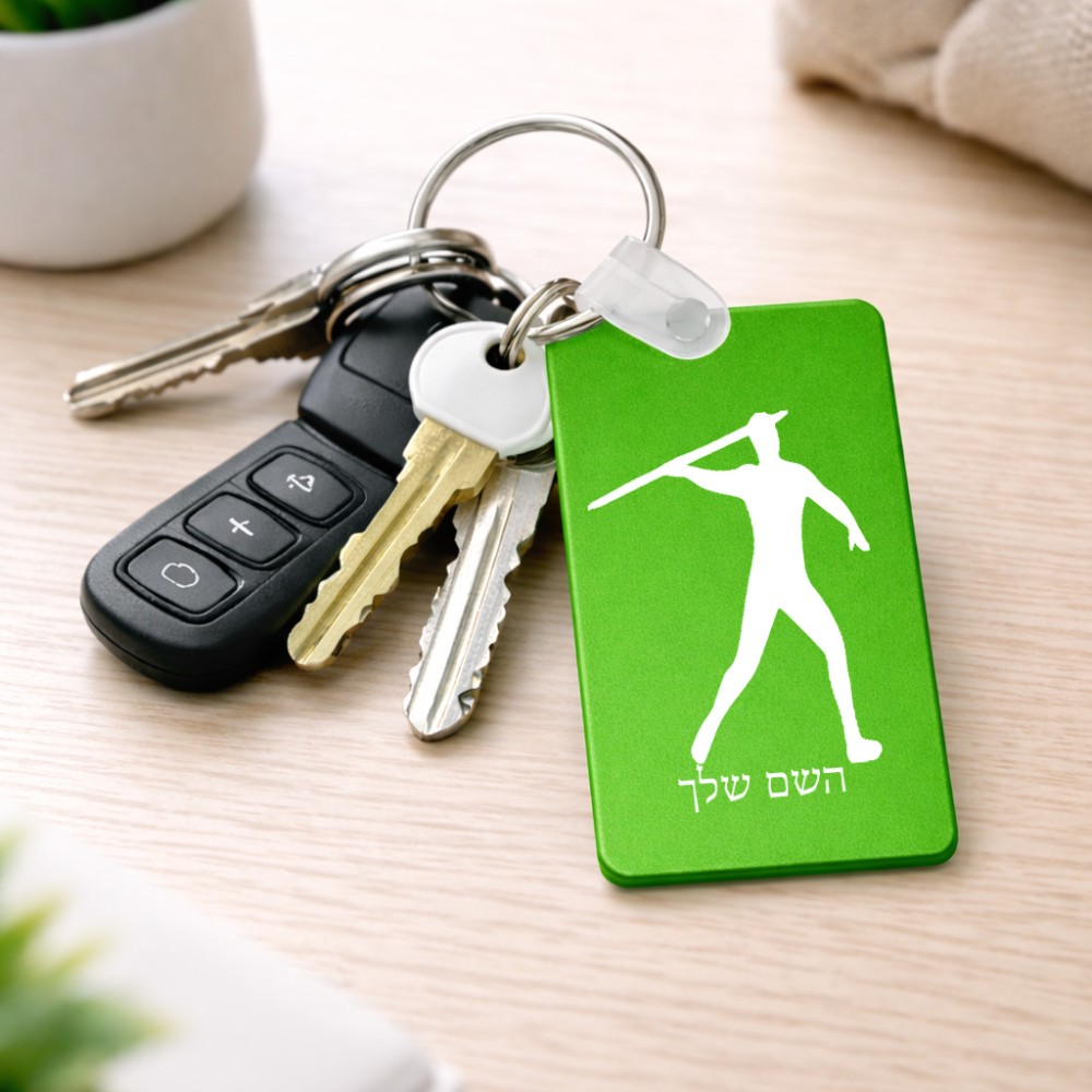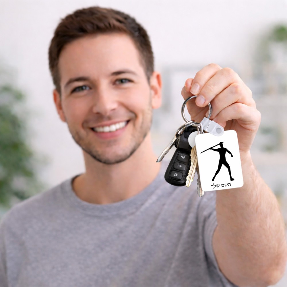 מחזיק מפתחות בצורת מלבן בעיצוב אישי עם השם שלך בעיצוב זורק כידון גודל המחזיק 6 × 4 ס"מ. את השם המבוקש ניתן לציין בהזמנה, אם לא צויין אנחנו ניצור קשר לבירור.