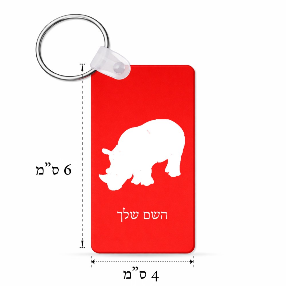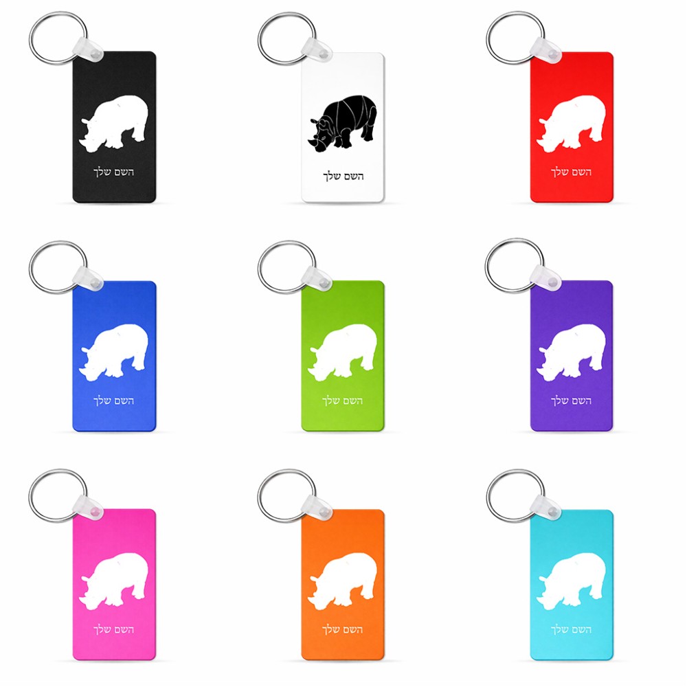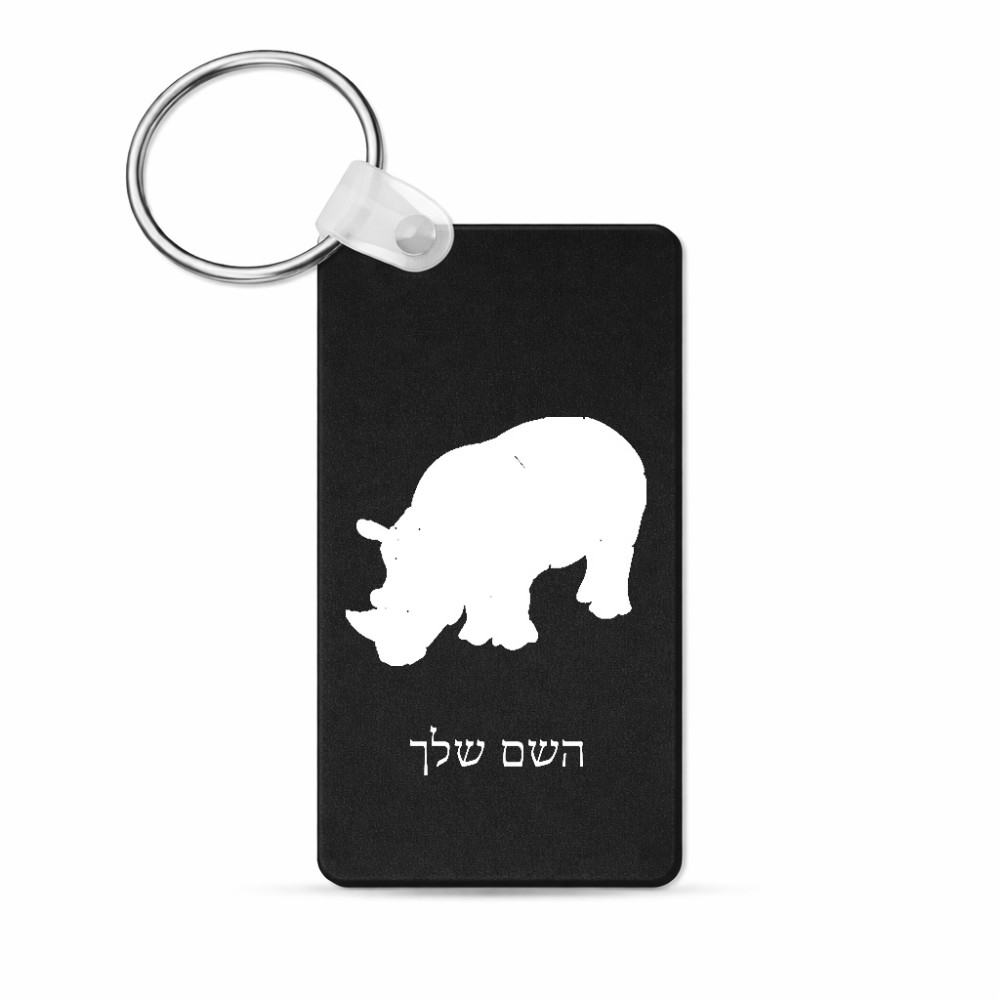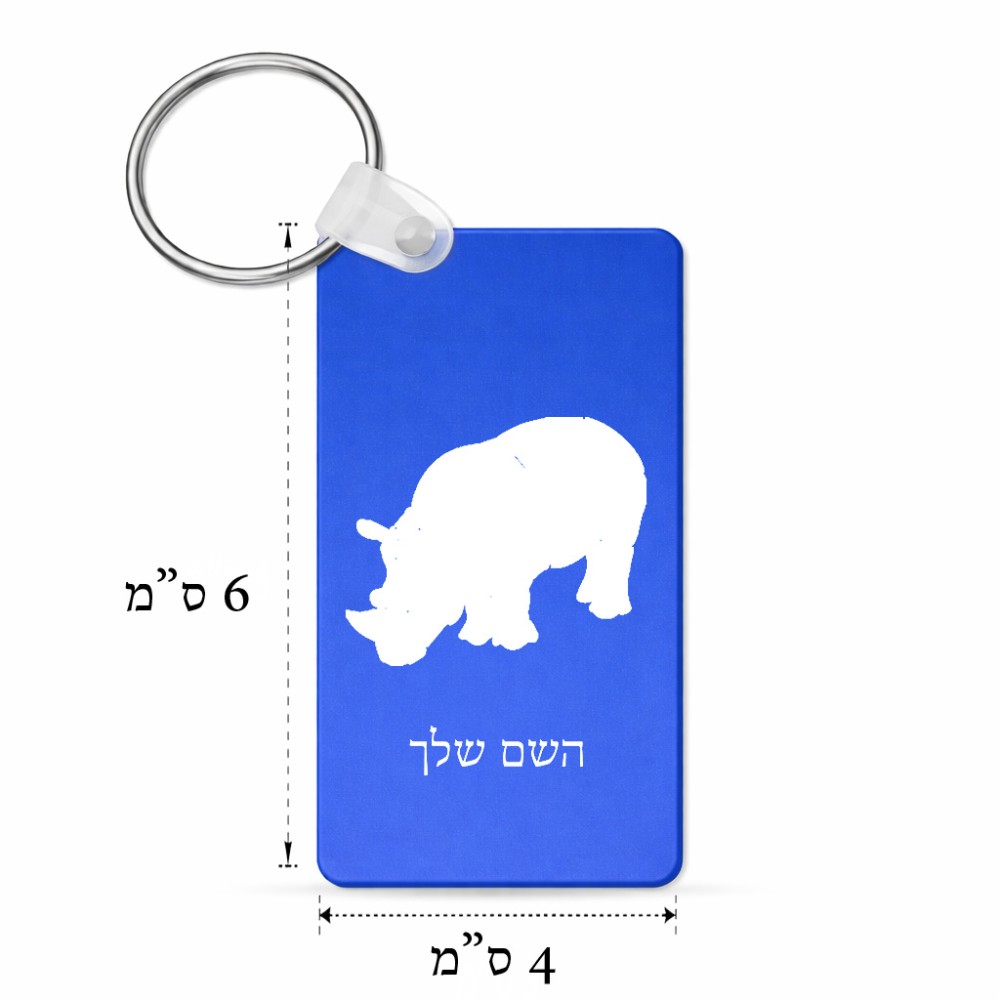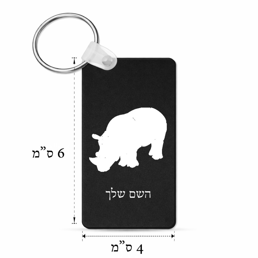 מחזיק מפתחות בצורת מלבן בעיצוב אישי עם השם שלך בעיצוב קרנף גודל המחזיק 6 × 4 ס"מ. את השם המבוקש ניתן לציין בהזמנה, אם לא צויין אנחנו ניצור קשר לבירור.