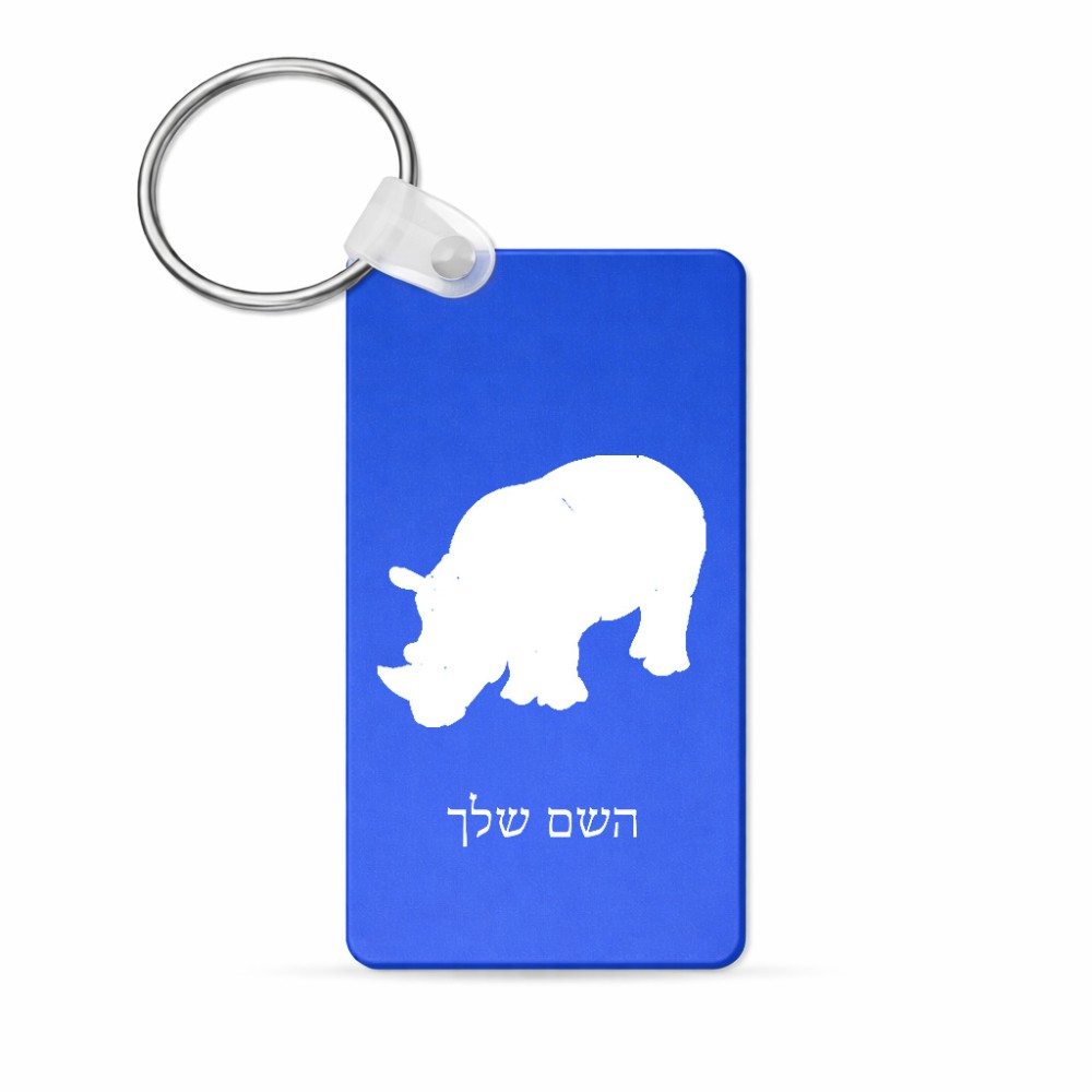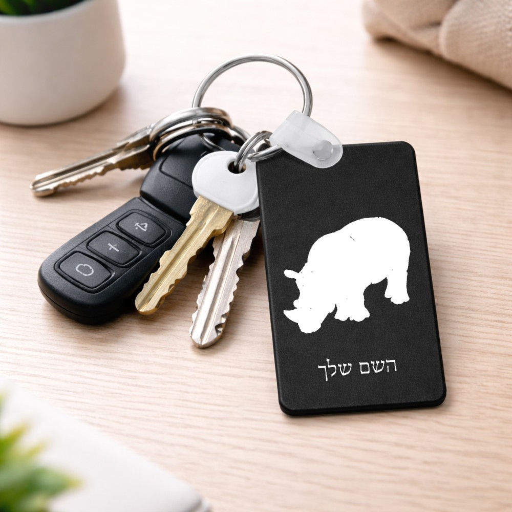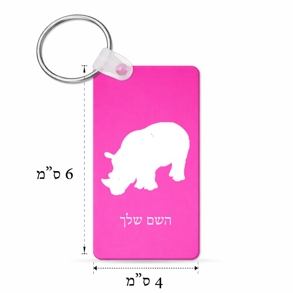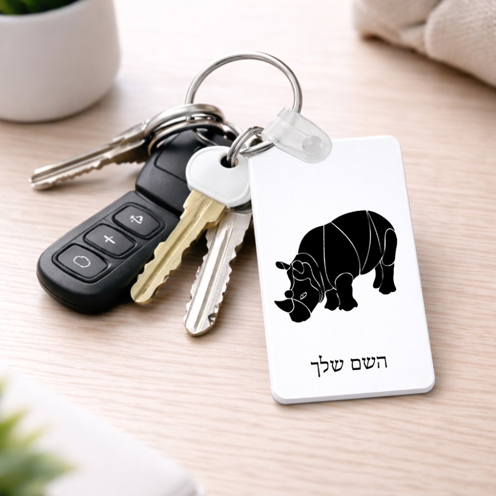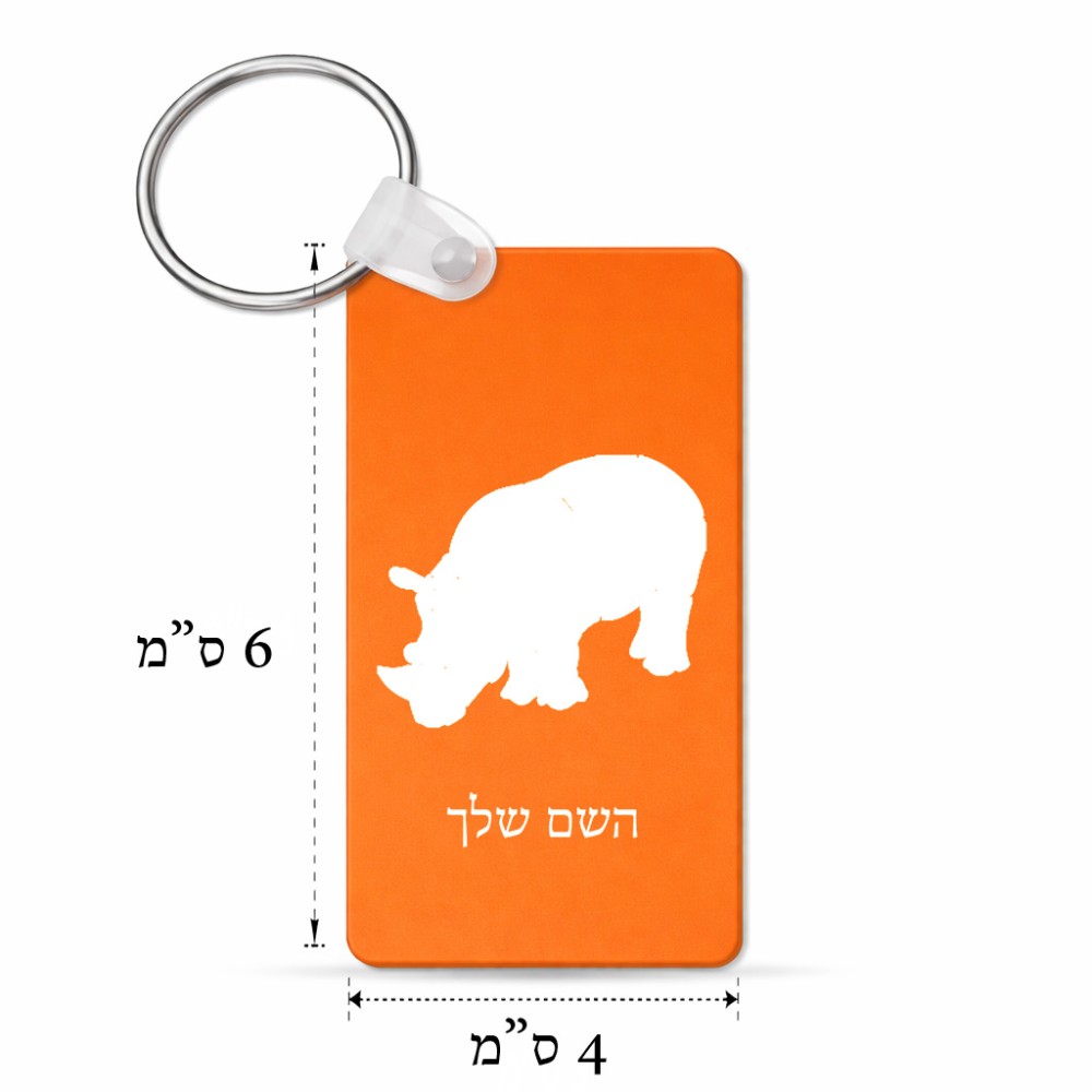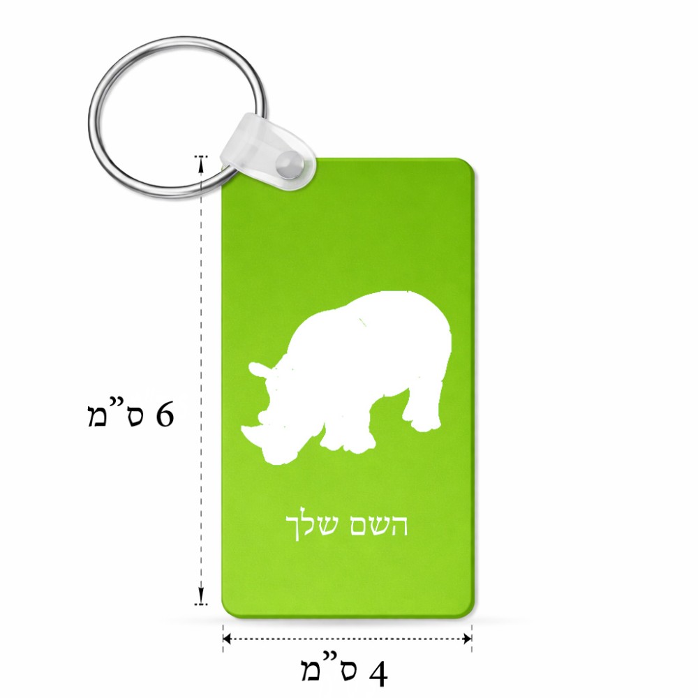 מחזיק מפתחות בצורת מלבן בעיצוב אישי עם השם שלך בעיצוב קרנף גודל המחזיק 6 × 4 ס"מ. את השם המבוקש ניתן לציין בהזמנה, אם לא צויין אנחנו ניצור קשר לבירור.