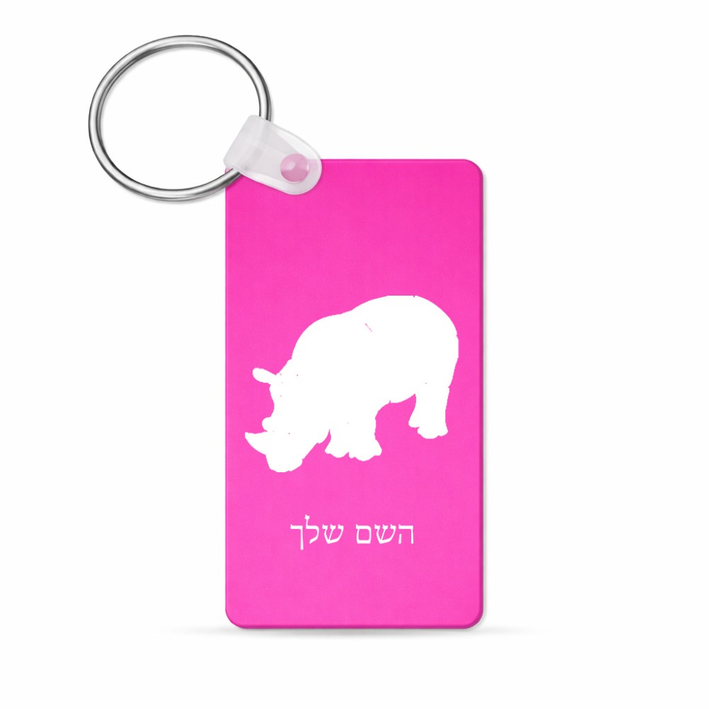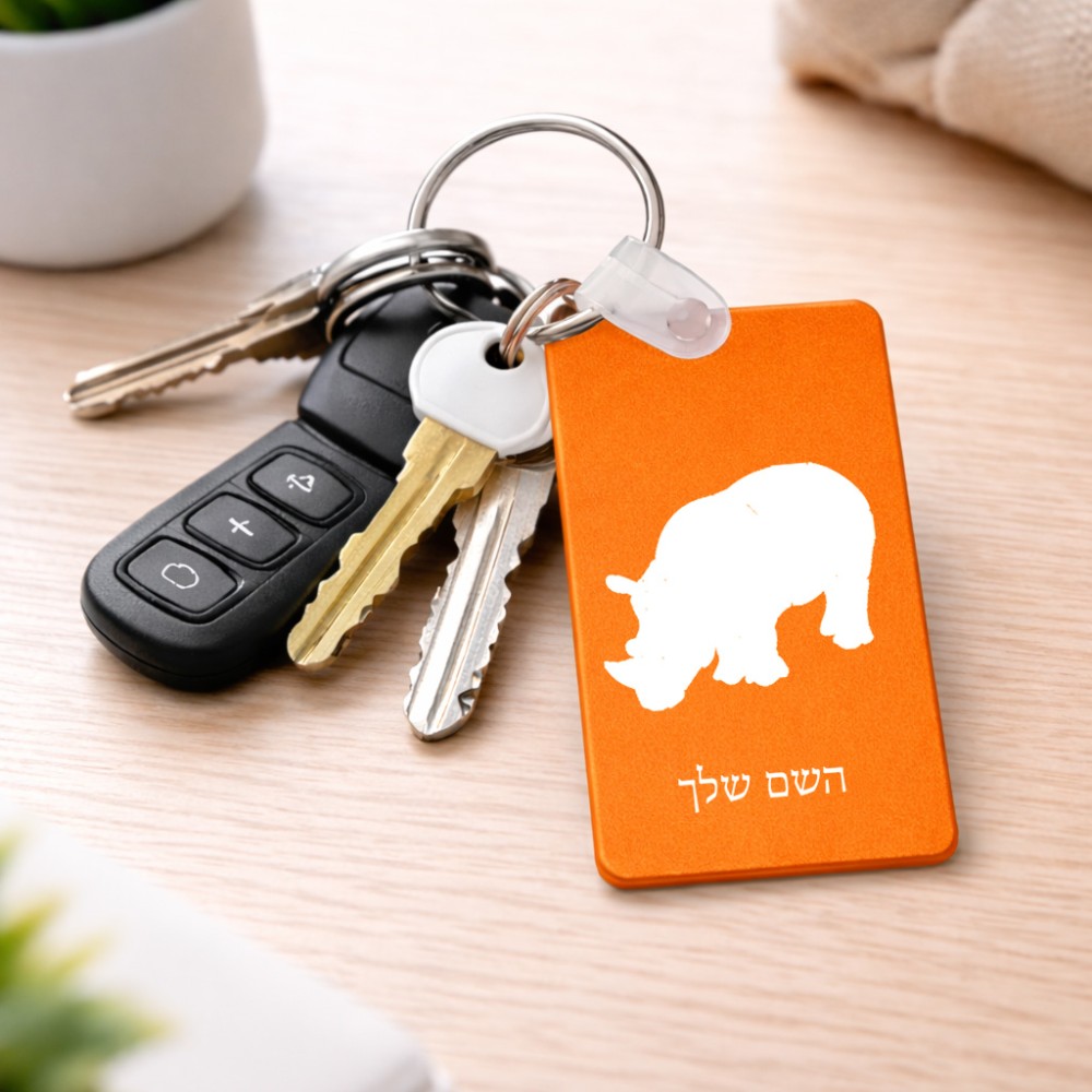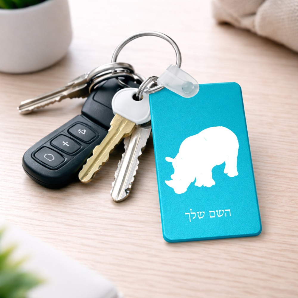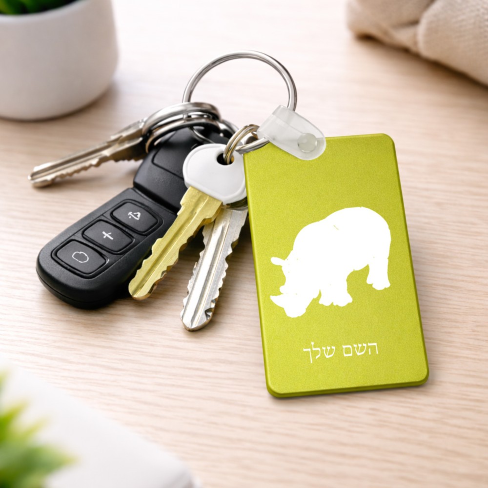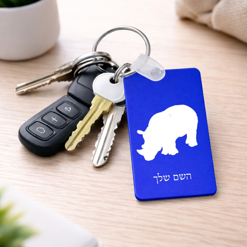 מחזיק מפתחות בצורת מלבן בעיצוב אישי עם השם שלך בעיצוב קרנף גודל המחזיק 6 × 4 ס"מ. את השם המבוקש ניתן לציין בהזמנה, אם לא צויין אנחנו ניצור קשר לבירור.