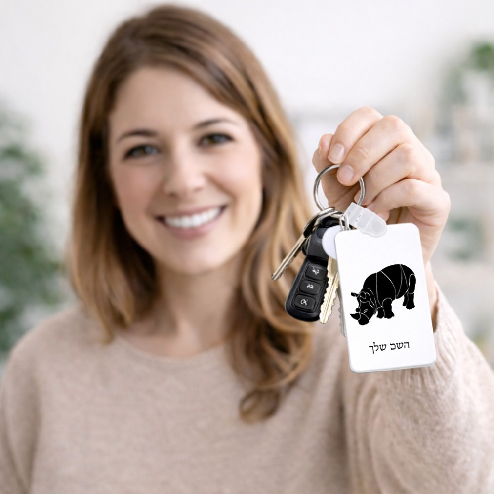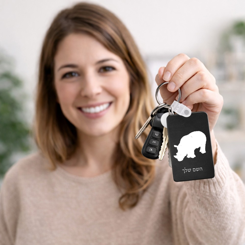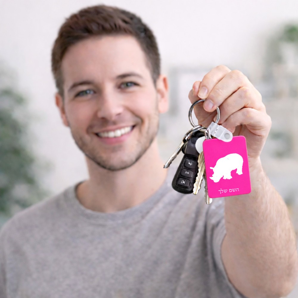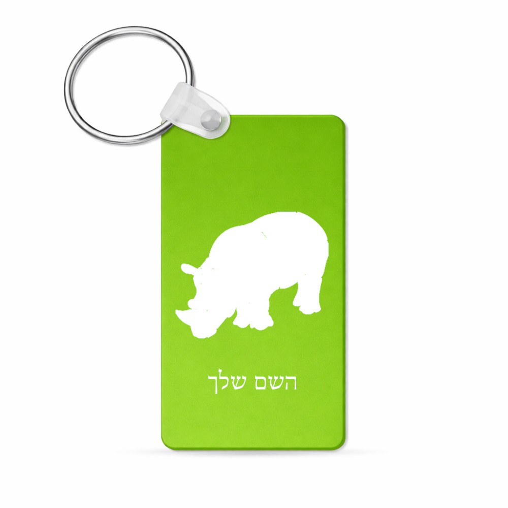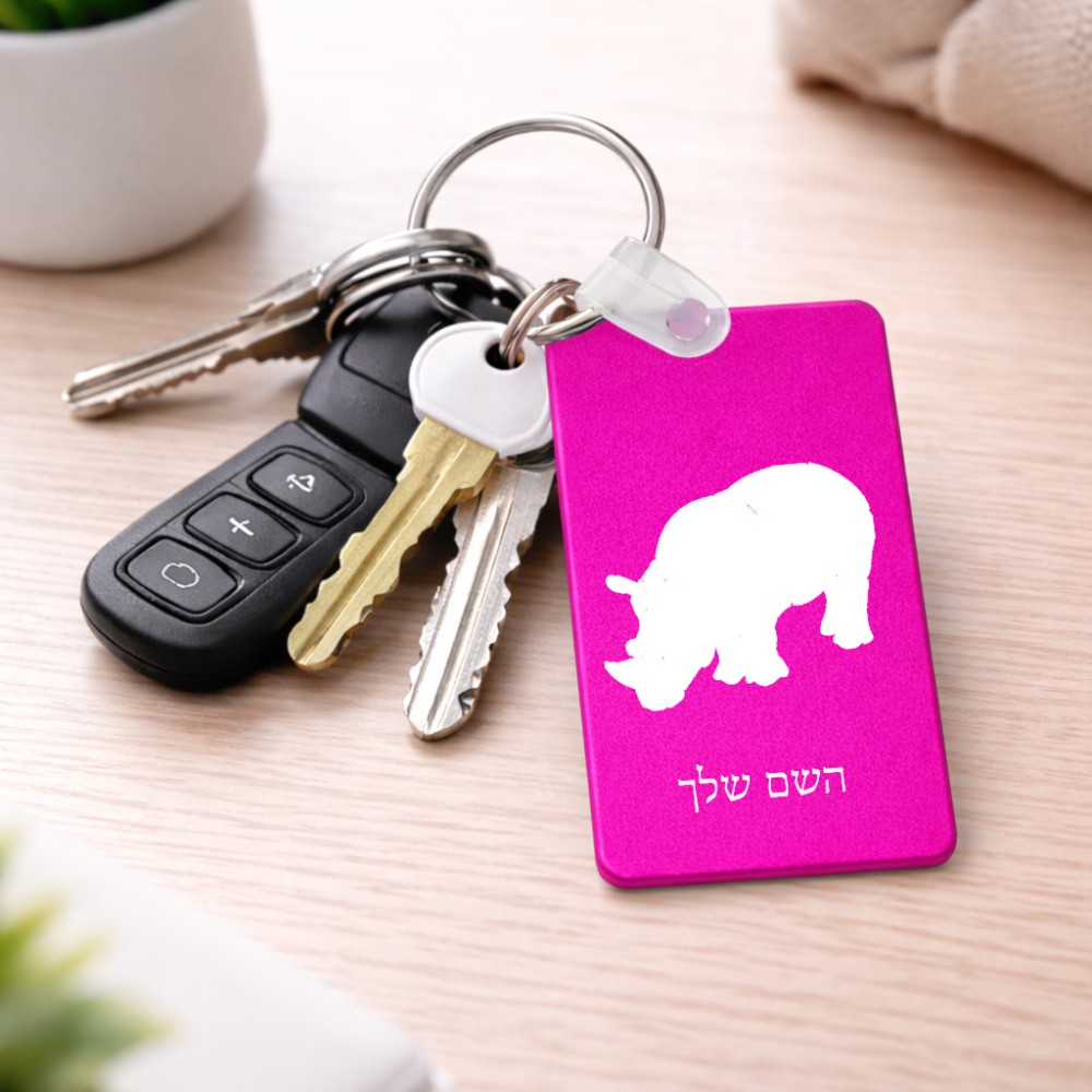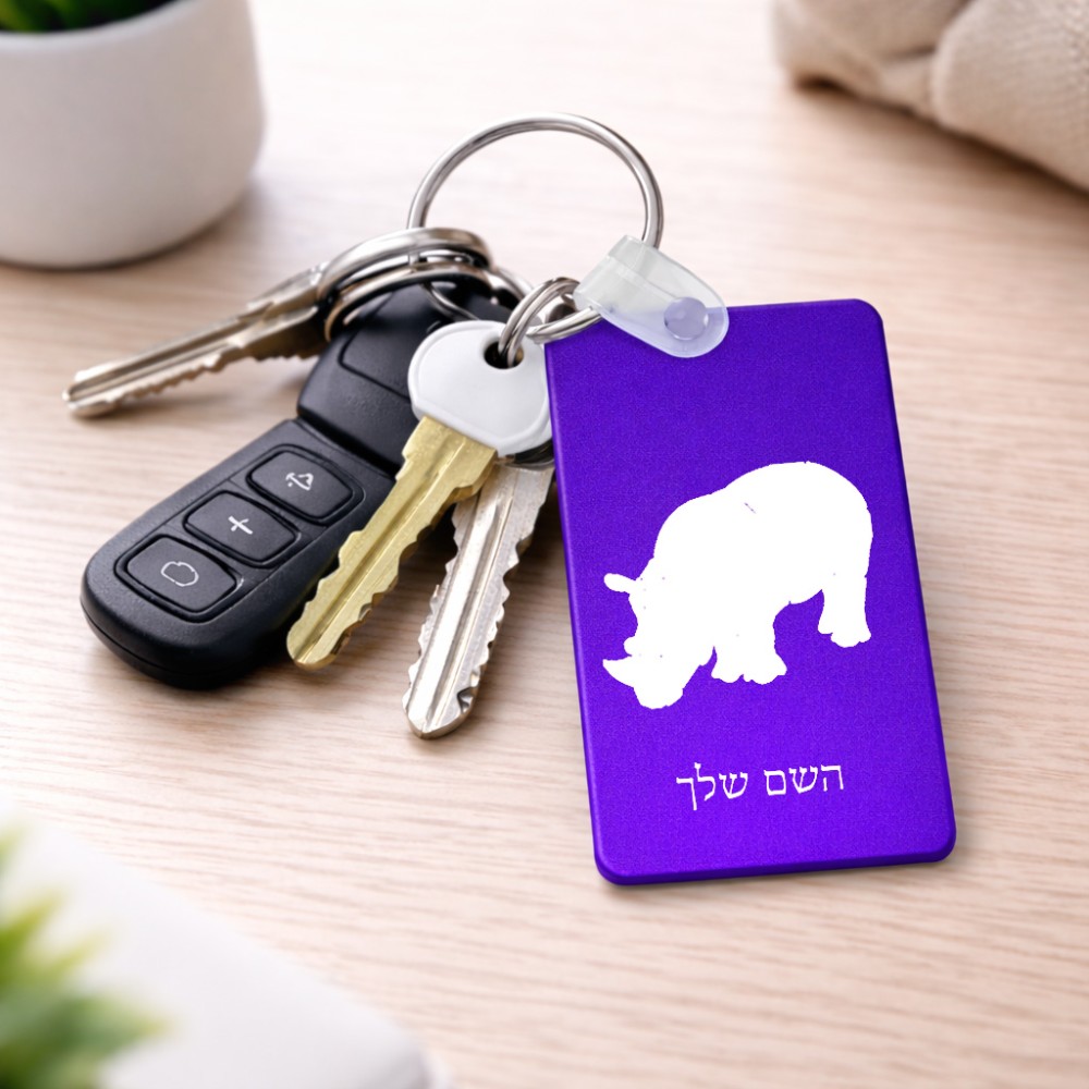 מחזיק מפתחות בצורת מלבן בעיצוב אישי עם השם שלך בעיצוב קרנף גודל המחזיק 6 × 4 ס"מ. את השם המבוקש ניתן לציין בהזמנה, אם לא צויין אנחנו ניצור קשר לבירור.
