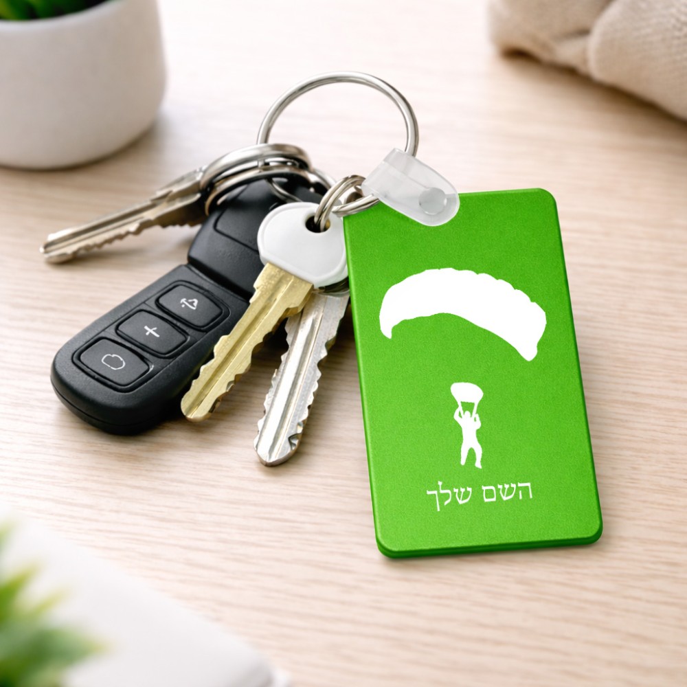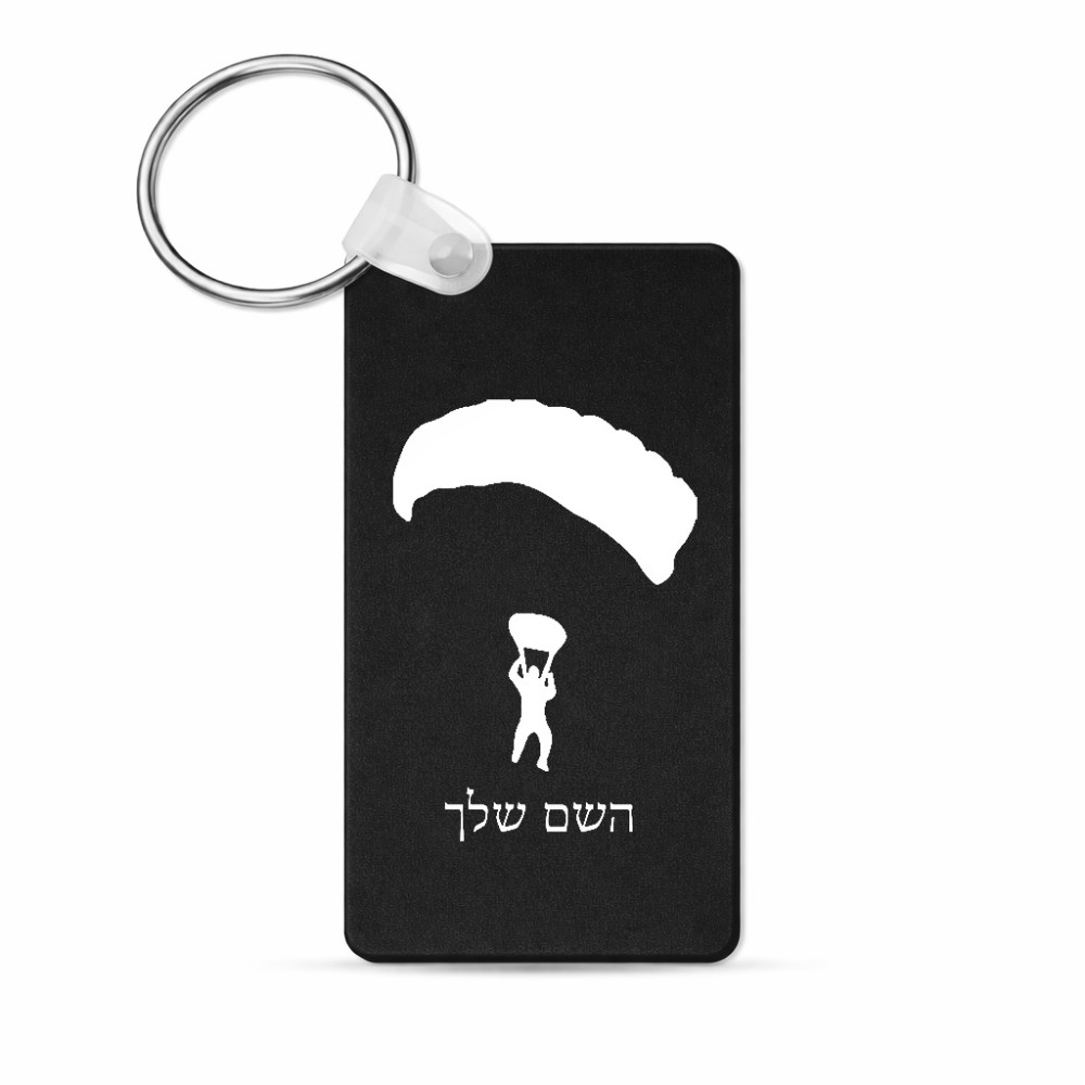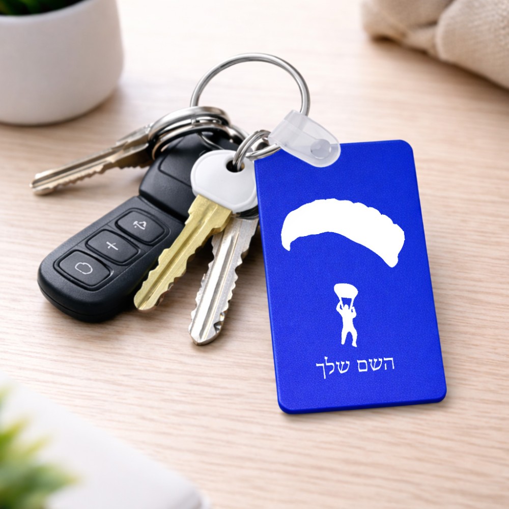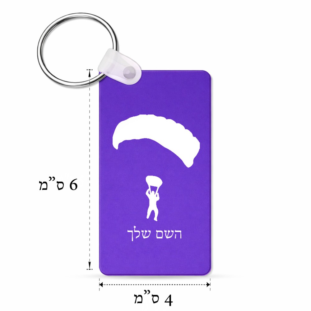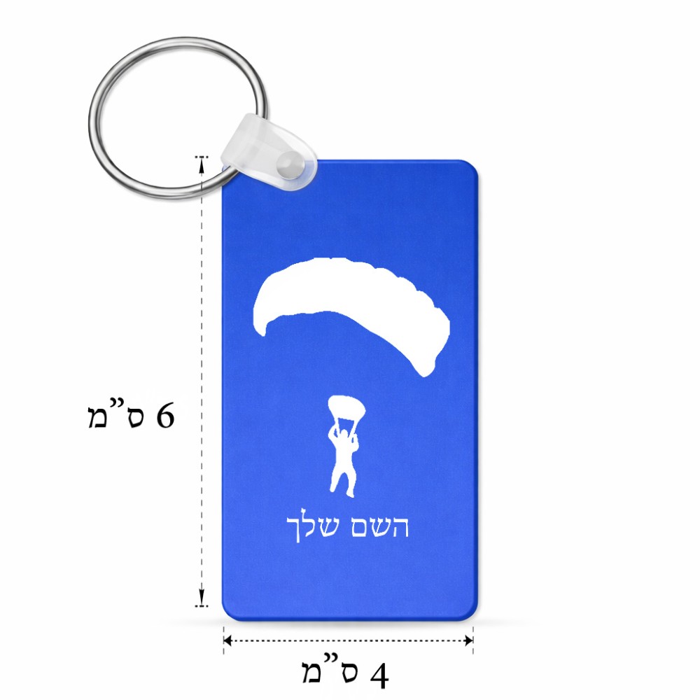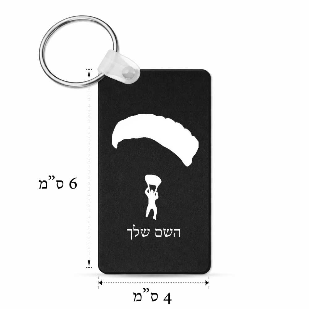 מחזיק מפתחות בצורת מלבן בעיצוב אישי עם השם שלך בעיצוב צניחה חופשית גודל המחזיק 6 × 4 ס"מ. את השם המבוקש ניתן לציין בהזמנה, אם לא צויין אנחנו ניצור קשר לבירור.