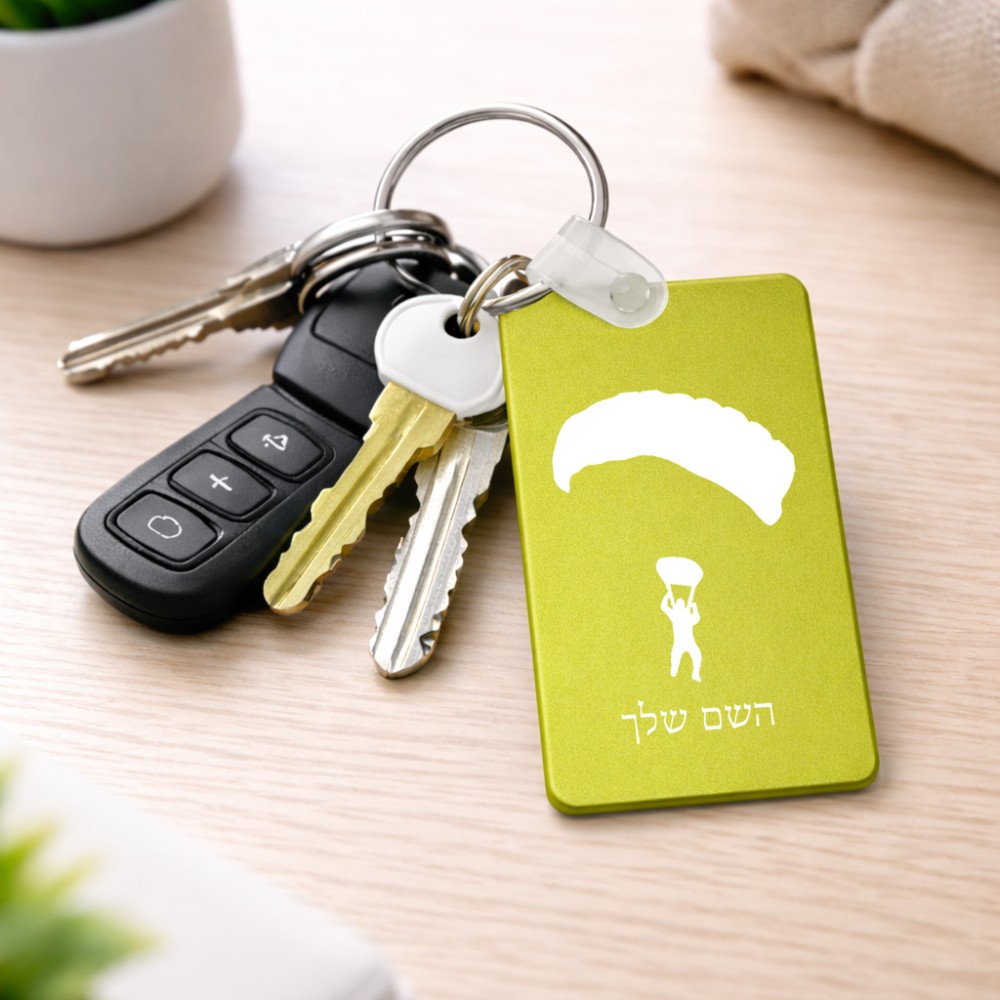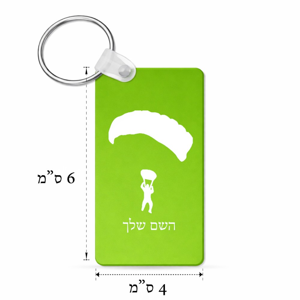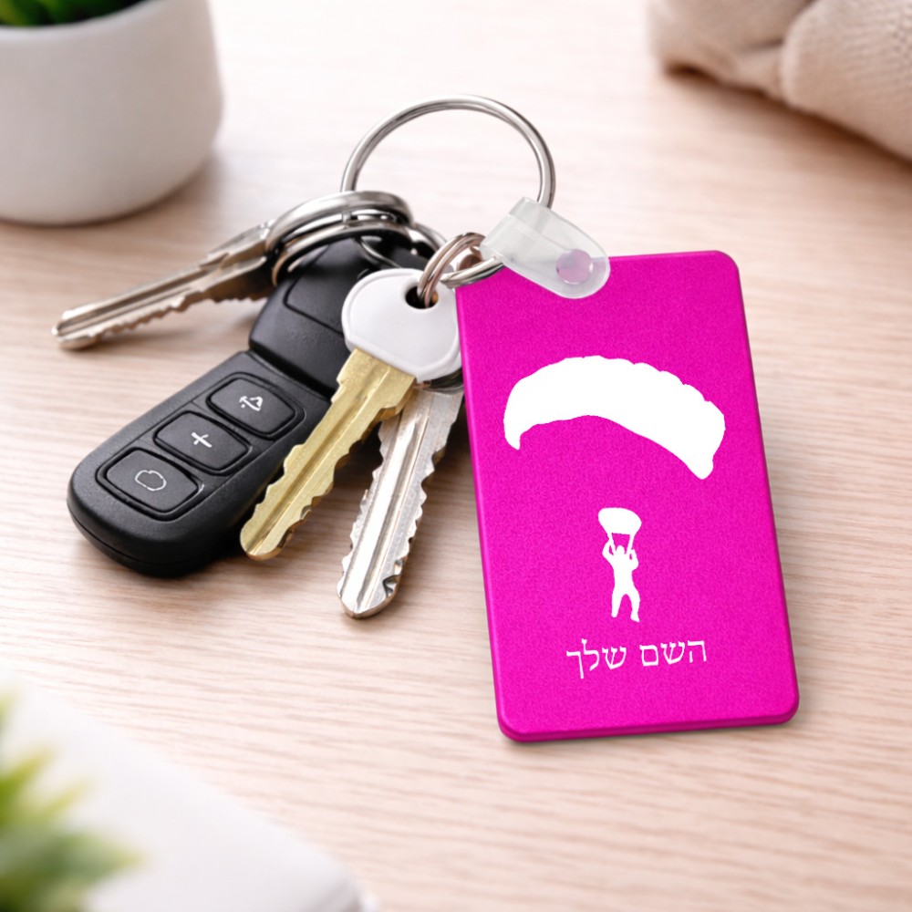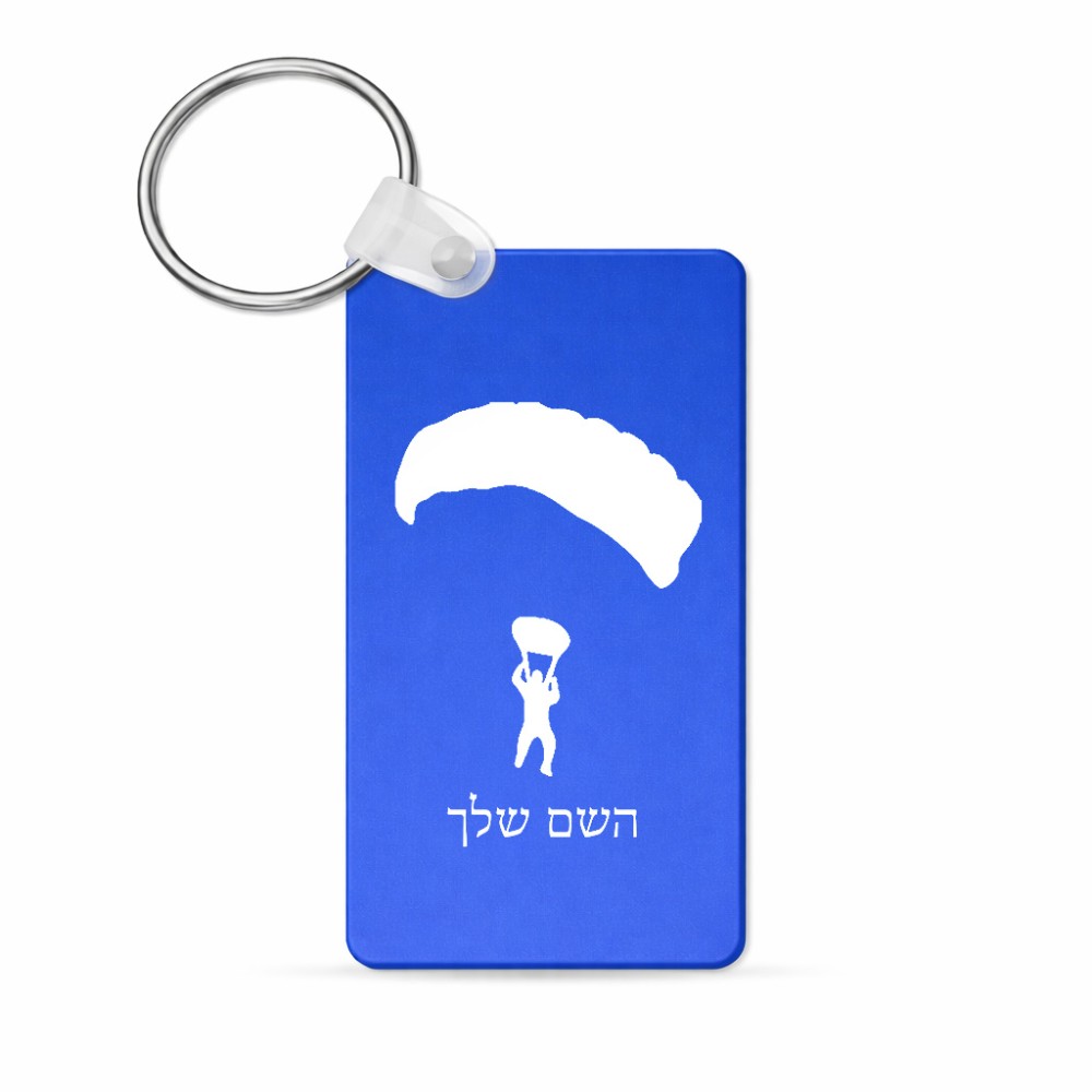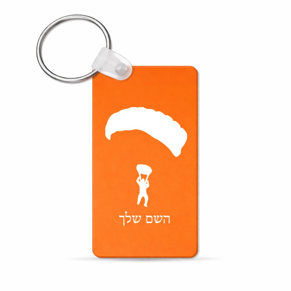 מחזיק מפתחות בצורת מלבן בעיצוב אישי עם השם שלך בעיצוב צניחה חופשית גודל המחזיק 6 × 4 ס"מ. את השם המבוקש ניתן לציין בהזמנה, אם לא צויין אנחנו ניצור קשר לבירור.