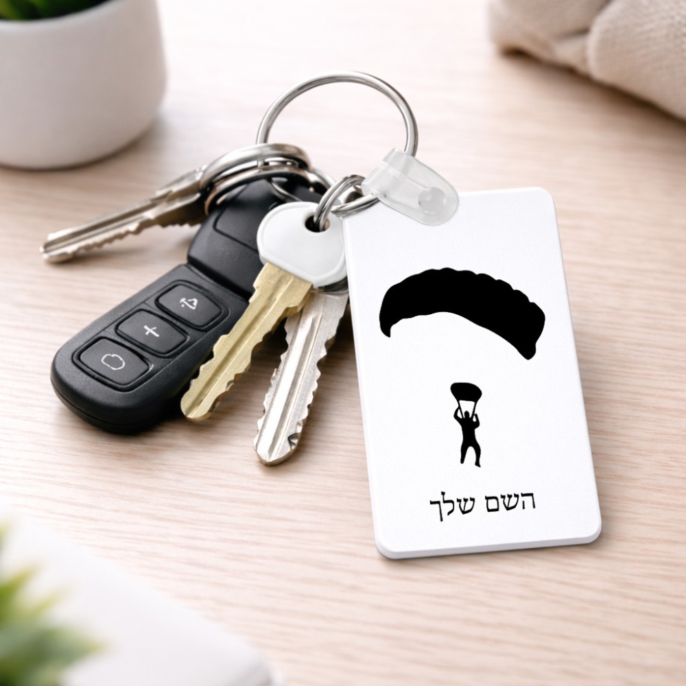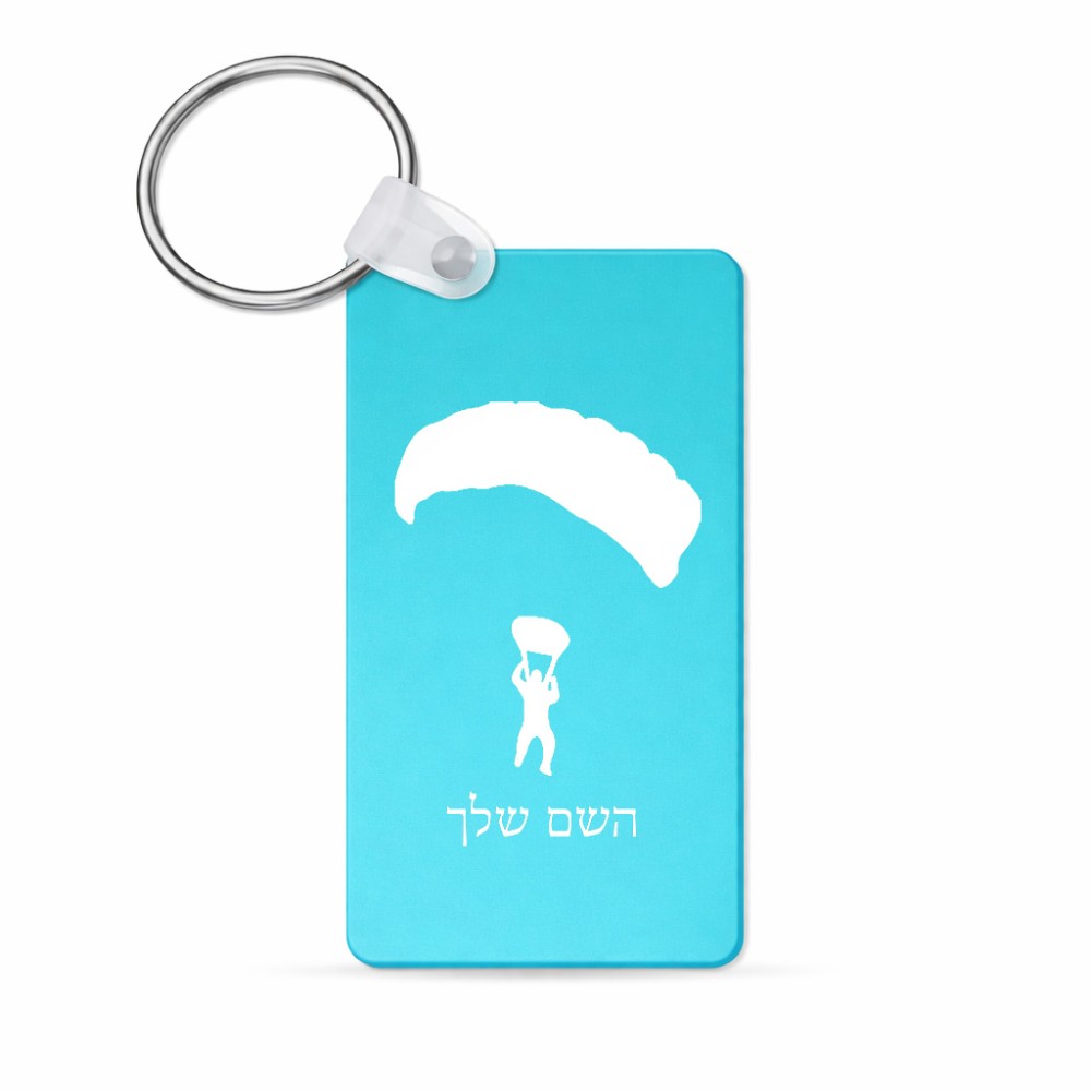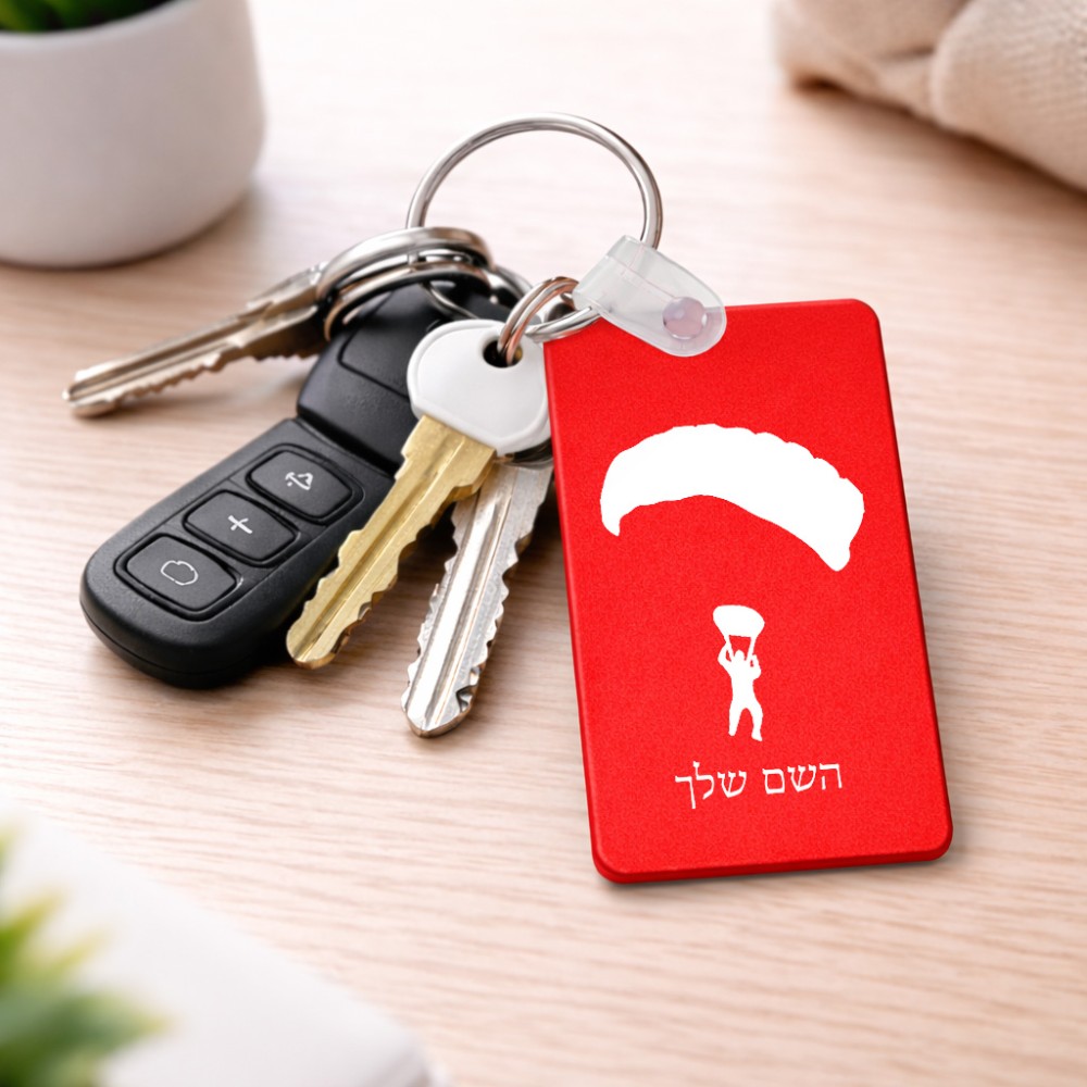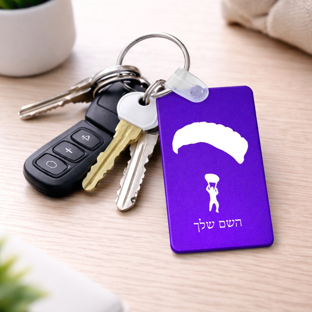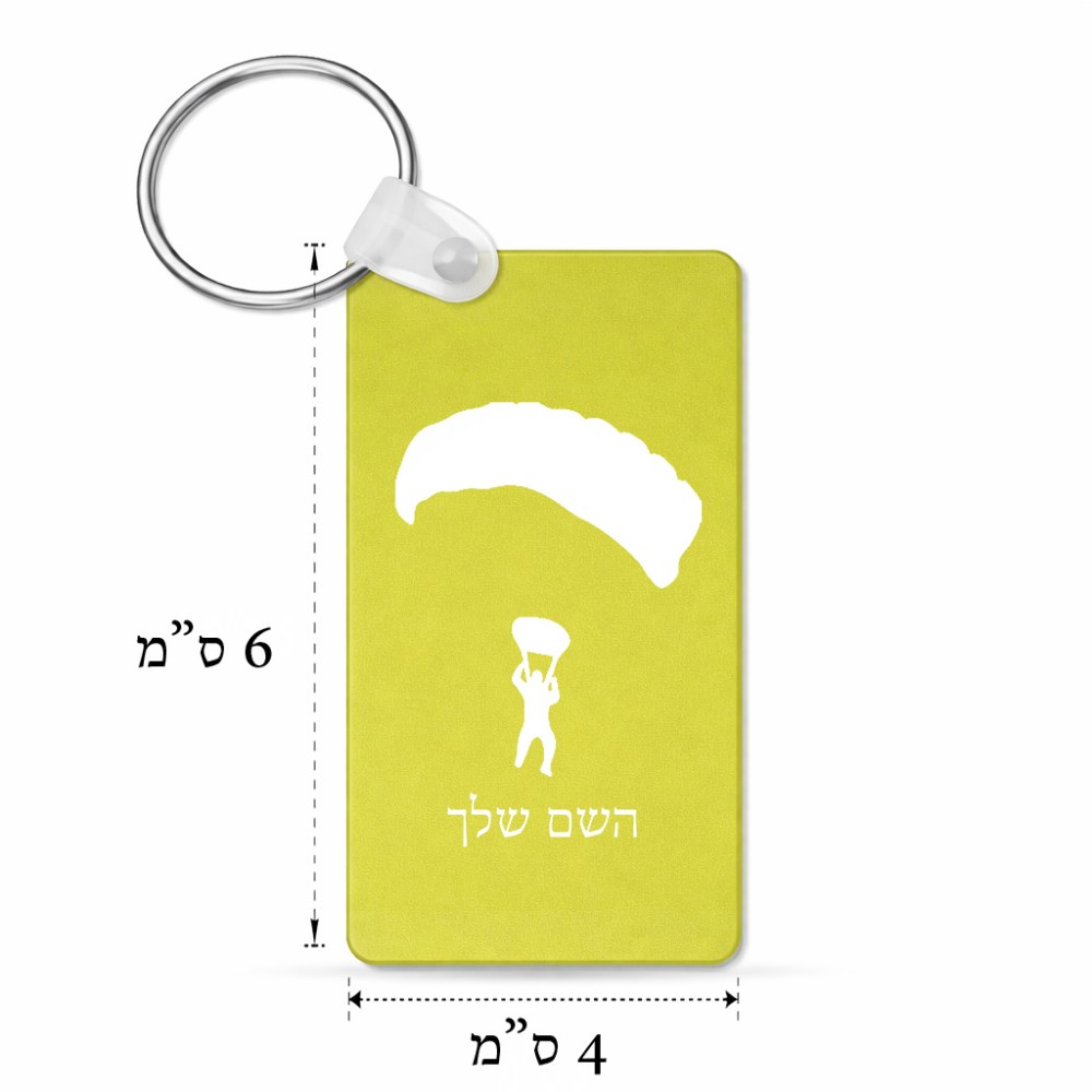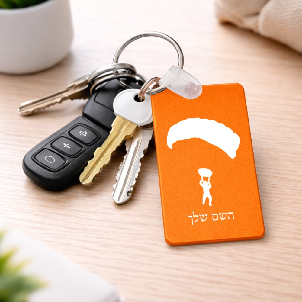 מחזיק מפתחות בצורת מלבן בעיצוב אישי עם השם שלך בעיצוב צניחה חופשית גודל המחזיק 6 × 4 ס"מ. את השם המבוקש ניתן לציין בהזמנה, אם לא צויין אנחנו ניצור קשר לבירור.