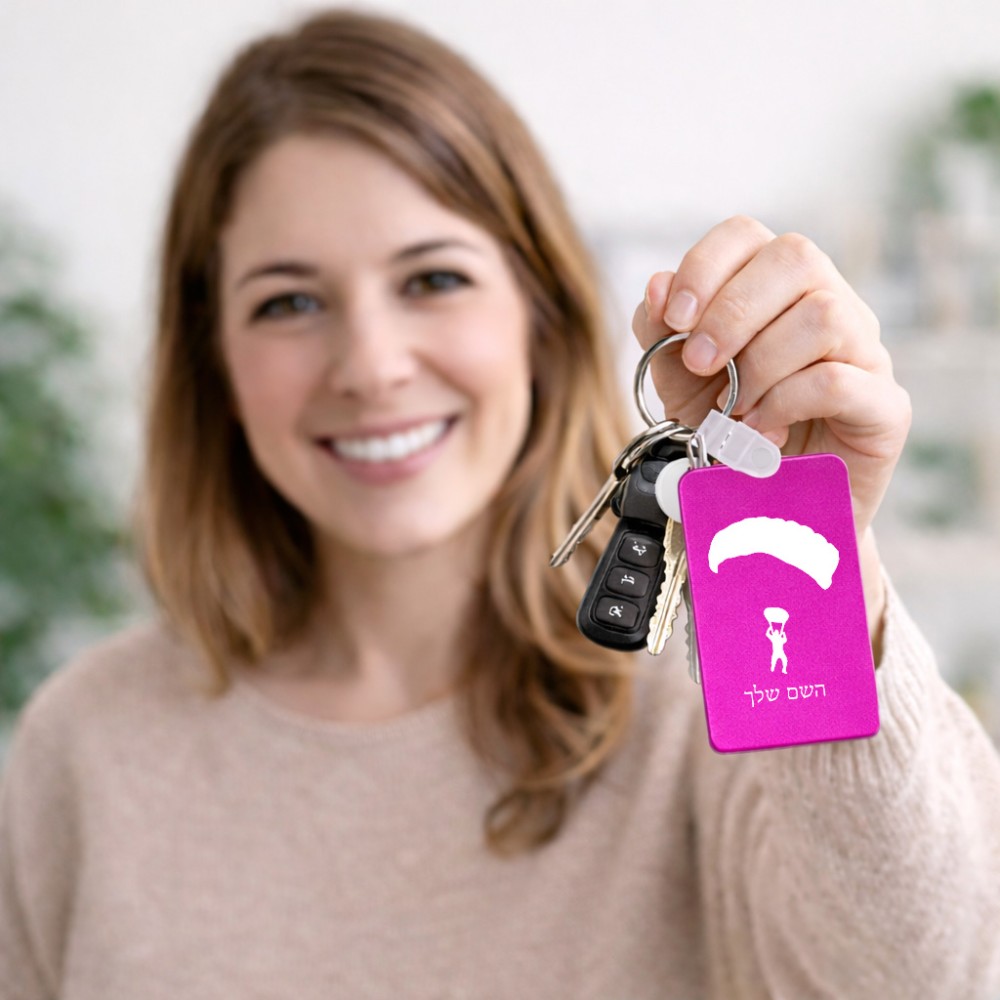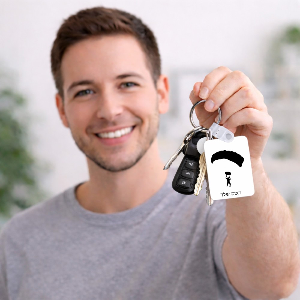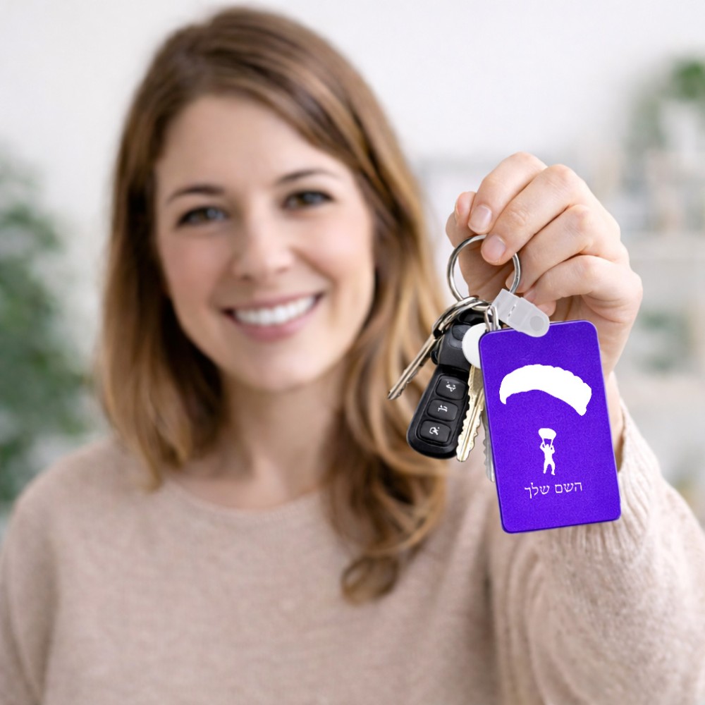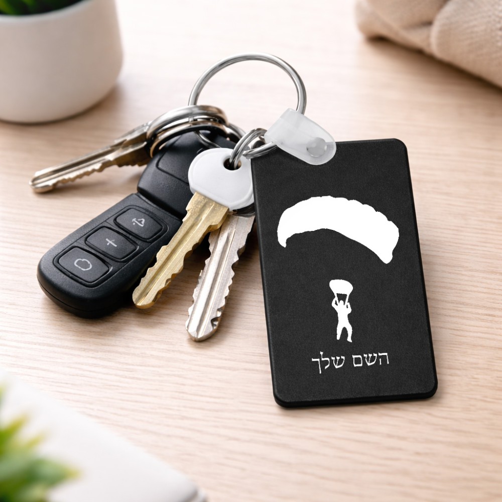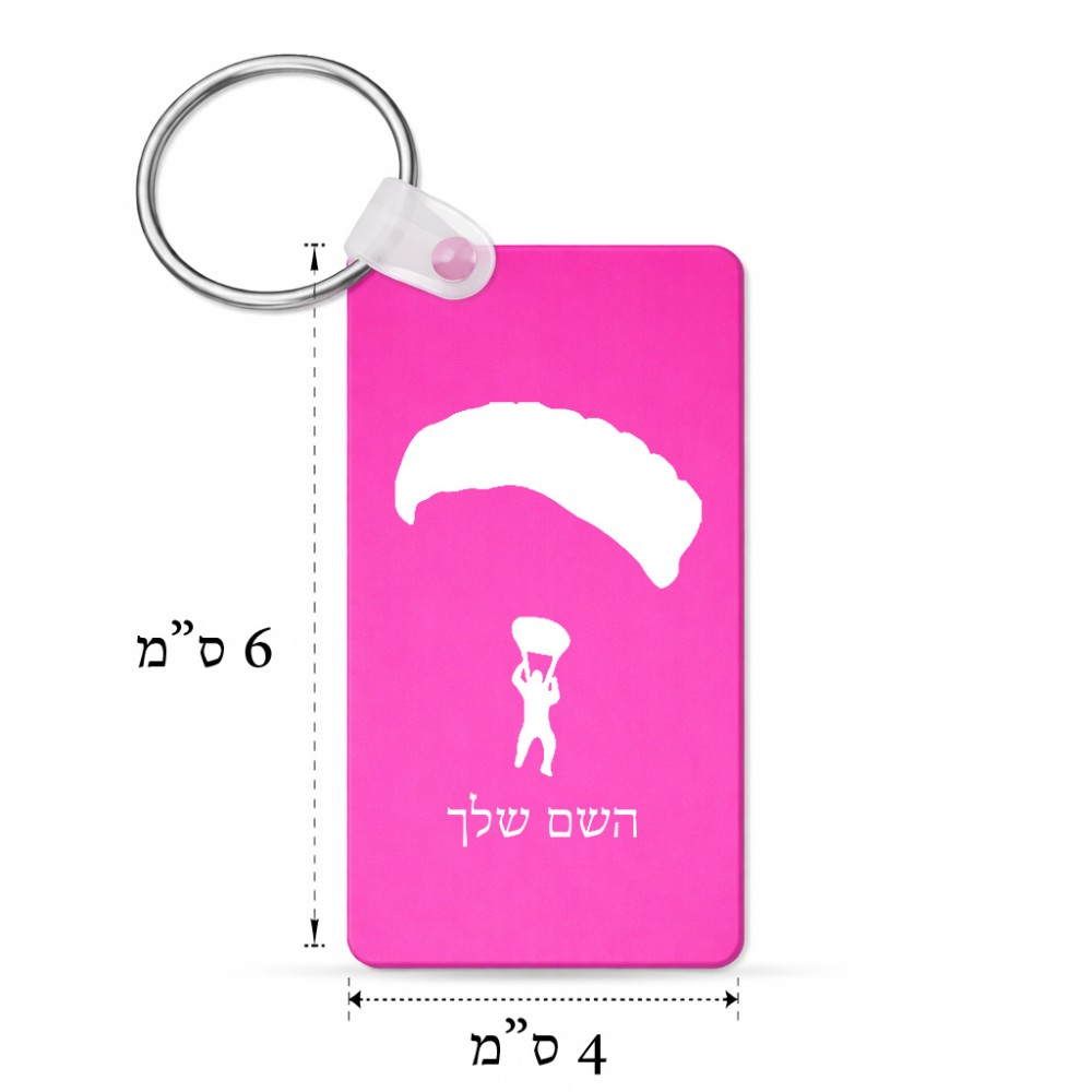 מחזיק מפתחות בצורת מלבן בעיצוב אישי עם השם שלך בעיצוב צניחה חופשית גודל המחזיק 6 × 4 ס"מ. את השם המבוקש ניתן לציין בהזמנה, אם לא צויין אנחנו ניצור קשר לבירור.