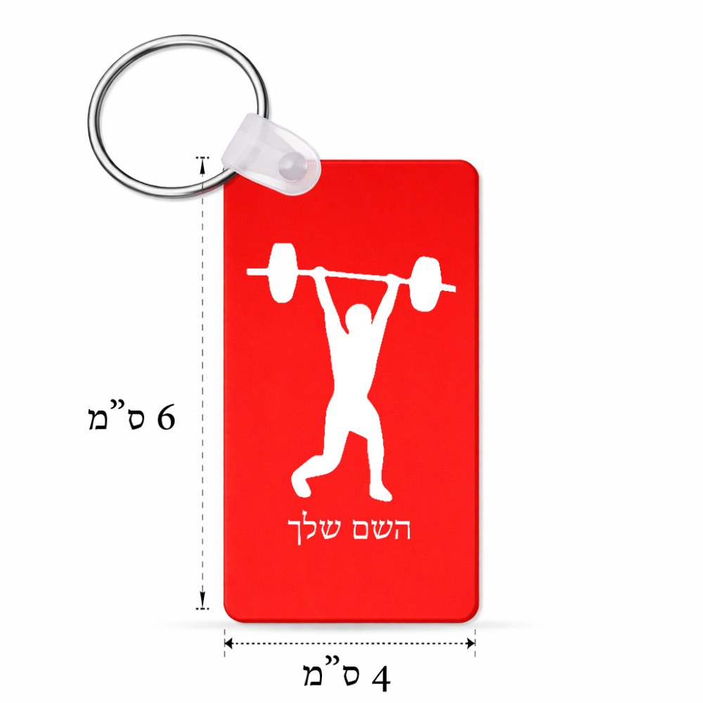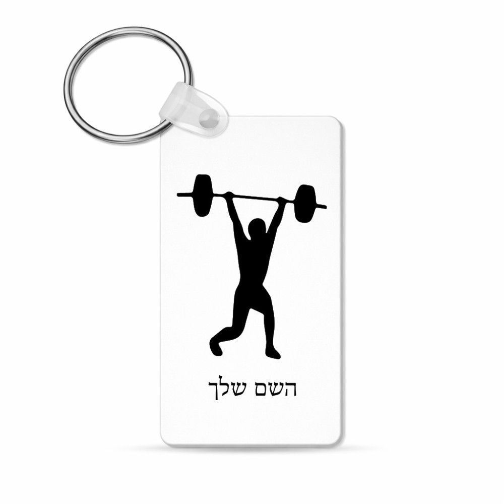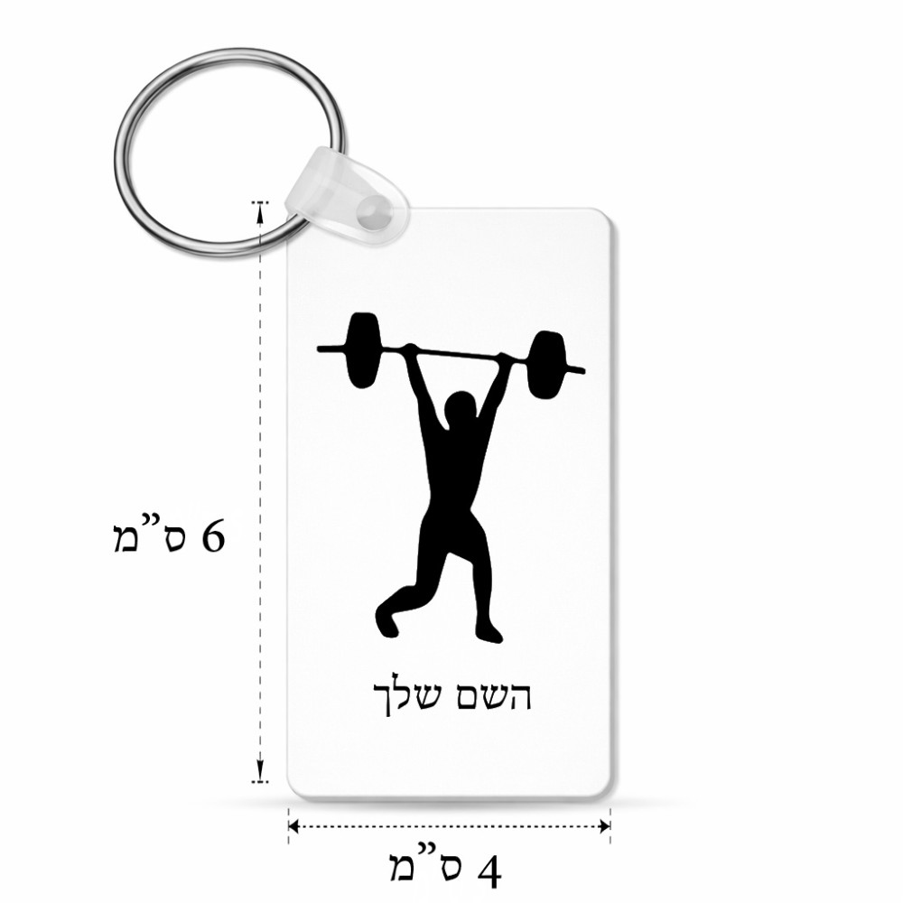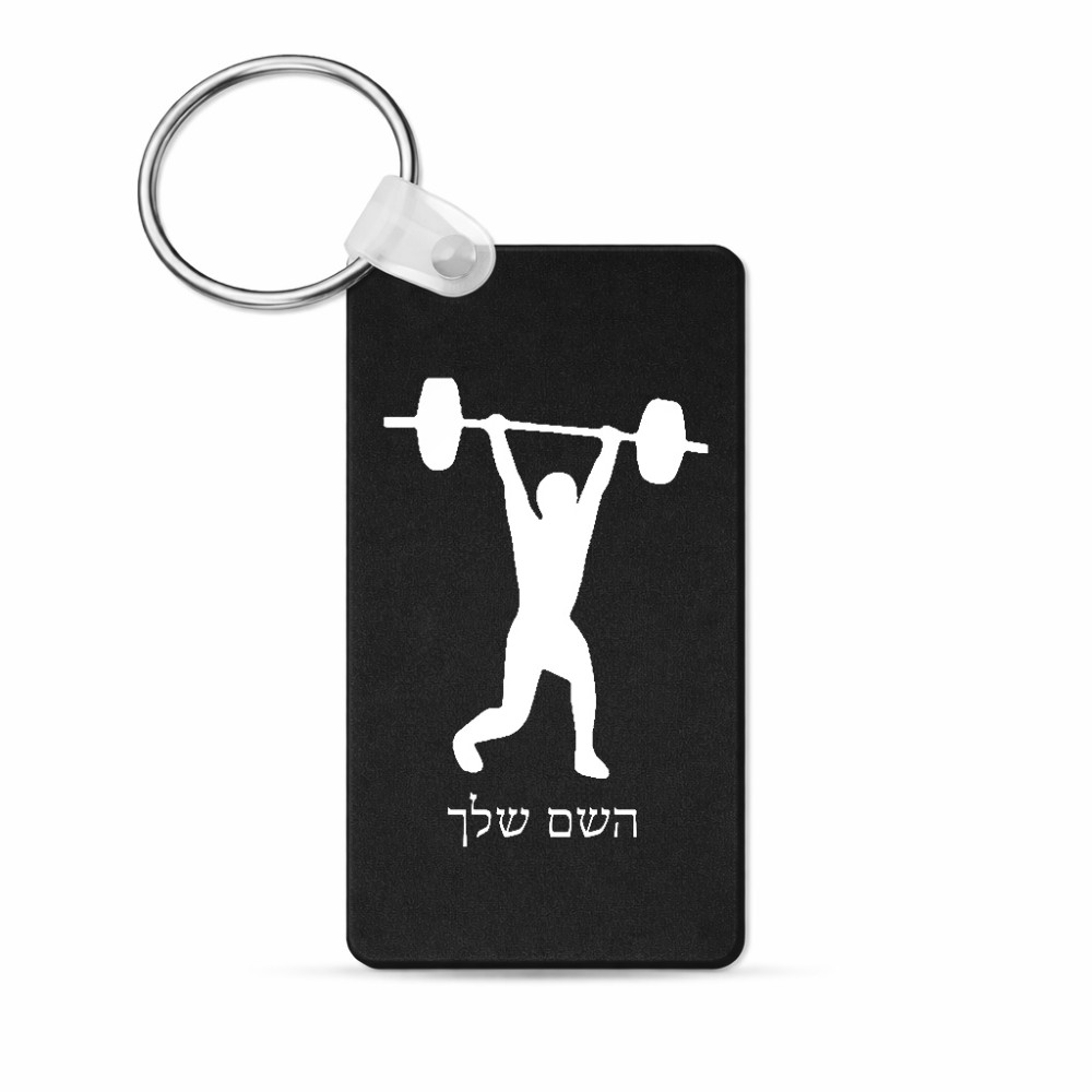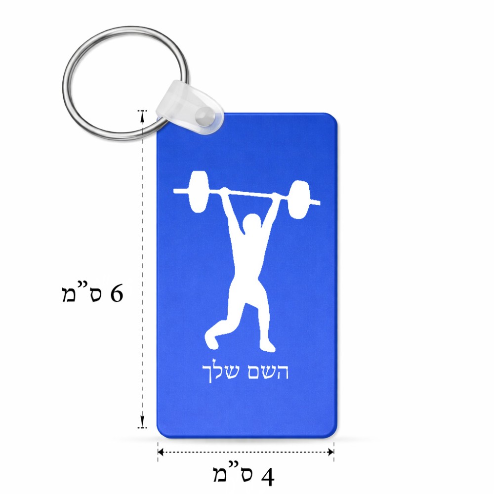 מחזיק מפתחות בצורת מלבן בעיצוב אישי עם השם שלך בעיצוב הרמת משקולות גודל המחזיק 6 × 4 ס"מ. את השם המבוקש ניתן לציין בהזמנה, אם לא צויין אנחנו ניצור קשר לבירור.