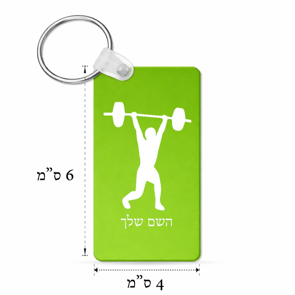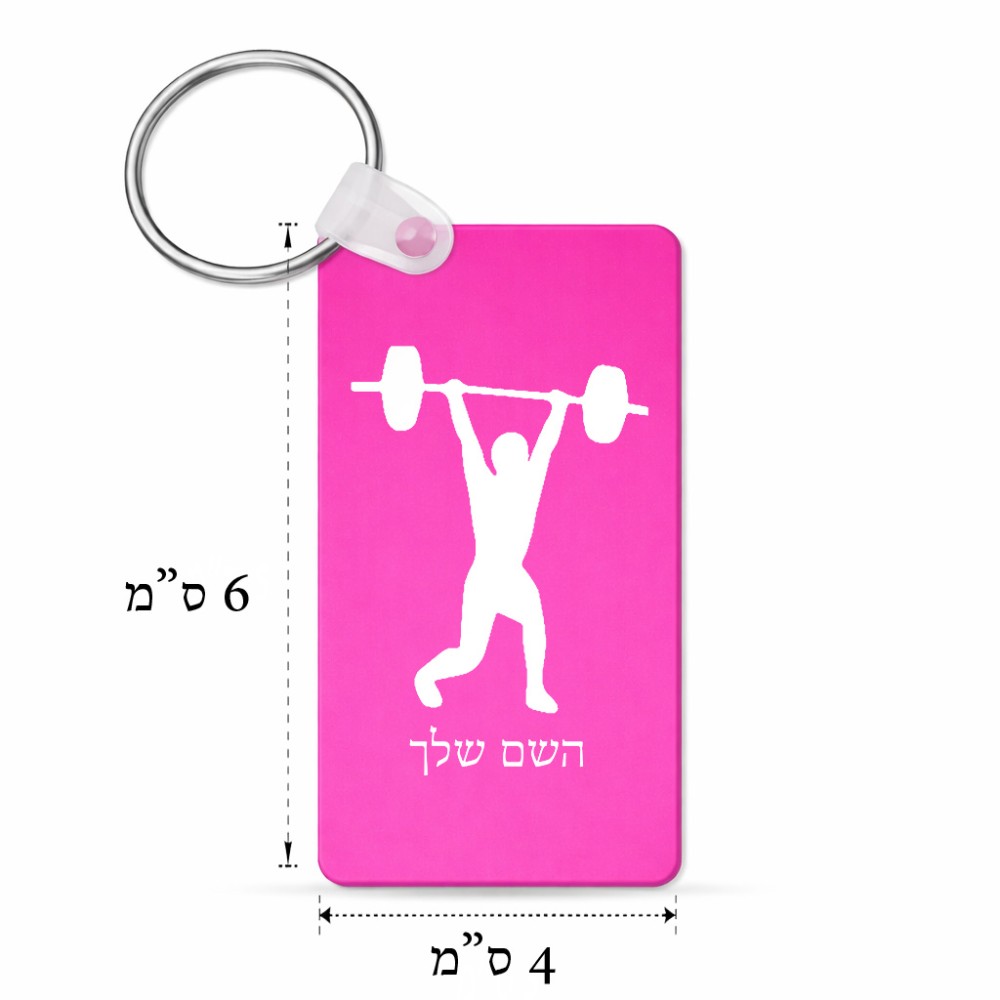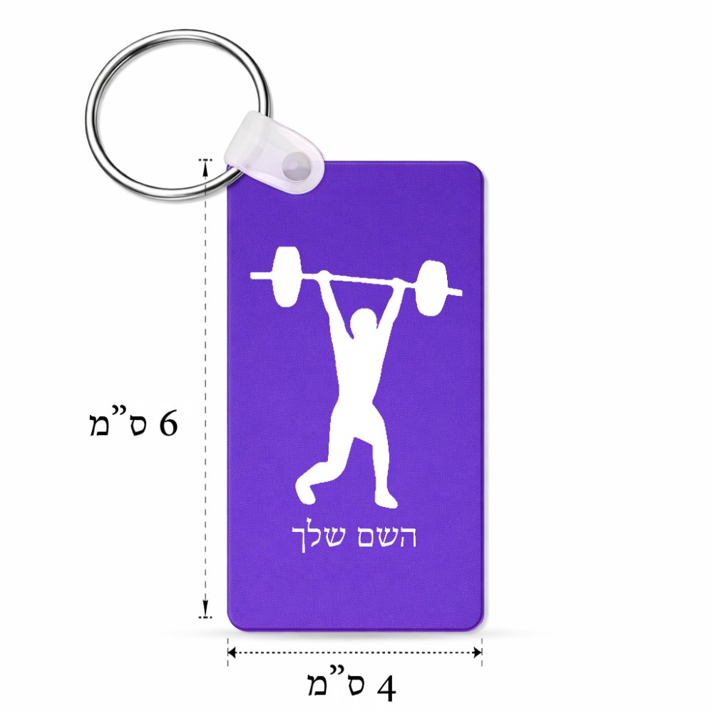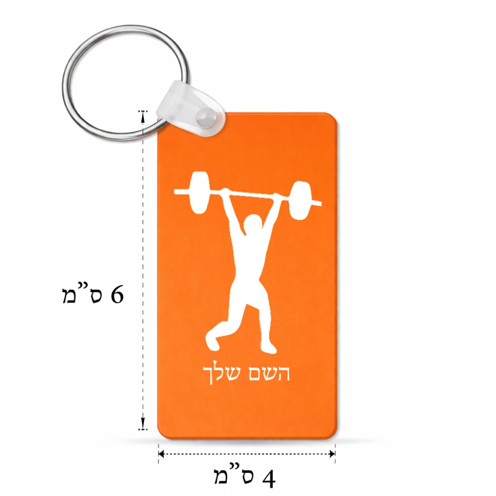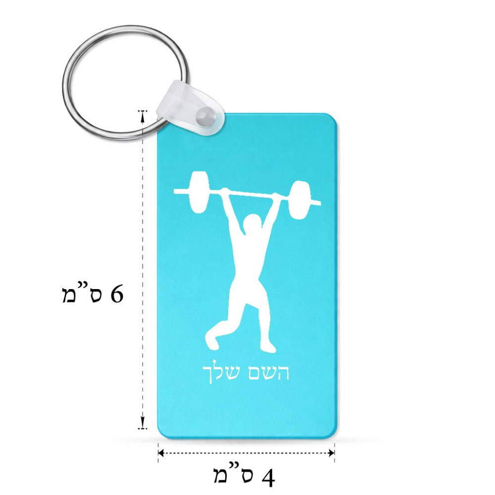 מחזיק מפתחות בצורת מלבן בעיצוב אישי עם השם שלך בעיצוב הרמת משקולות גודל המחזיק 6 × 4 ס"מ. את השם המבוקש ניתן לציין בהזמנה, אם לא צויין אנחנו ניצור קשר לבירור.