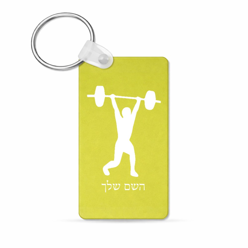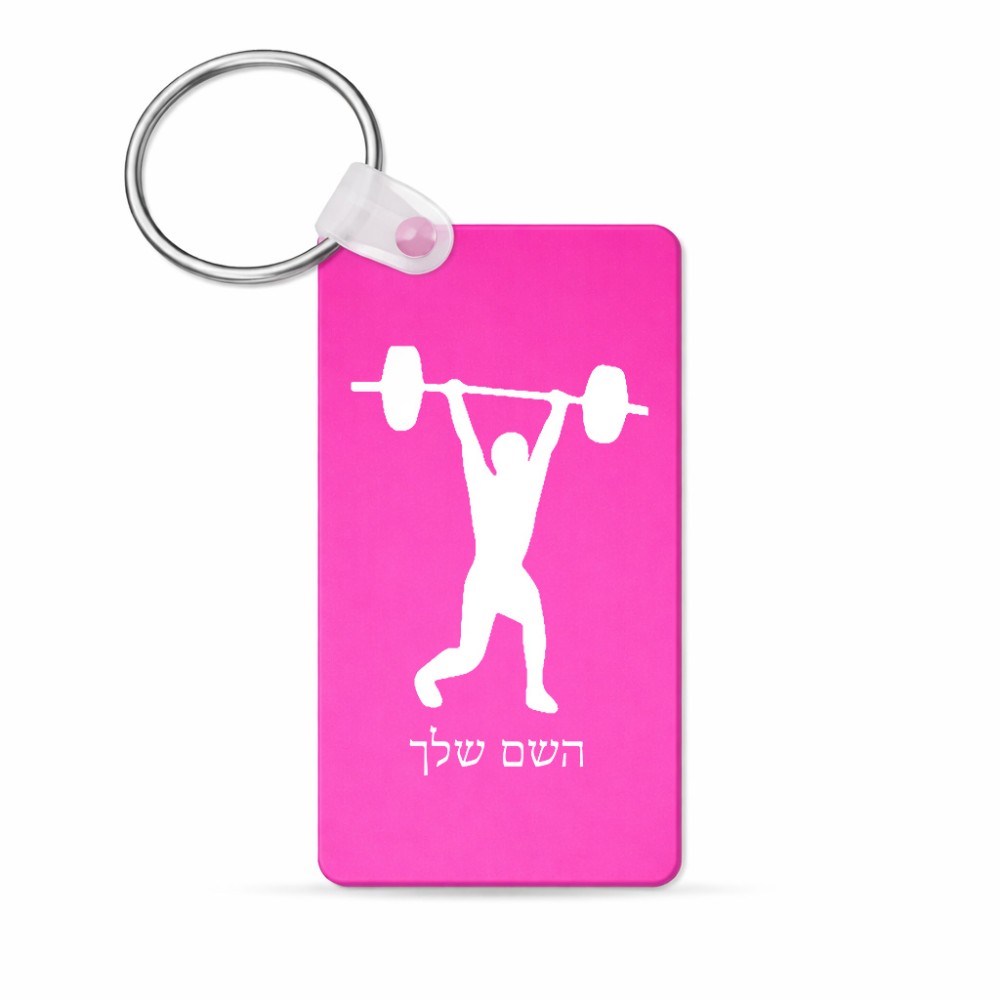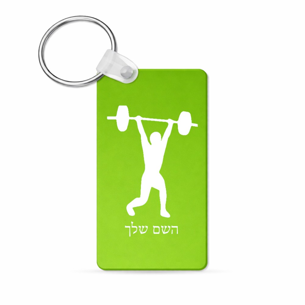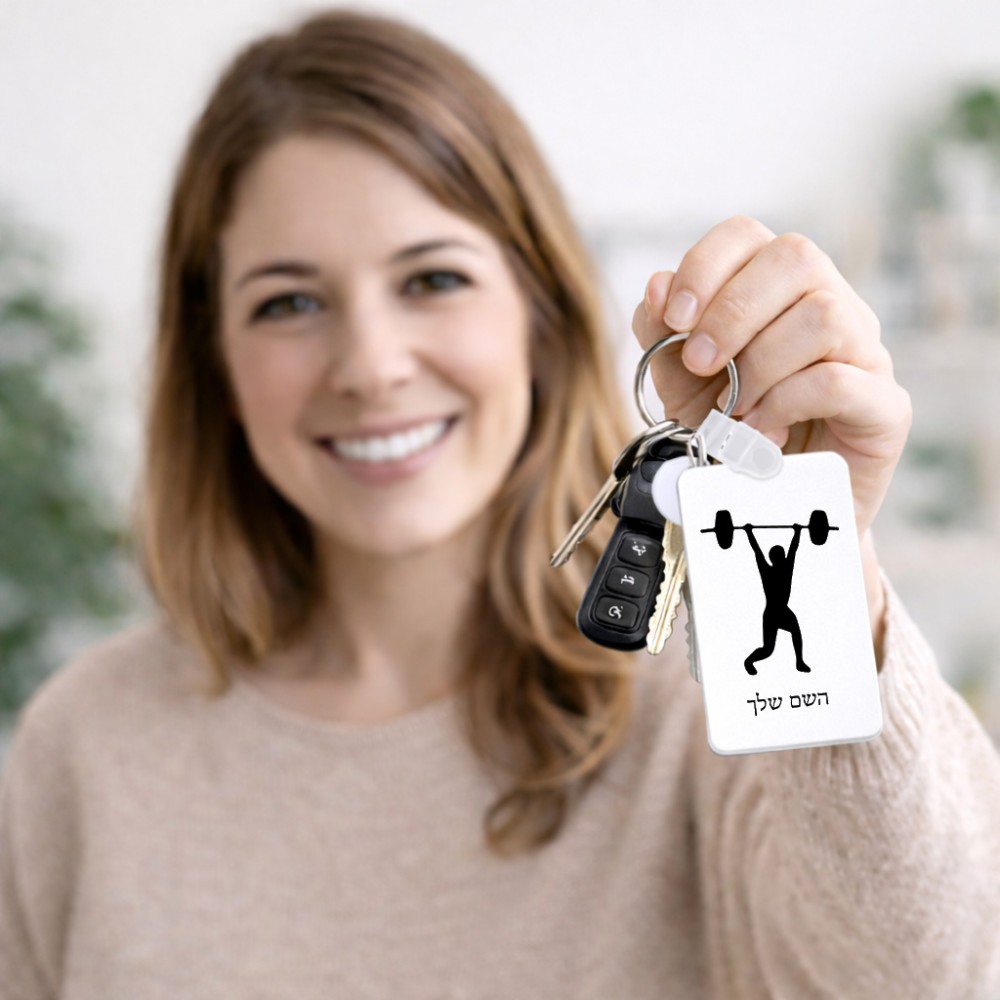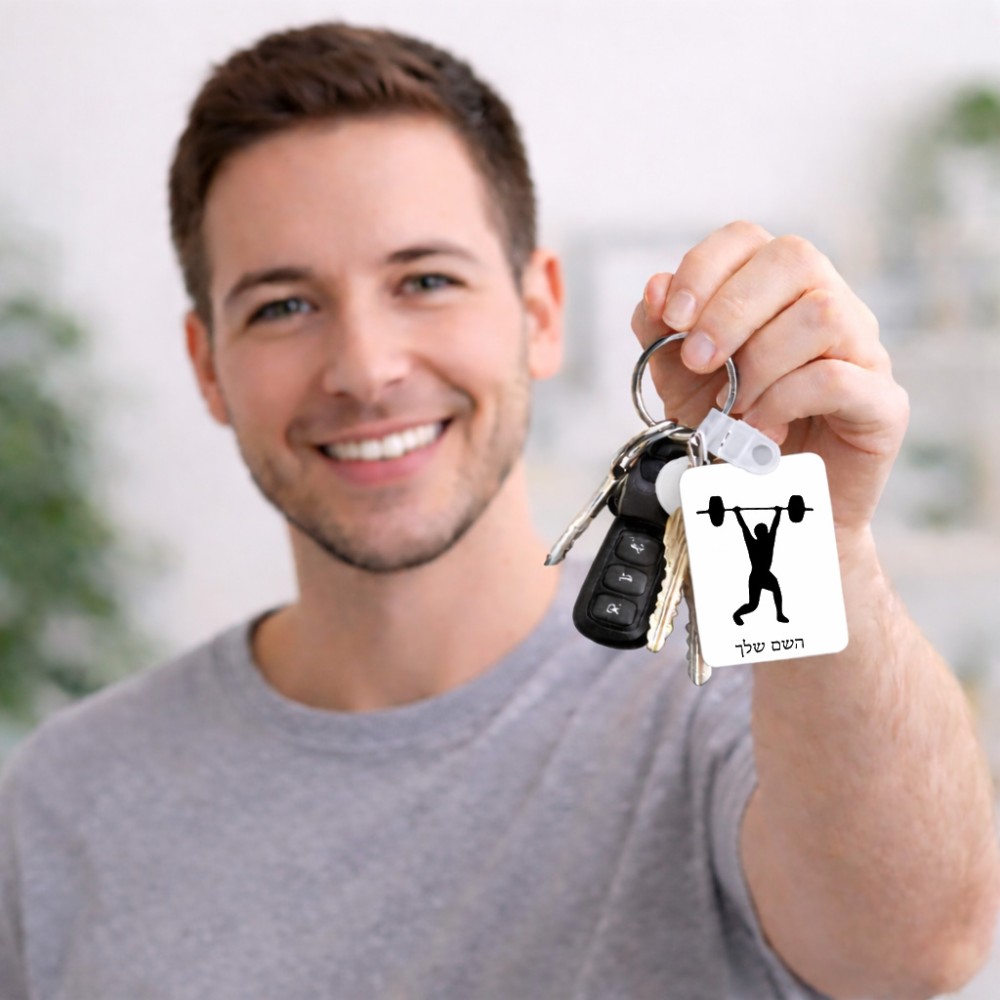 מחזיק מפתחות בצורת מלבן בעיצוב אישי עם השם שלך בעיצוב הרמת משקולות גודל המחזיק 6 × 4 ס"מ. את השם המבוקש ניתן לציין בהזמנה, אם לא צויין אנחנו ניצור קשר לבירור.