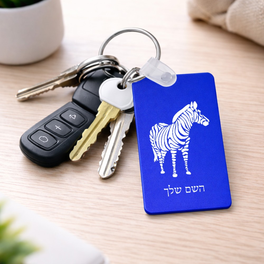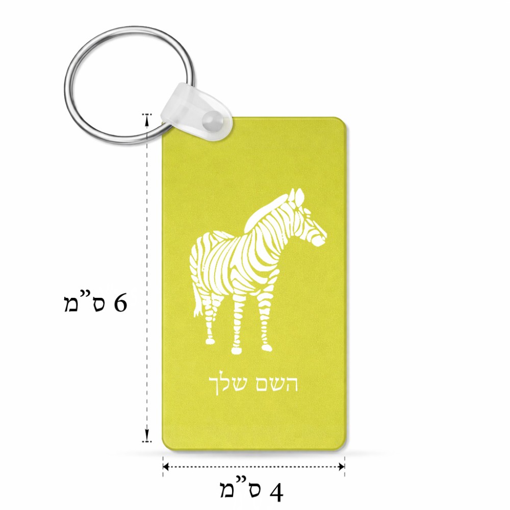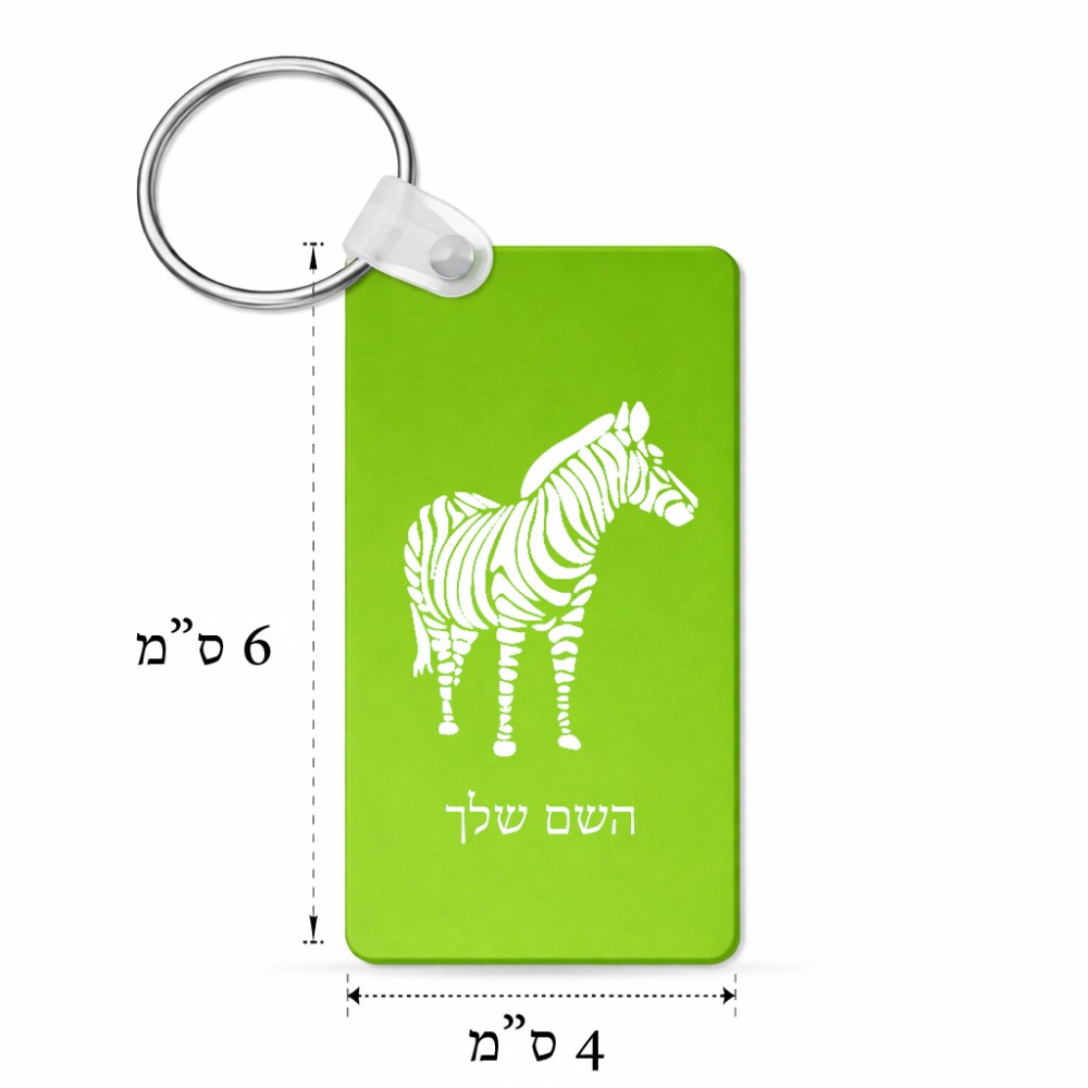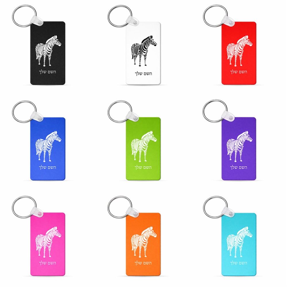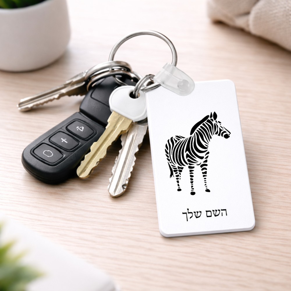 מחזיק מפתחות בצורת מלבן בעיצוב אישי עם השם שלך בעיצוב זברה גודל המחזיק 6 × 4 ס"מ. את השם המבוקש ניתן לציין בהזמנה, אם לא צויין אנחנו ניצור קשר לבירור.