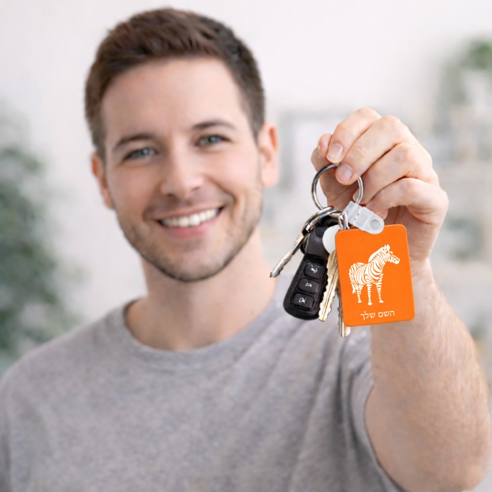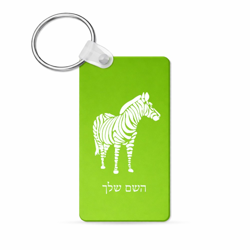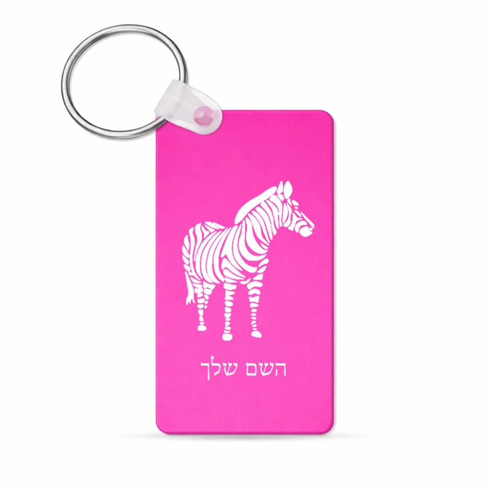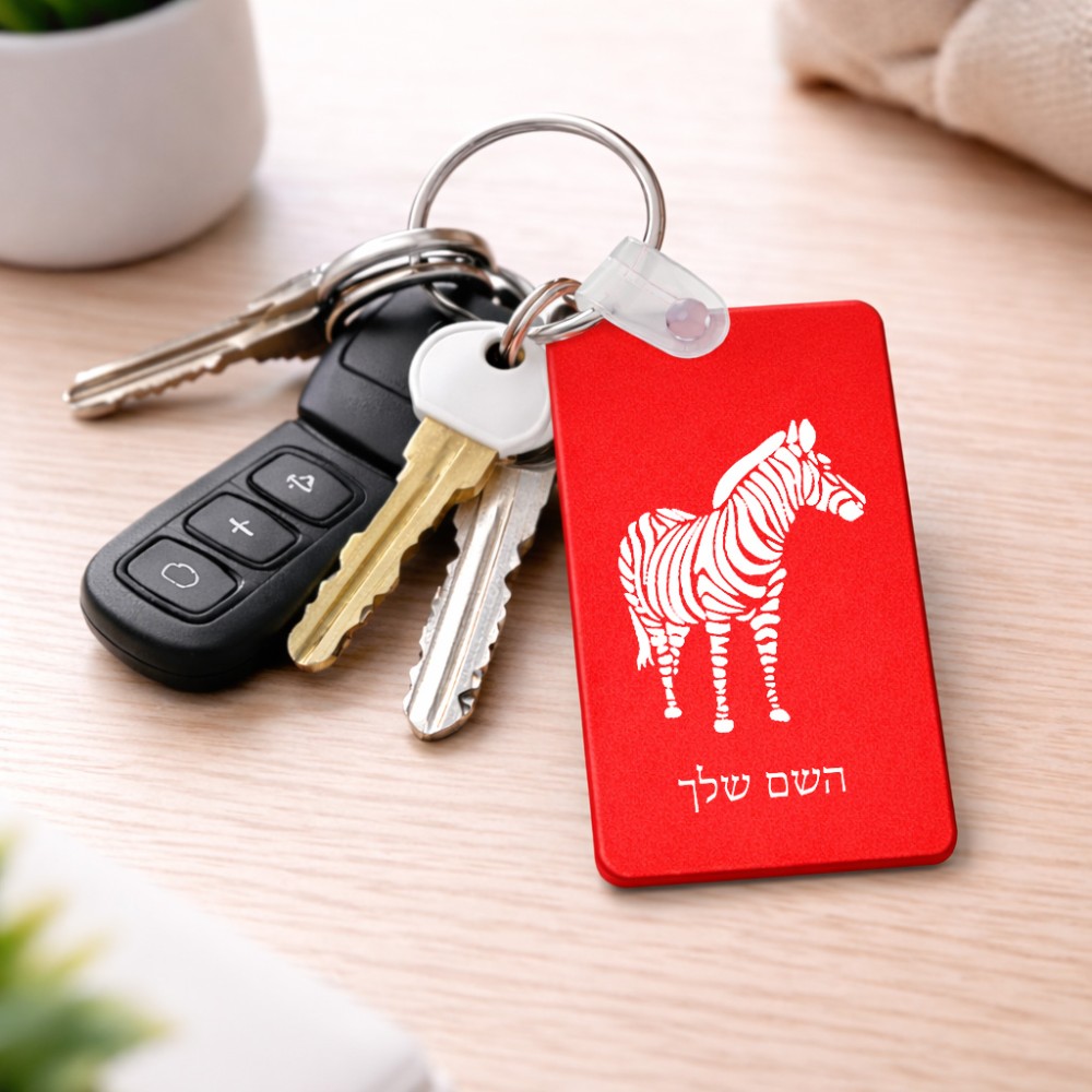 מחזיק מפתחות בצורת מלבן בעיצוב אישי עם השם שלך בעיצוב זברה גודל המחזיק 6 × 4 ס"מ. את השם המבוקש ניתן לציין בהזמנה, אם לא צויין אנחנו ניצור קשר לבירור.