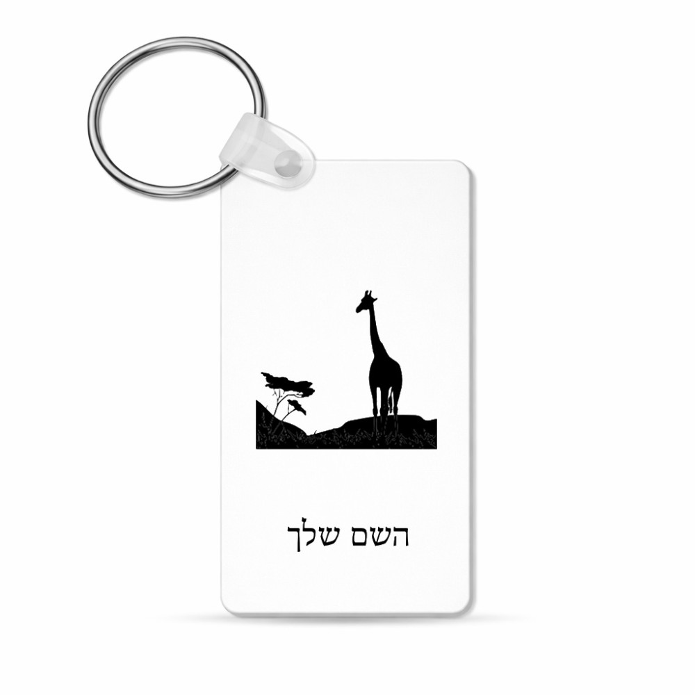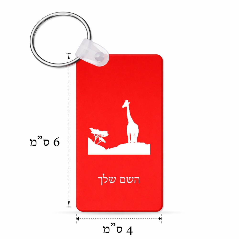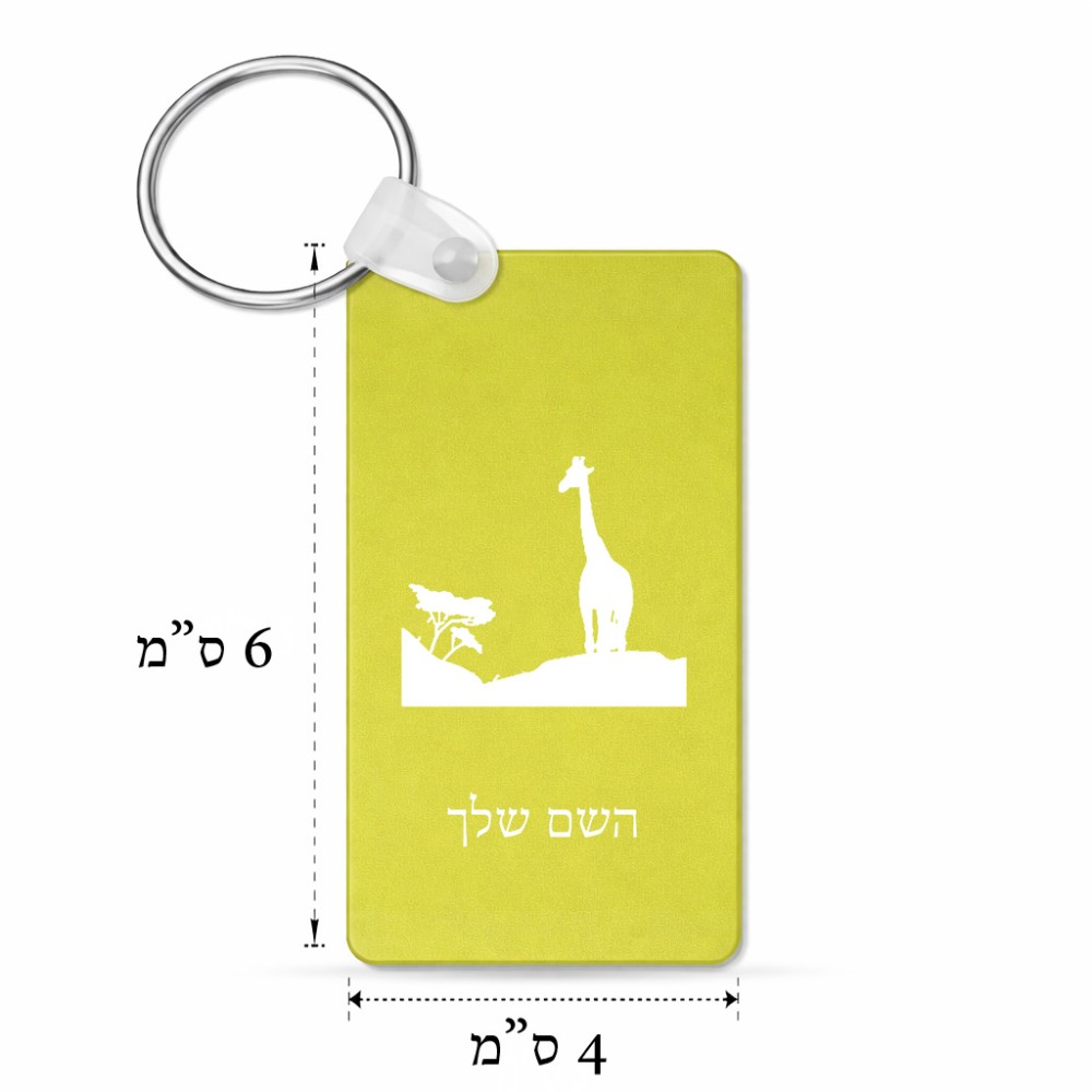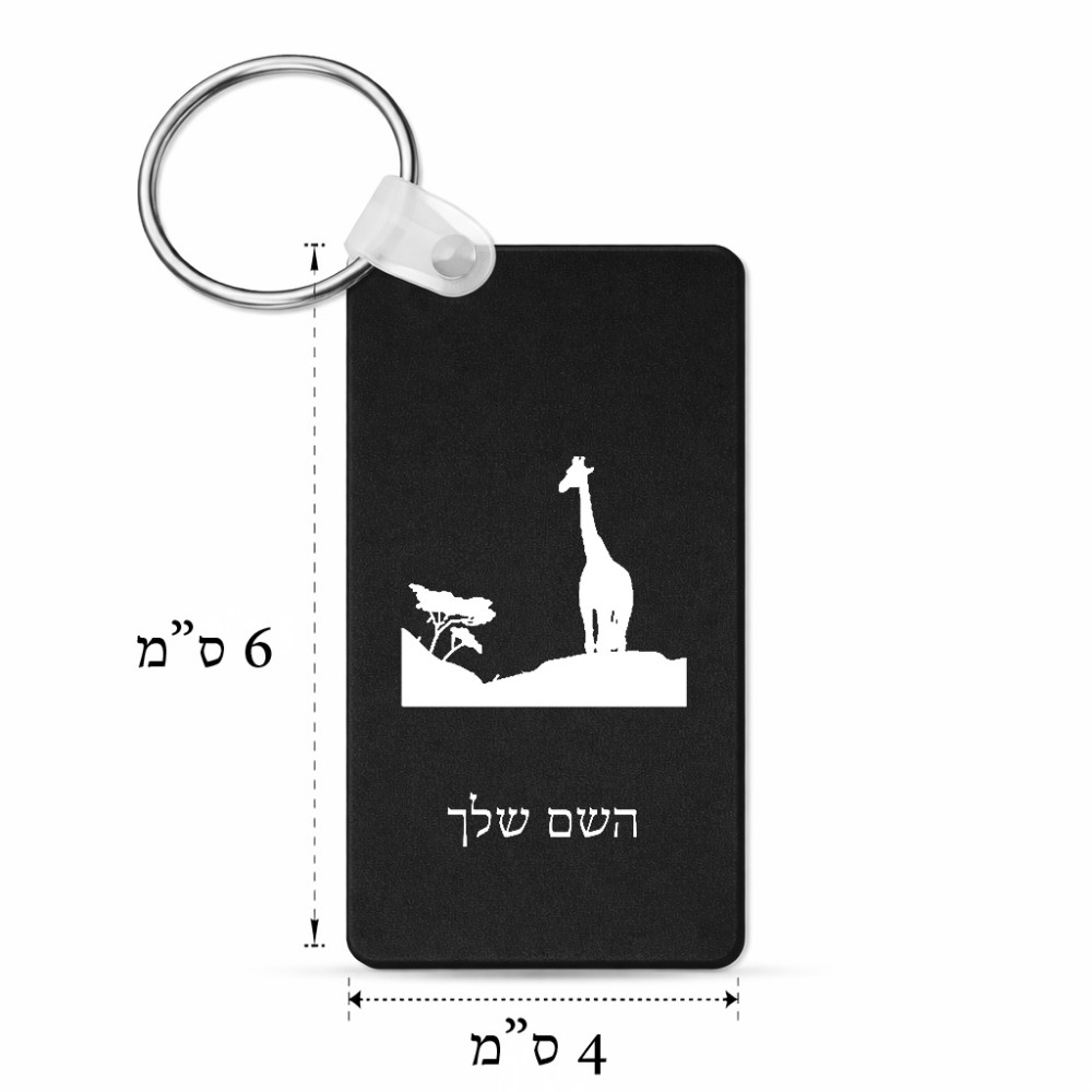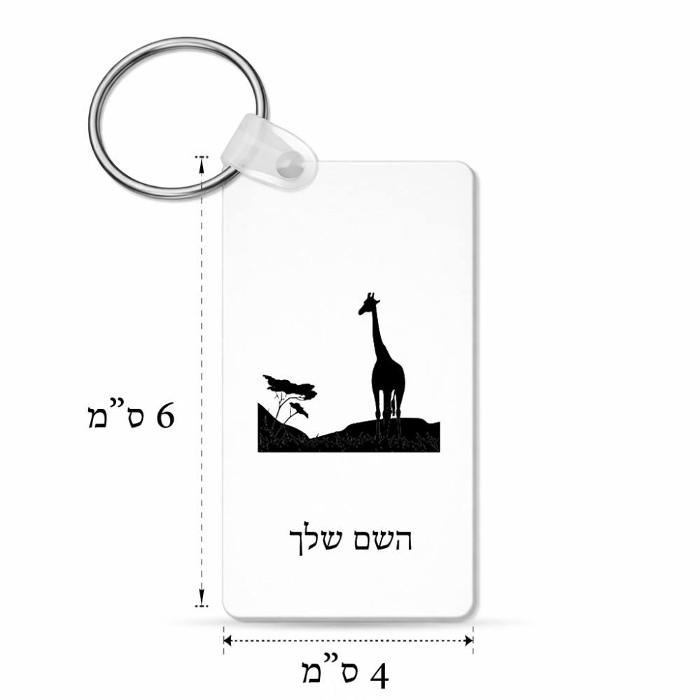 מחזיק מפתחות בצורת מלבן בעיצוב אישי עם השם שלך בעיצוב ג'ירפה באפריקה גודל המחזיק 6 × 4 ס"מ. את השם המבוקש ניתן לציין בהזמנה, אם לא צויין אנחנו ניצור קשר לבירור.