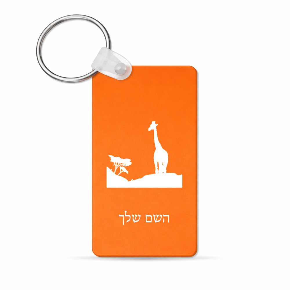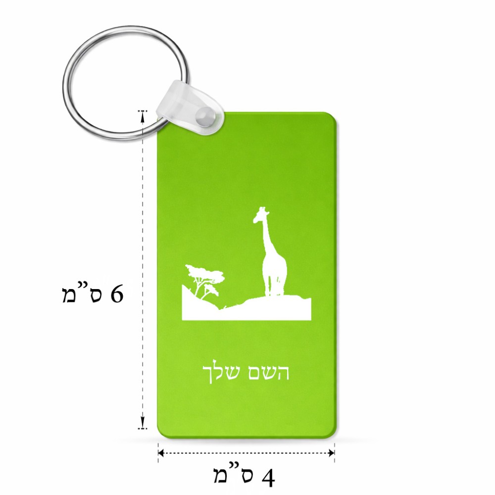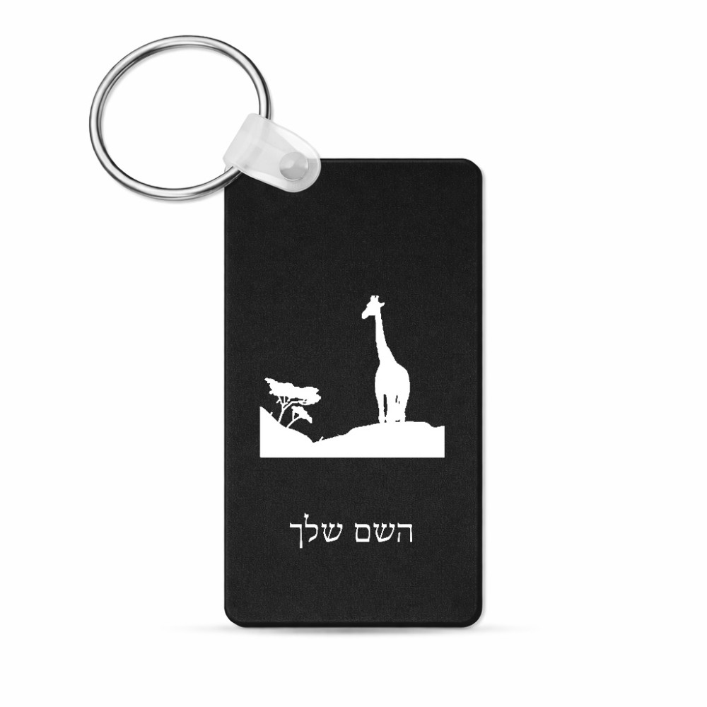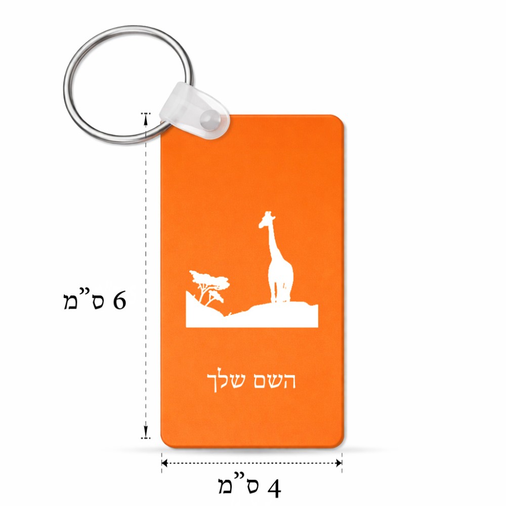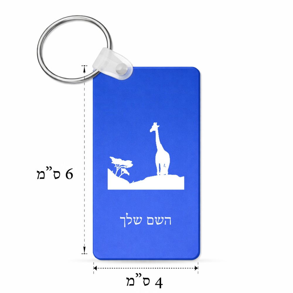 מחזיק מפתחות בצורת מלבן בעיצוב אישי עם השם שלך בעיצוב ג'ירפה באפריקה גודל המחזיק 6 × 4 ס"מ. את השם המבוקש ניתן לציין בהזמנה, אם לא צויין אנחנו ניצור קשר לבירור.