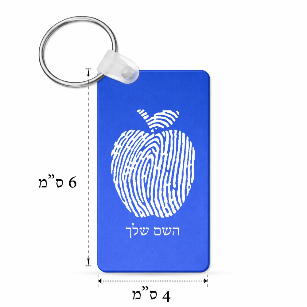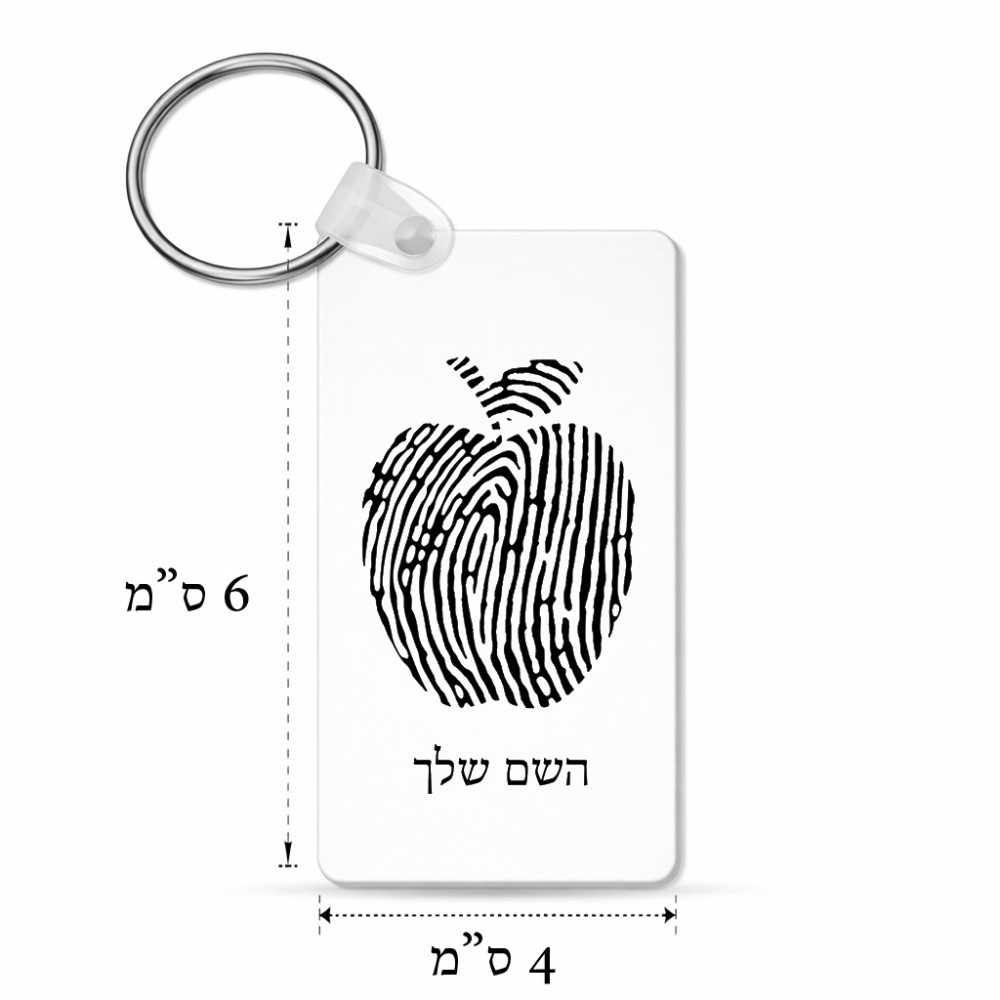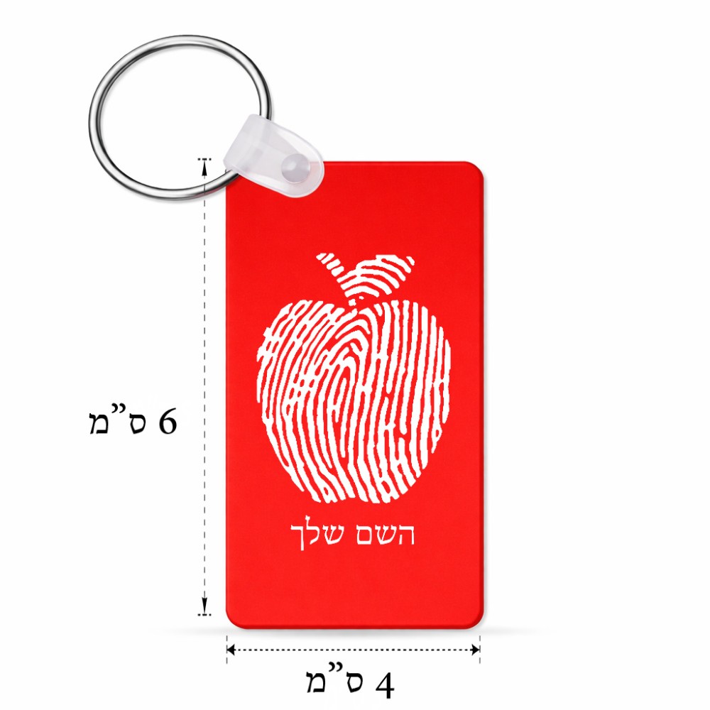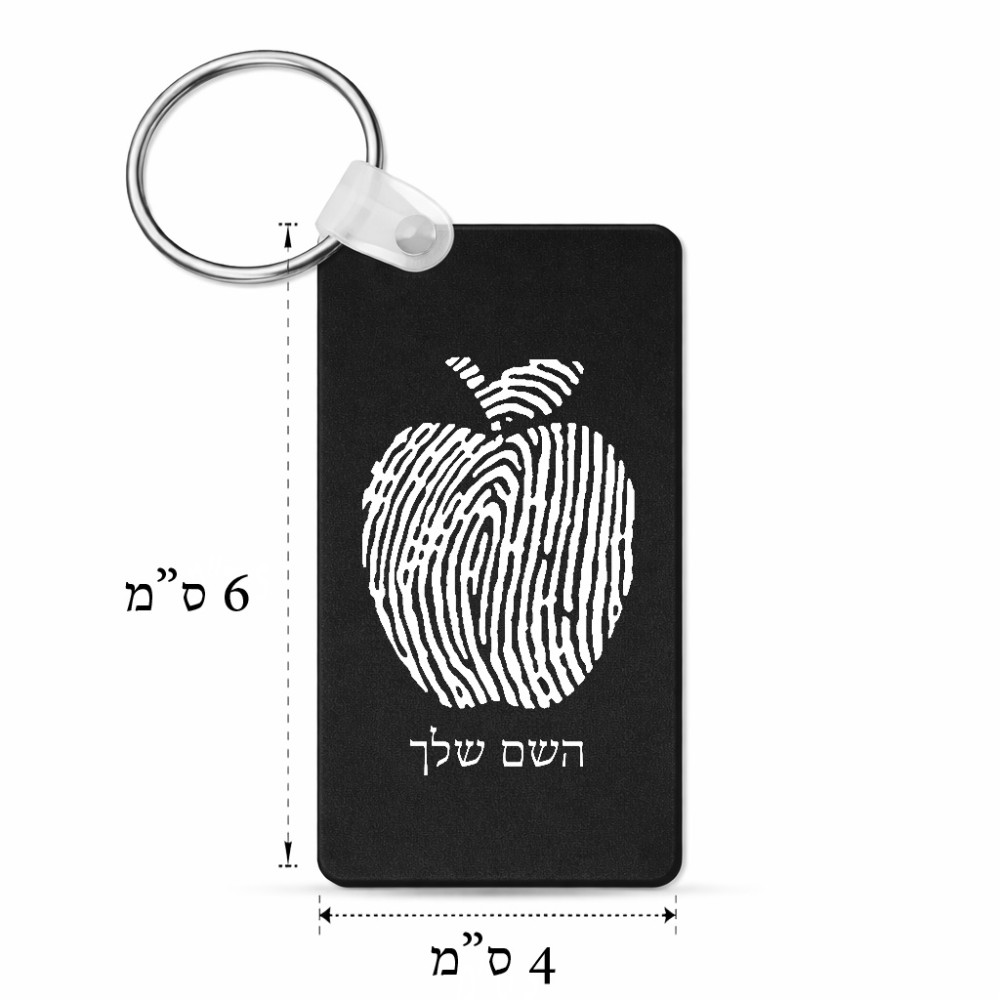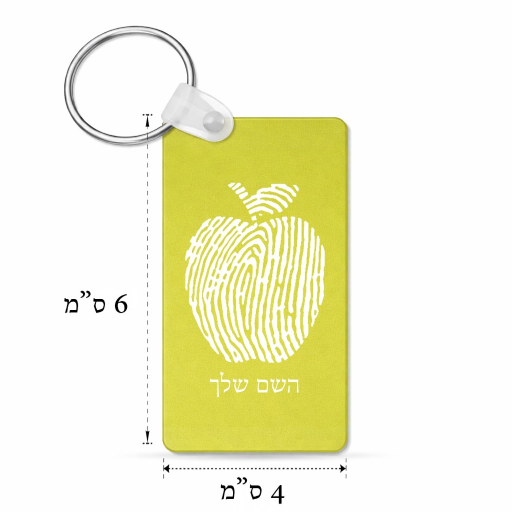 מחזיק מפתחות בצורת מלבן בעיצוב אישי עם השם שלך בעיצוב הדפס תפוח גודל המחזיק 6 × 4 ס"מ. את השם המבוקש ניתן לציין בהזמנה, אם לא צויין אנחנו ניצור קשר לבירור.