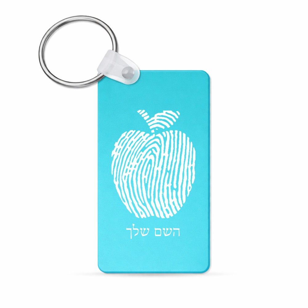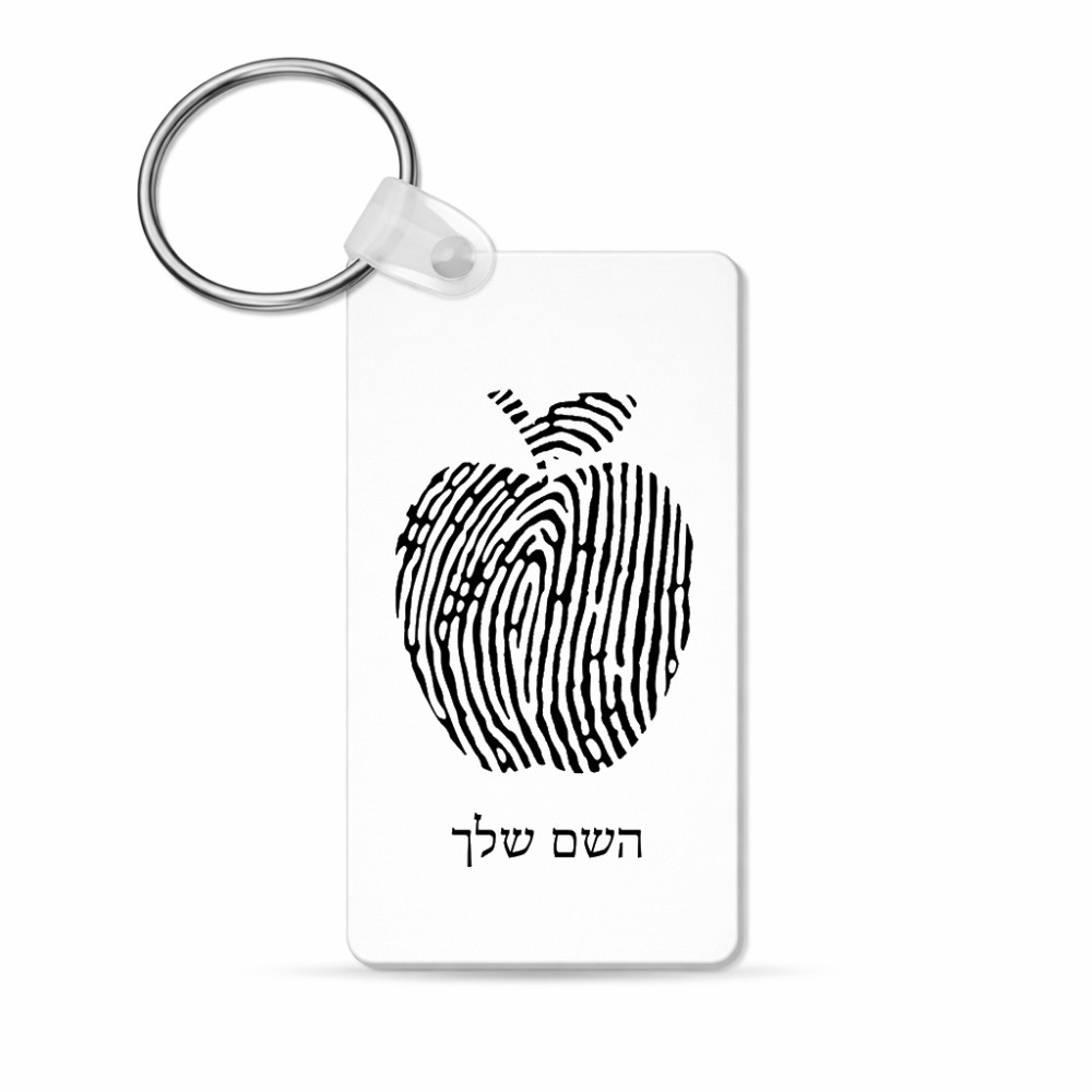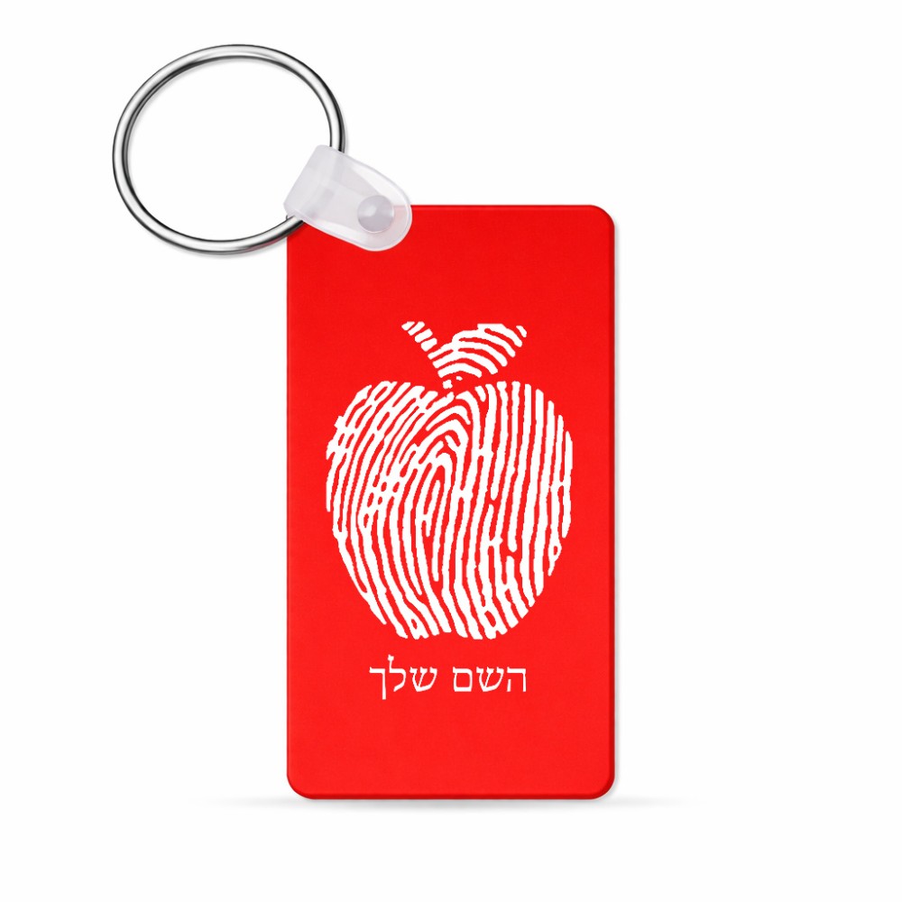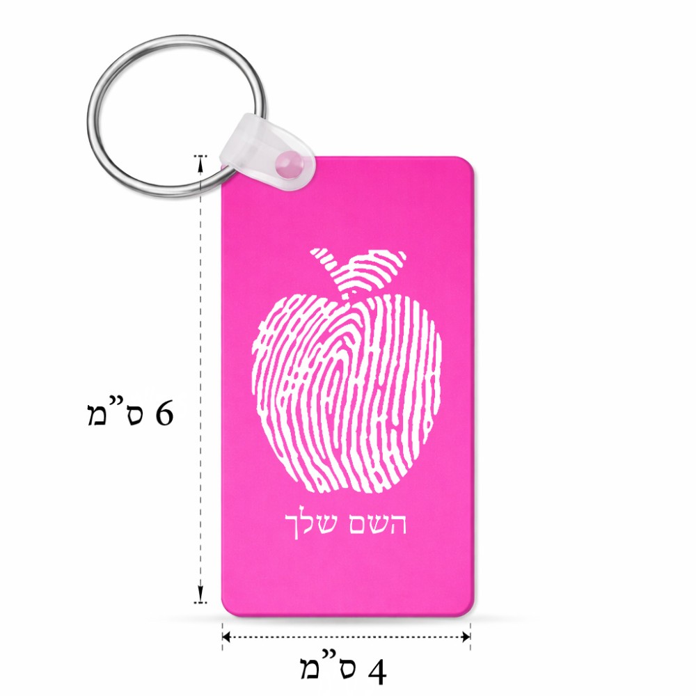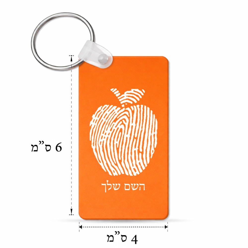 מחזיק מפתחות בצורת מלבן בעיצוב אישי עם השם שלך בעיצוב הדפס תפוח גודל המחזיק 6 × 4 ס"מ. את השם המבוקש ניתן לציין בהזמנה, אם לא צויין אנחנו ניצור קשר לבירור.