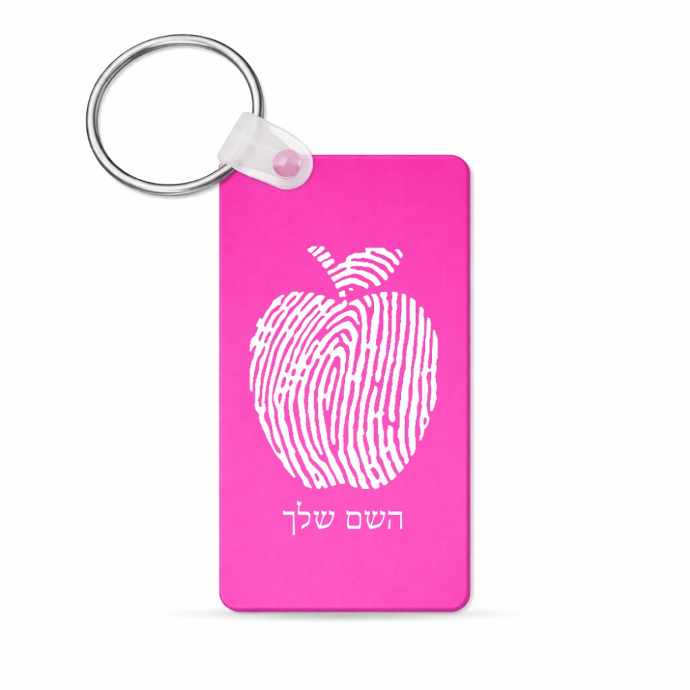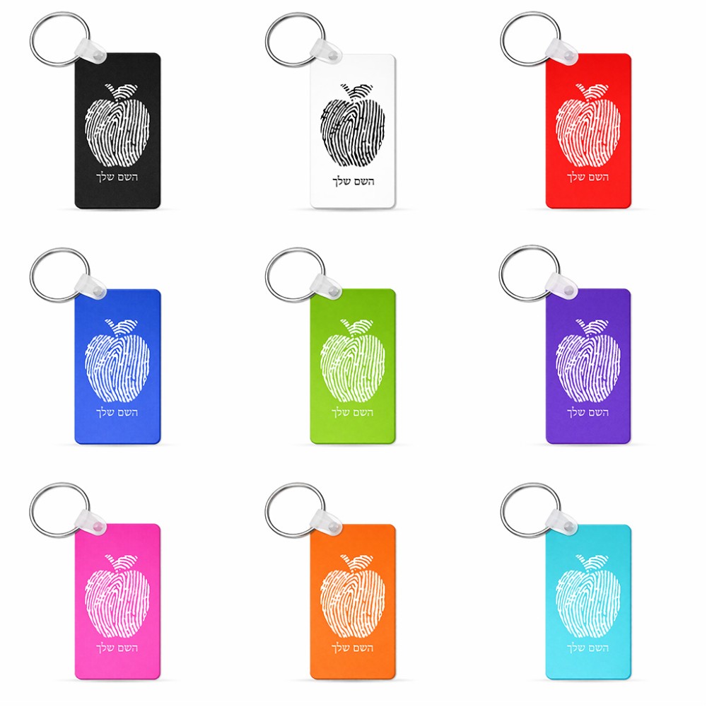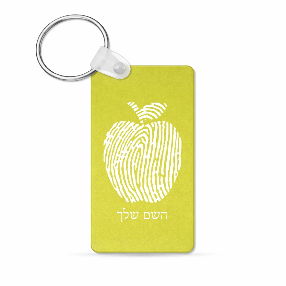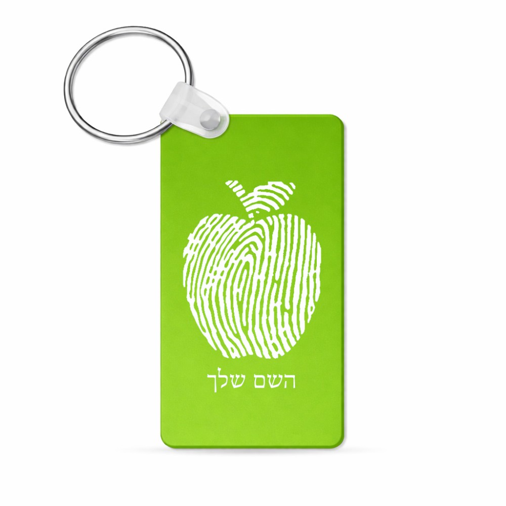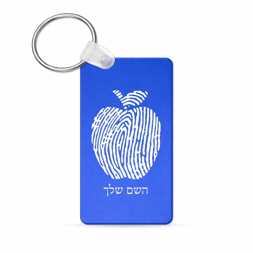 מחזיק מפתחות בצורת מלבן בעיצוב אישי עם השם שלך בעיצוב הדפס תפוח גודל המחזיק 6 × 4 ס"מ. את השם המבוקש ניתן לציין בהזמנה, אם לא צויין אנחנו ניצור קשר לבירור.