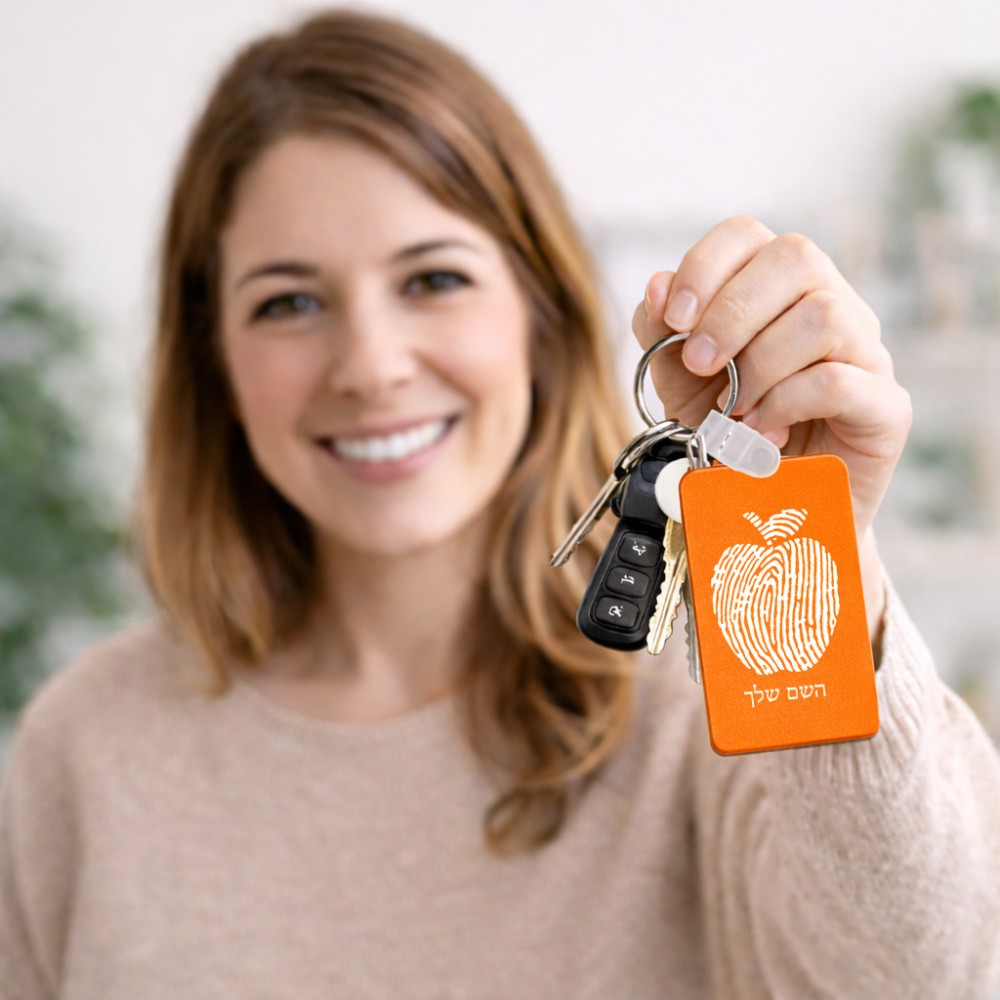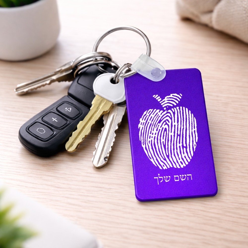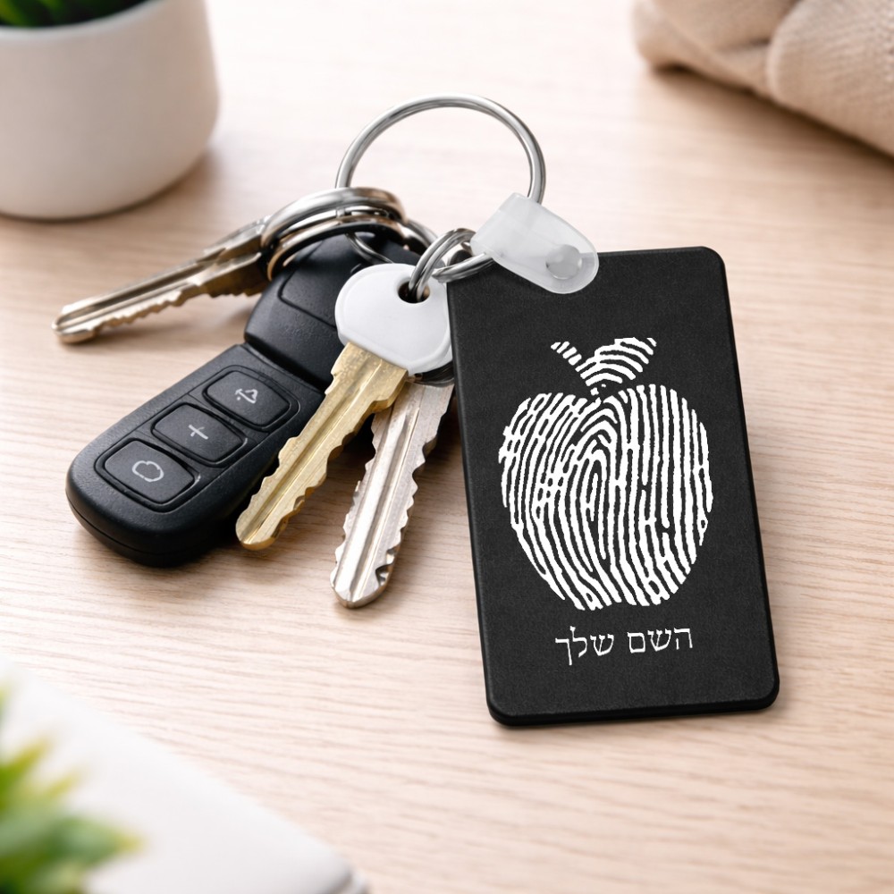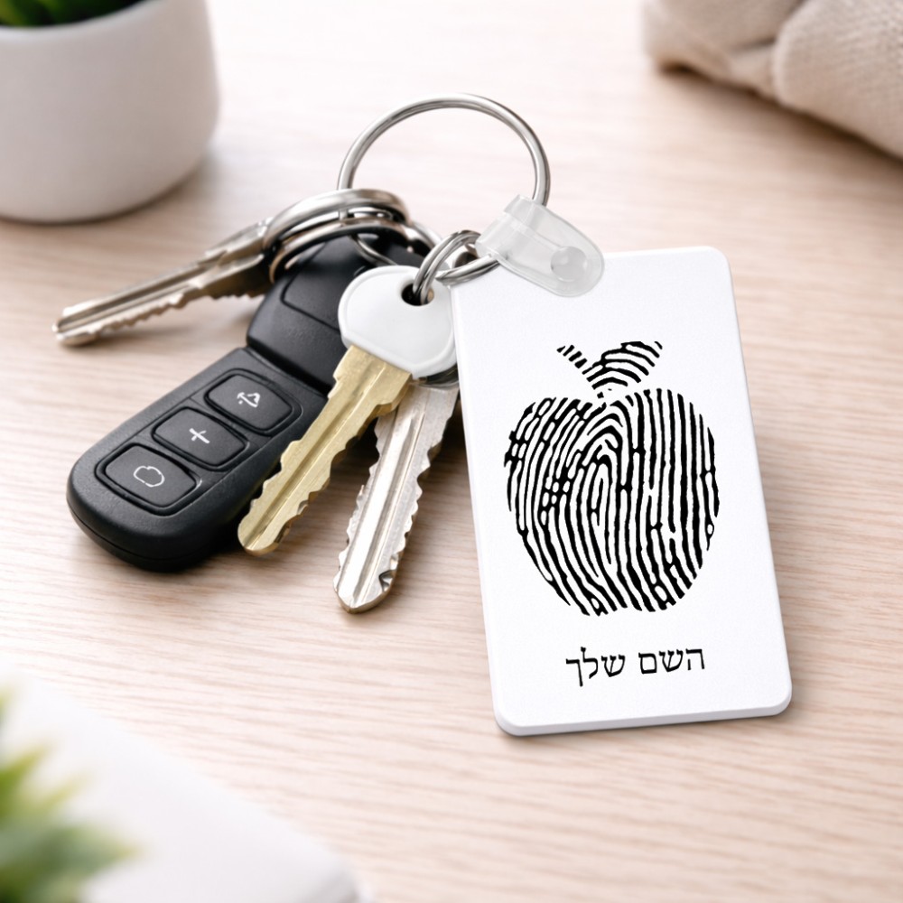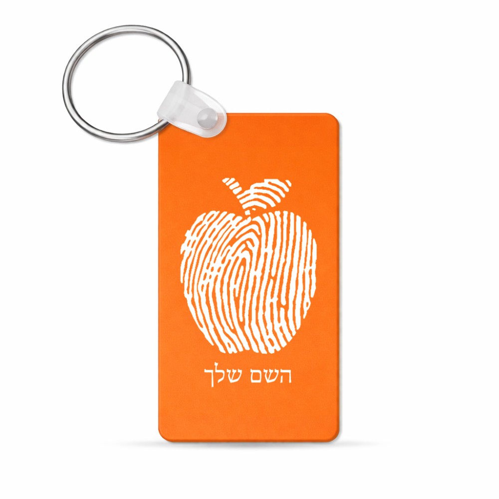 מחזיק מפתחות בצורת מלבן בעיצוב אישי עם השם שלך בעיצוב הדפס תפוח גודל המחזיק 6 × 4 ס"מ. את השם המבוקש ניתן לציין בהזמנה, אם לא צויין אנחנו ניצור קשר לבירור.